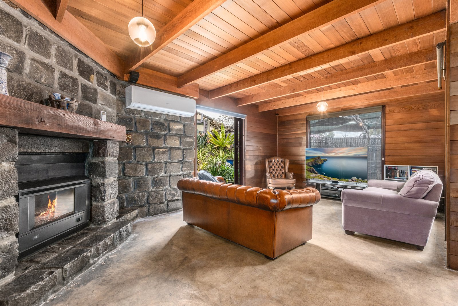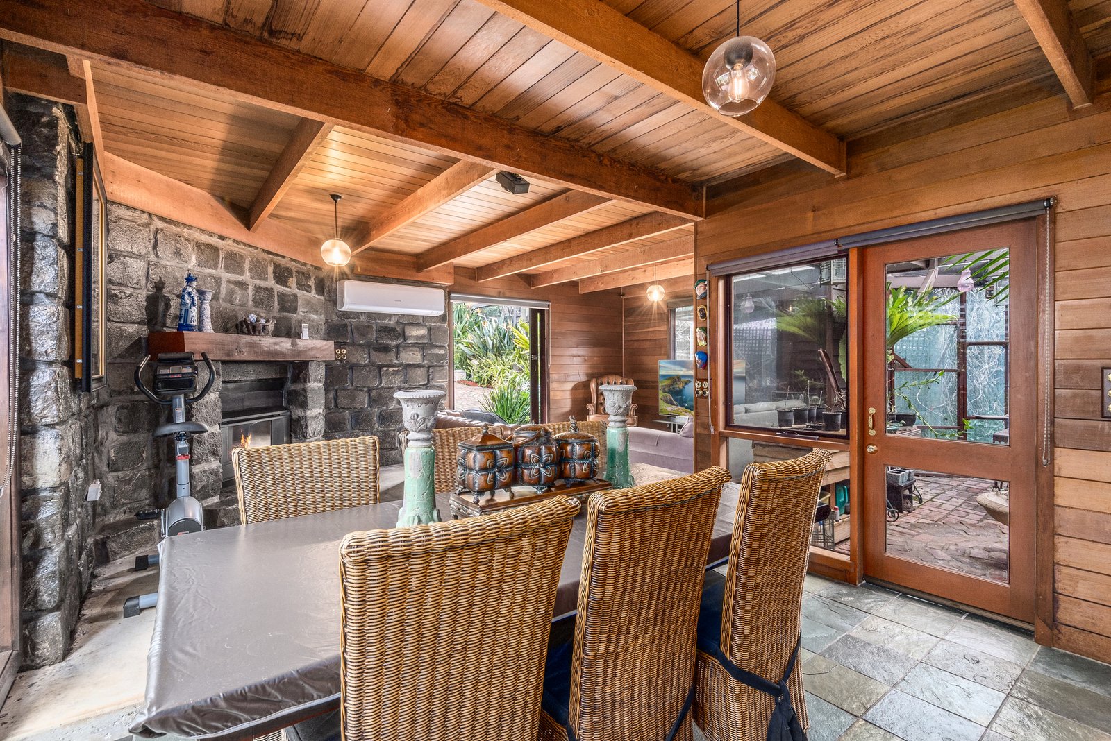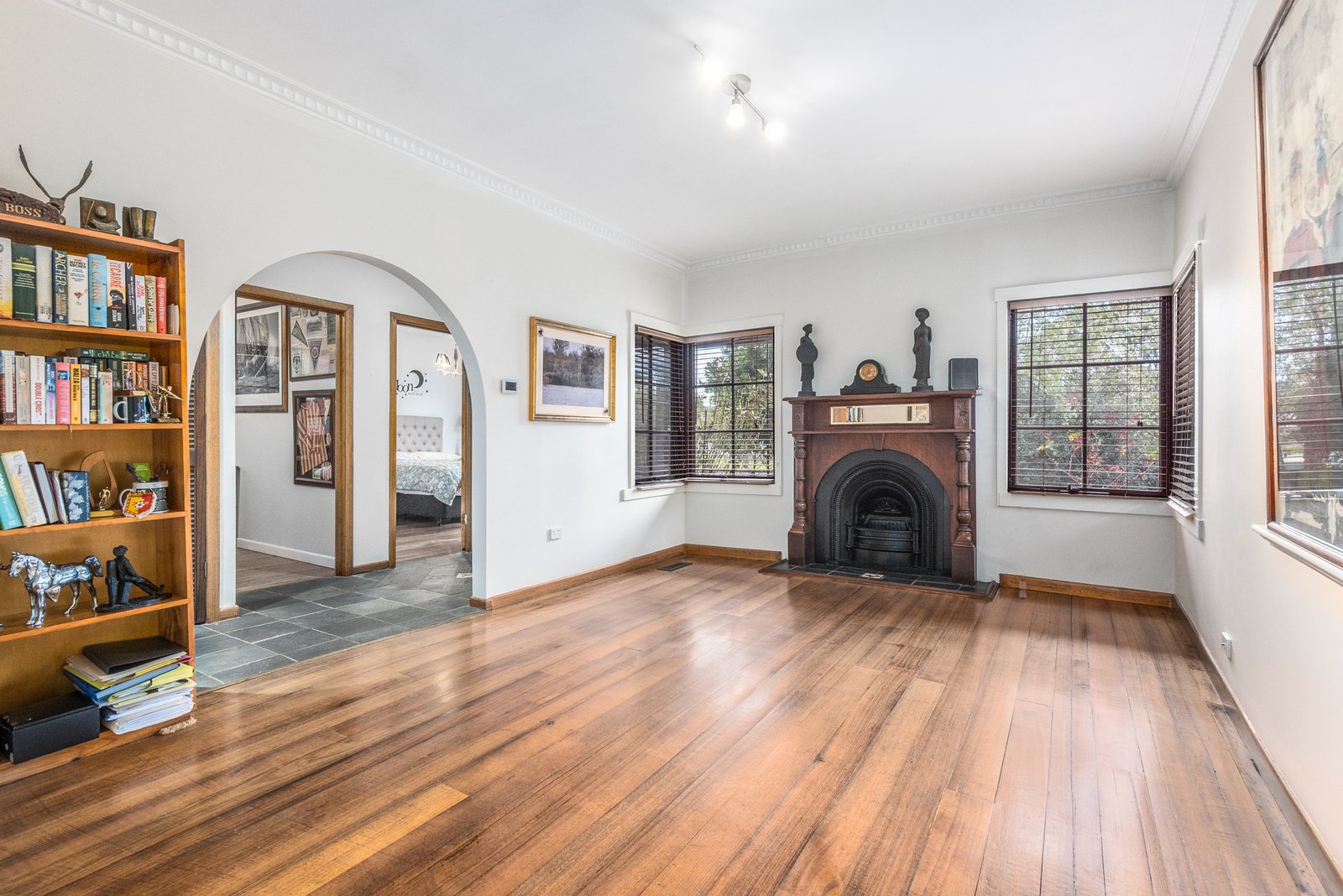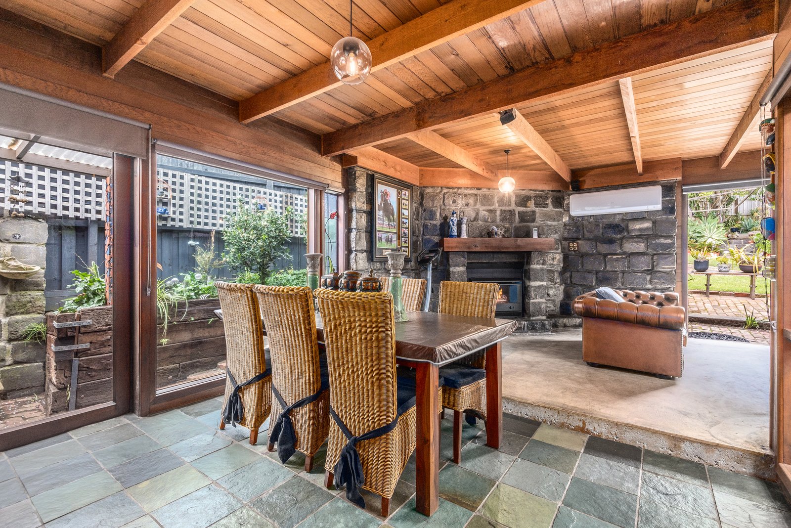 A beautiful bluestone fence and established gardens create a private setting for the classic triple-fronted home. Off the entry, a light-filled formal lounge features polished timber floors and a timber mantel with ornate fireplace, offering a sophisticated room to retreat. The adjoining kitchen features timber-lined ceilings, a skylight for additional natural light, quality appliances including Smeg 600mm oven and cooktop, Fisher and Paykel dishwasher, generous storage, and a servery window to the dining area for fantastic functionality. The open plan dining and living area at the rear showcases a bluestone feature wall, exposed beams, elegant pendant lighting and a gas log fire, providing an ambient space to entertain. Large glass sliders create an effortless connection with the outdoors, offering tranquil outlooks to the surrounding gardens.