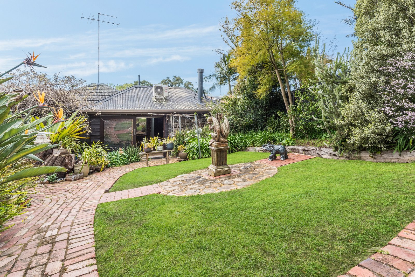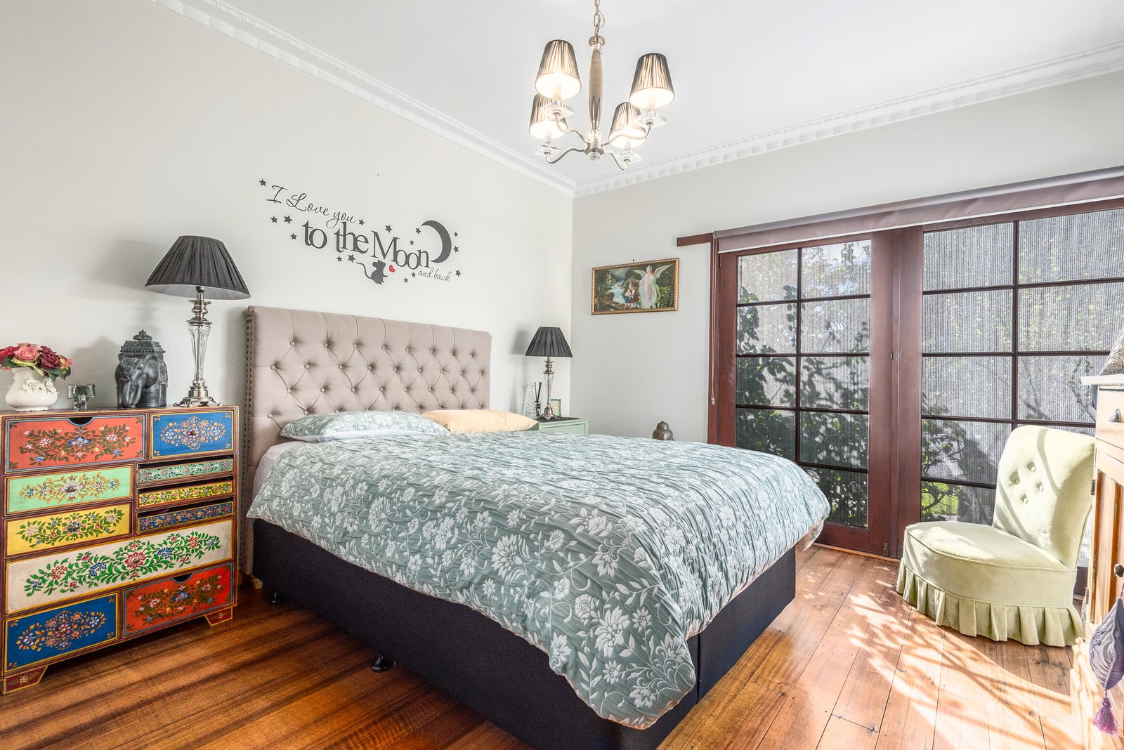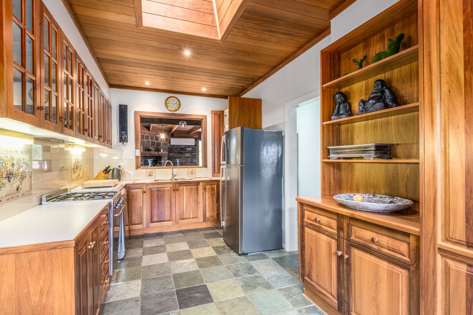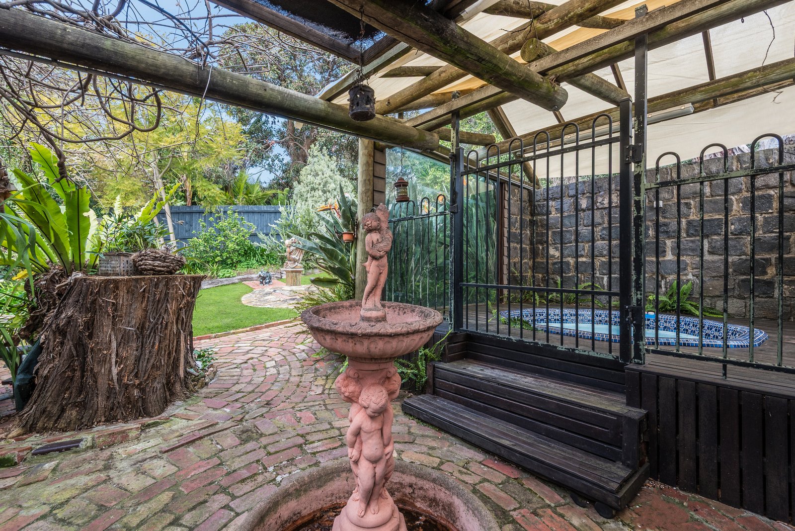 A beautiful bluestone fence and established gardens create a private setting for the classic triple-fronted home. Off the entry, a light-filled formal lounge features polished timber floors and a timber mantel with ornate fireplace, offering a sophisticated room to retreat. The adjoining kitchen features timber-lined ceilings, a skylight for additional natural light, quality appliances including Smeg 600mm oven and cooktop, Fisher and Paykel dishwasher, generous storage, and a servery window to the dining area for fantastic functionality. The open plan dining and living area at the rear showcases a bluestone feature wall, exposed beams, elegant pendant lighting and a gas log fire, providing an ambient space to entertain. Large glass sliders create an effortless connection with the outdoors, offering tranquil outlooks to the surrounding gardens.