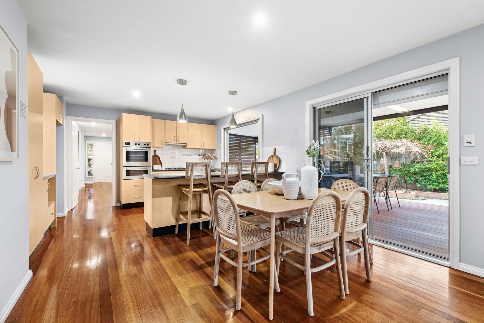 Rich timber floors add warmth through the social areas which comprise a formal...
