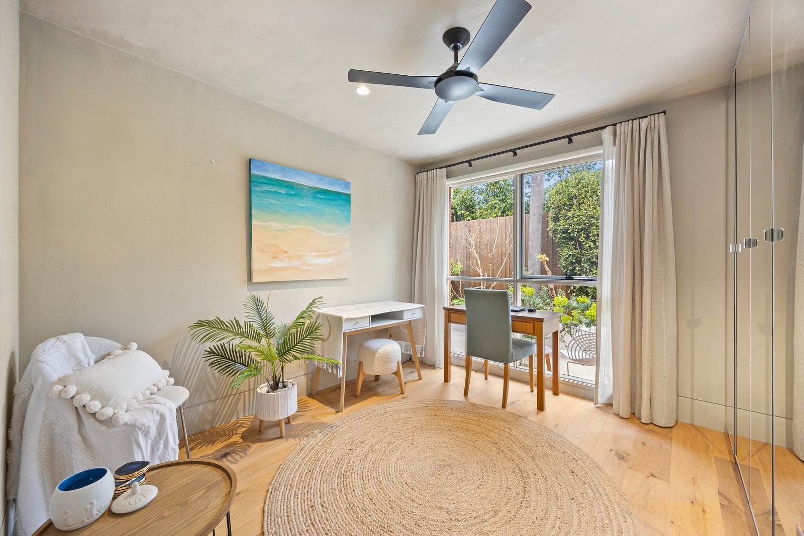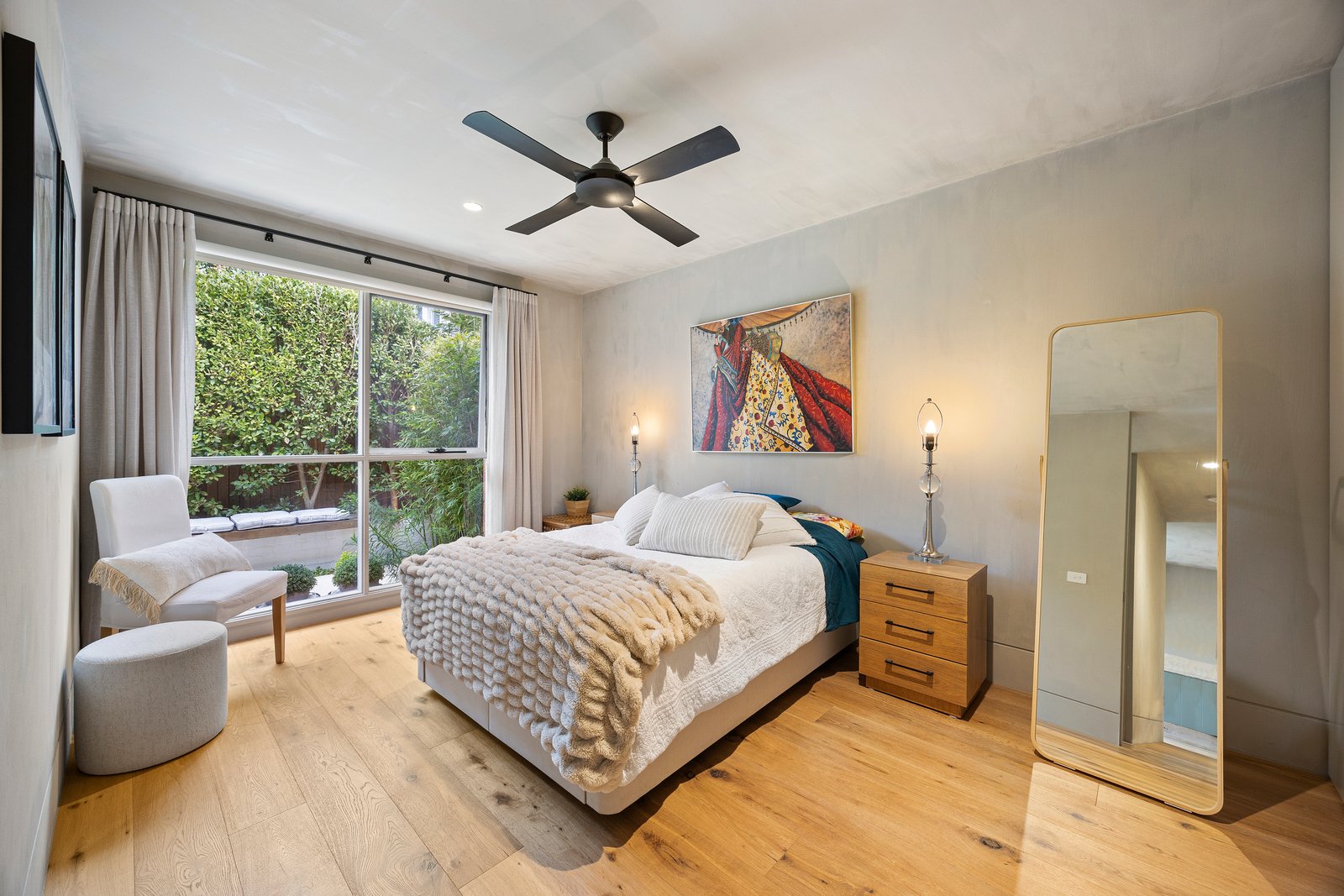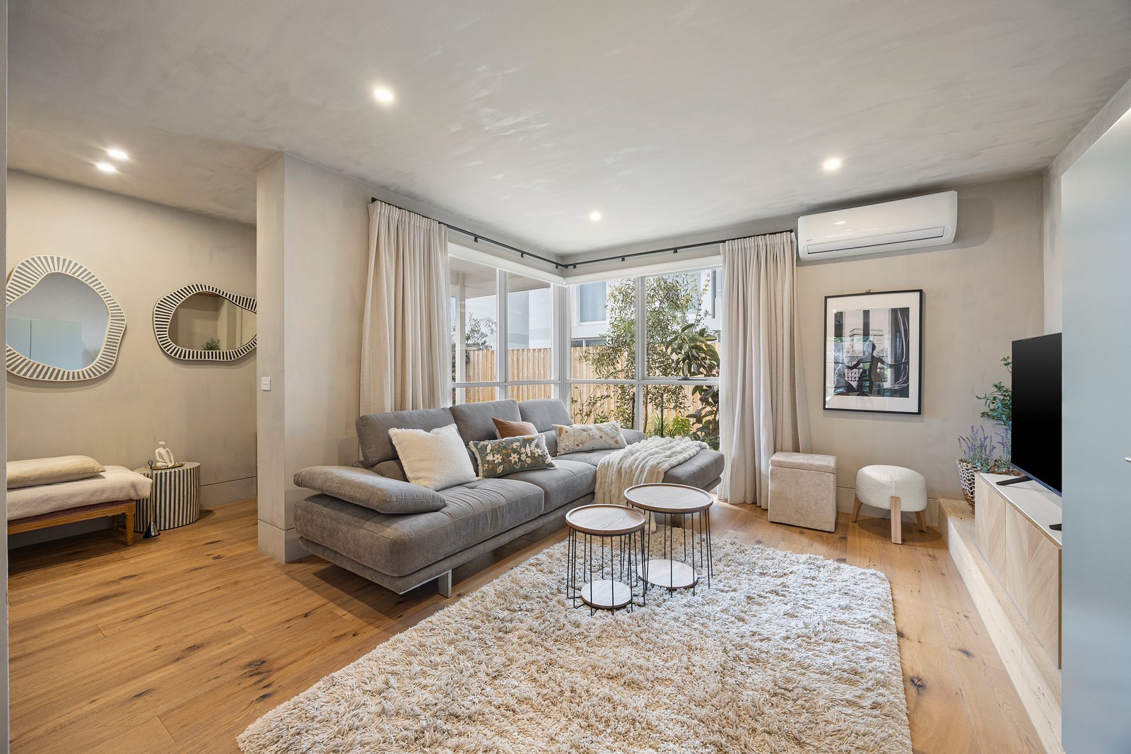 With a cool concrete-style artisan wall-finish as the backdrop to brushed chrome hardware and textural American Oak floors, the design is softened by airy sheer curtains on streamlined block-out blinds and enlightened by sparkling gimble lighting. Immensely practical with clever storage solutions for the fitted robes, European laundry and bespoke broom cupboard, this reverse-cycle air-conditioned home has additional fan-cooling for the bedrooms and a secure garage at the door.