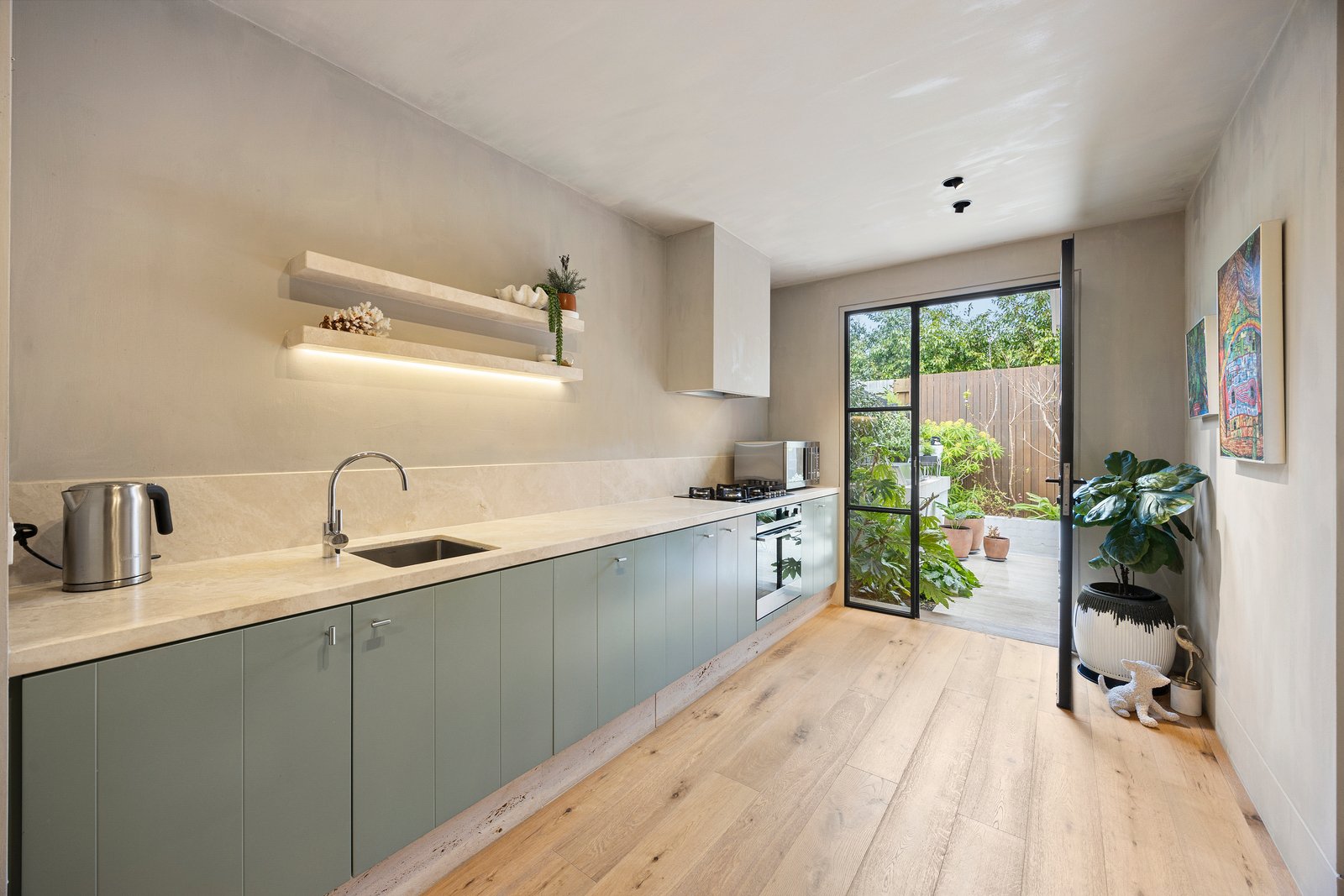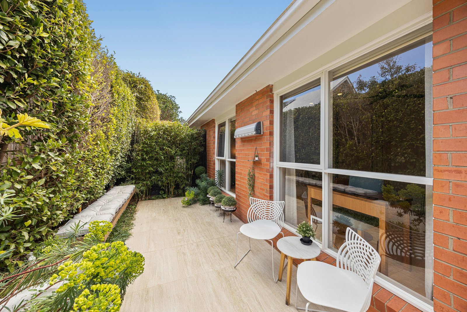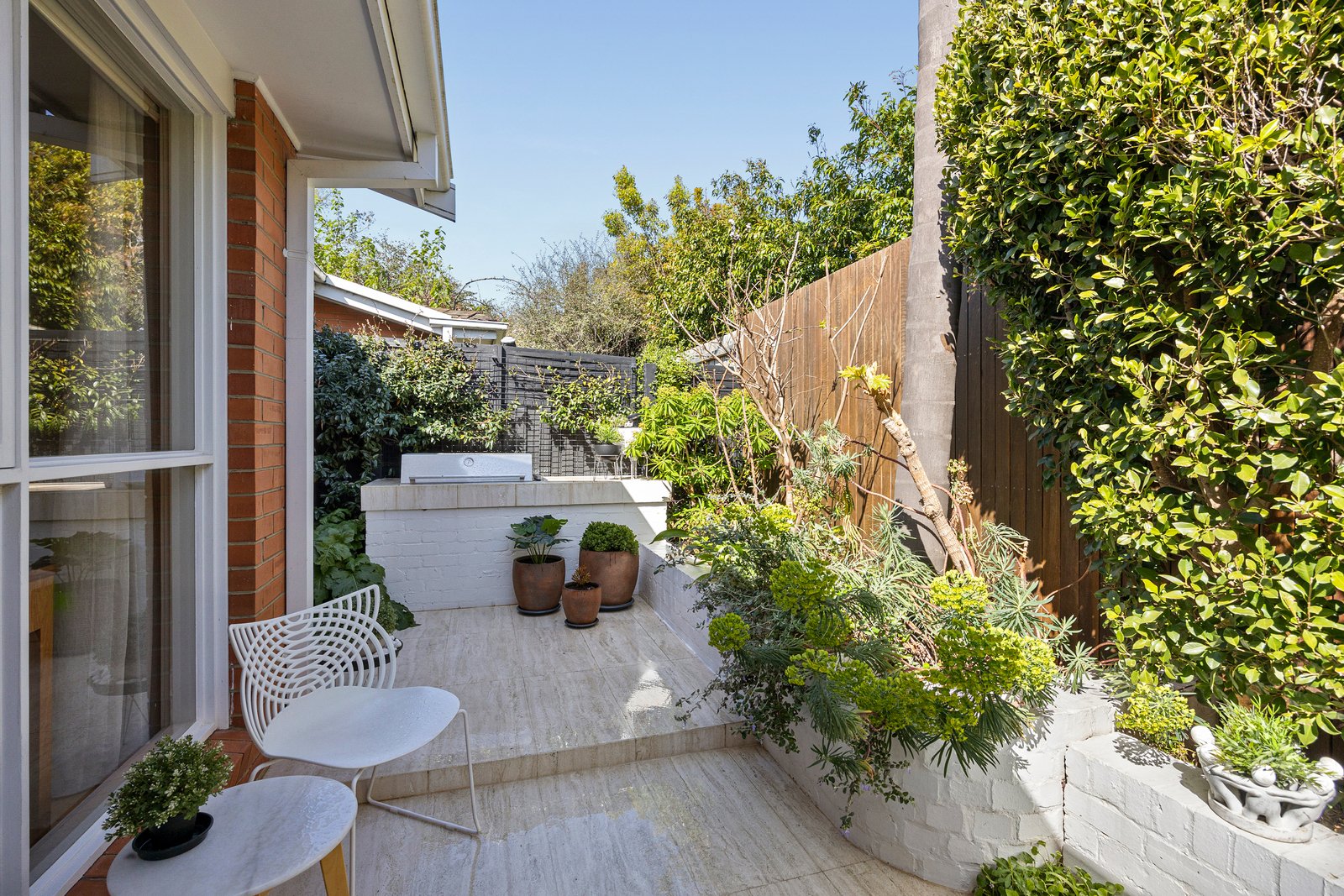 Follow the avenue of camellias down this long drive and find your style sanctuary at an iconic Hampton Hill address. Innovatively re-imagined by the awarded landscape architect behind Plume Studio, this two-bedroom mid-century unit is a hidden architectural gem flowing seamlessly from a northerly window-walled living zone, to dining alongside a cutting-edge kitchen ...and on to a state-of-the-art al fresco entertainers’ oasis in a travertine-paved paradise – complete with BBQ bench, fitted seating and expertly planned exotic plantings.