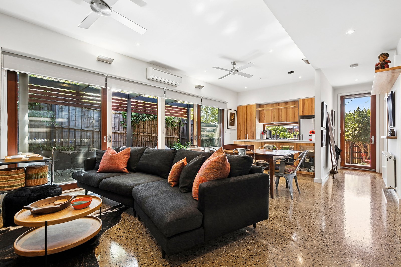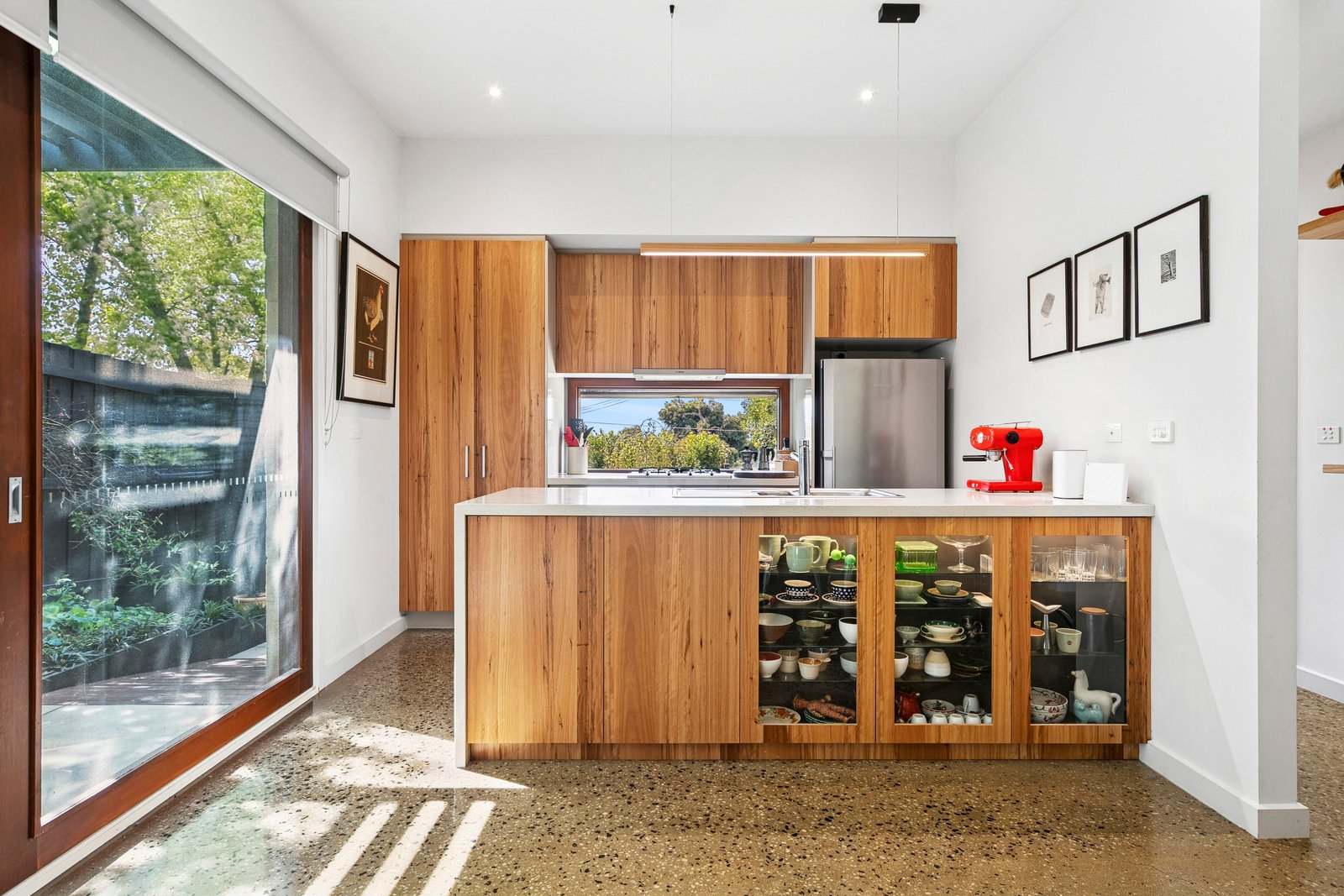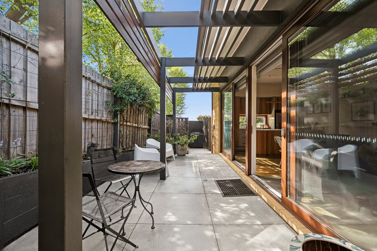 Set at the front of a boutique group of three, the property enjoys a private front yard and striking street appeal. Designed for year-round enjoyment, the north-facing alfresco connects seamlessly to the sun-drenched open-plan living and dining area, creating a welcoming space for everyday living and entertaining. The beautifully renovated kitchen impresses with stone benchtops including a large island bench, a gas cooktop, new oven and taps, quality appliances, and excellent storage.