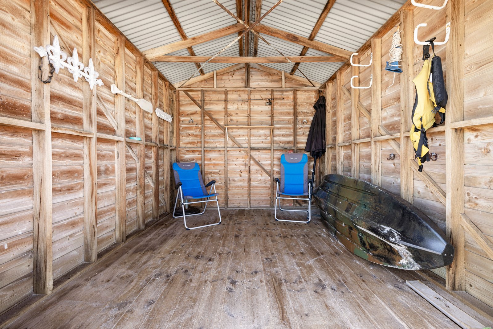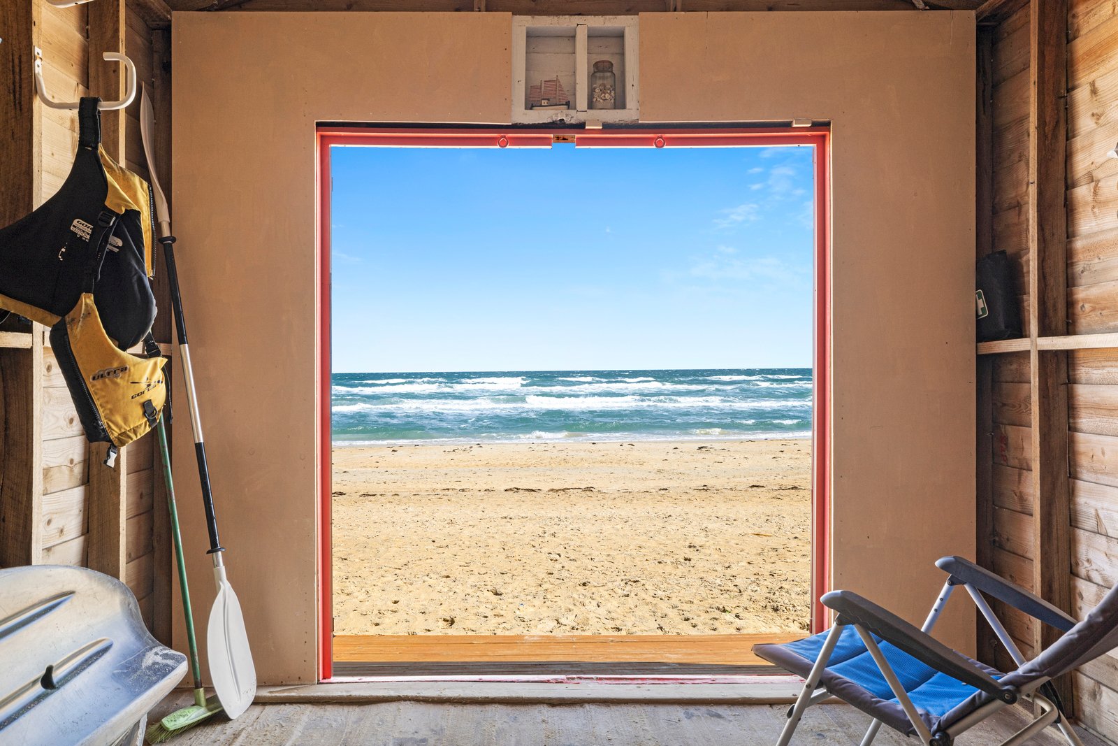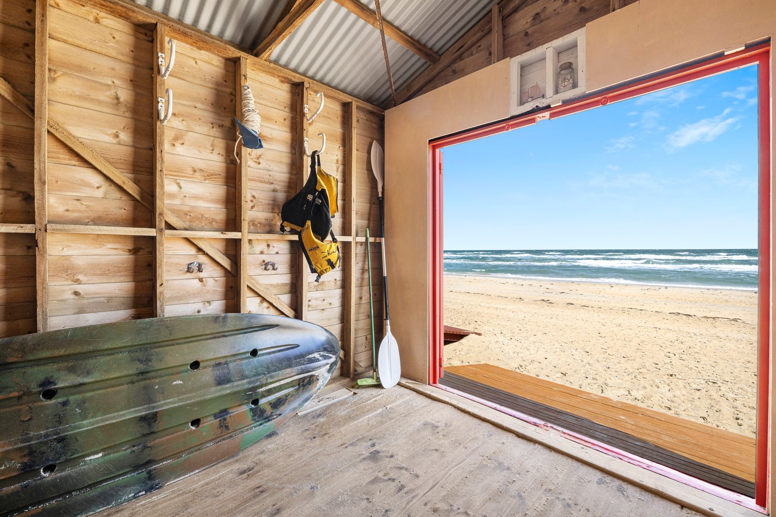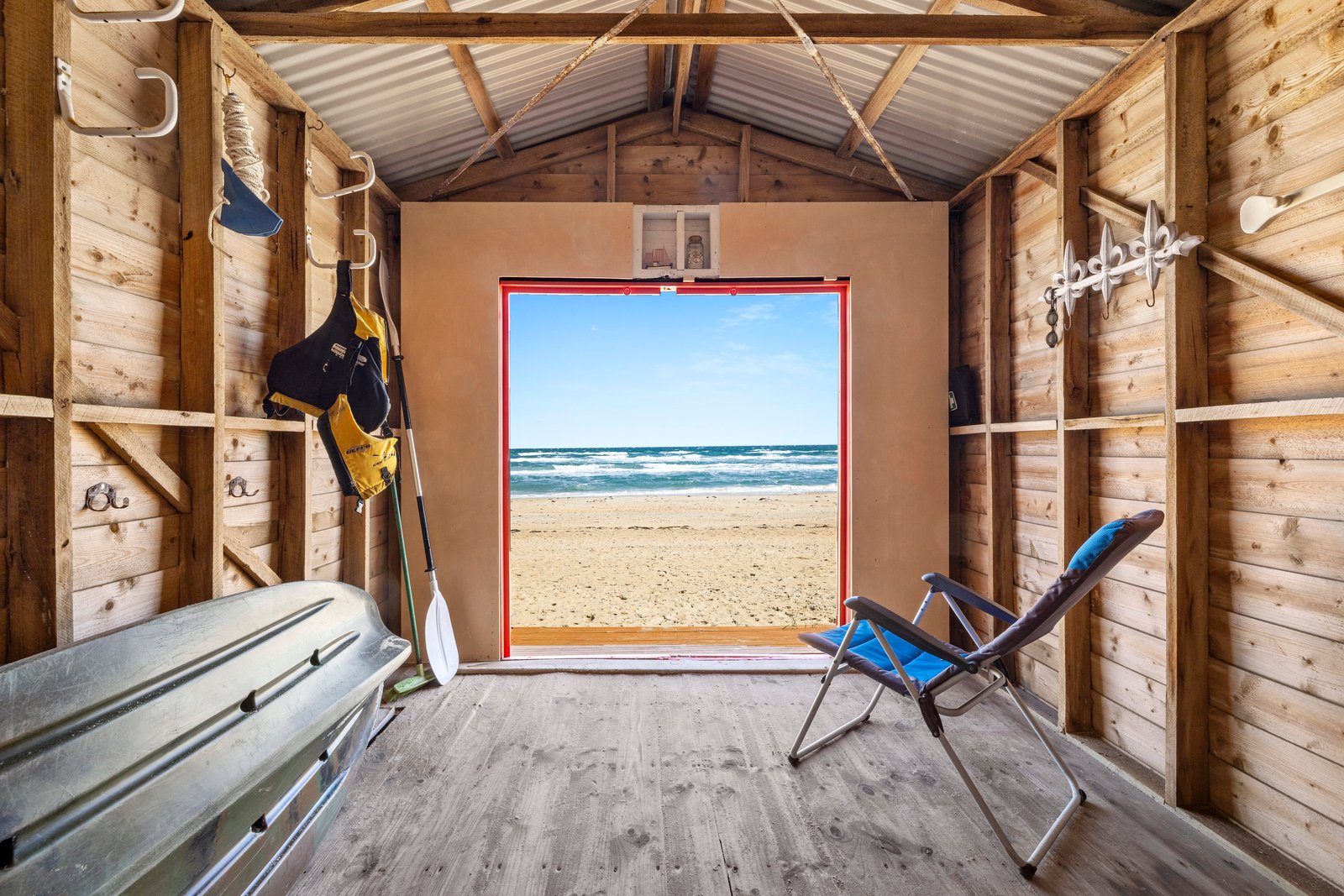 Step inside to discover a surprisingly spacious and well-kept interior, complete with timber walls, hanging space for your beach essentials, and plenty of room to relax or gear up for your next paddle. The oversized entrance doors frame an uninterrupted view of the ocean, allowing sea breezes and sunshine to pour in while you unwind in your deck chair or prepare for a day on the water.