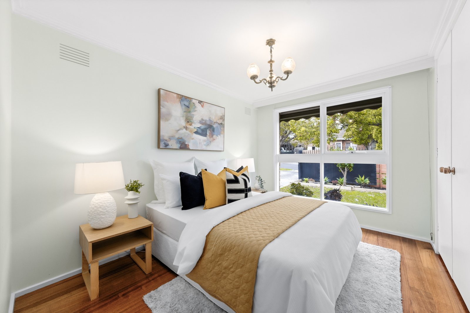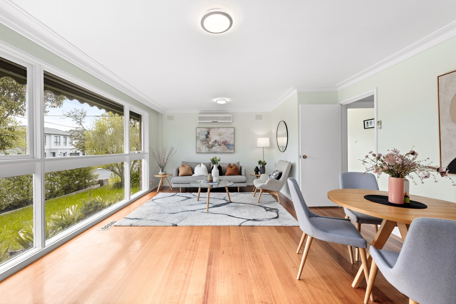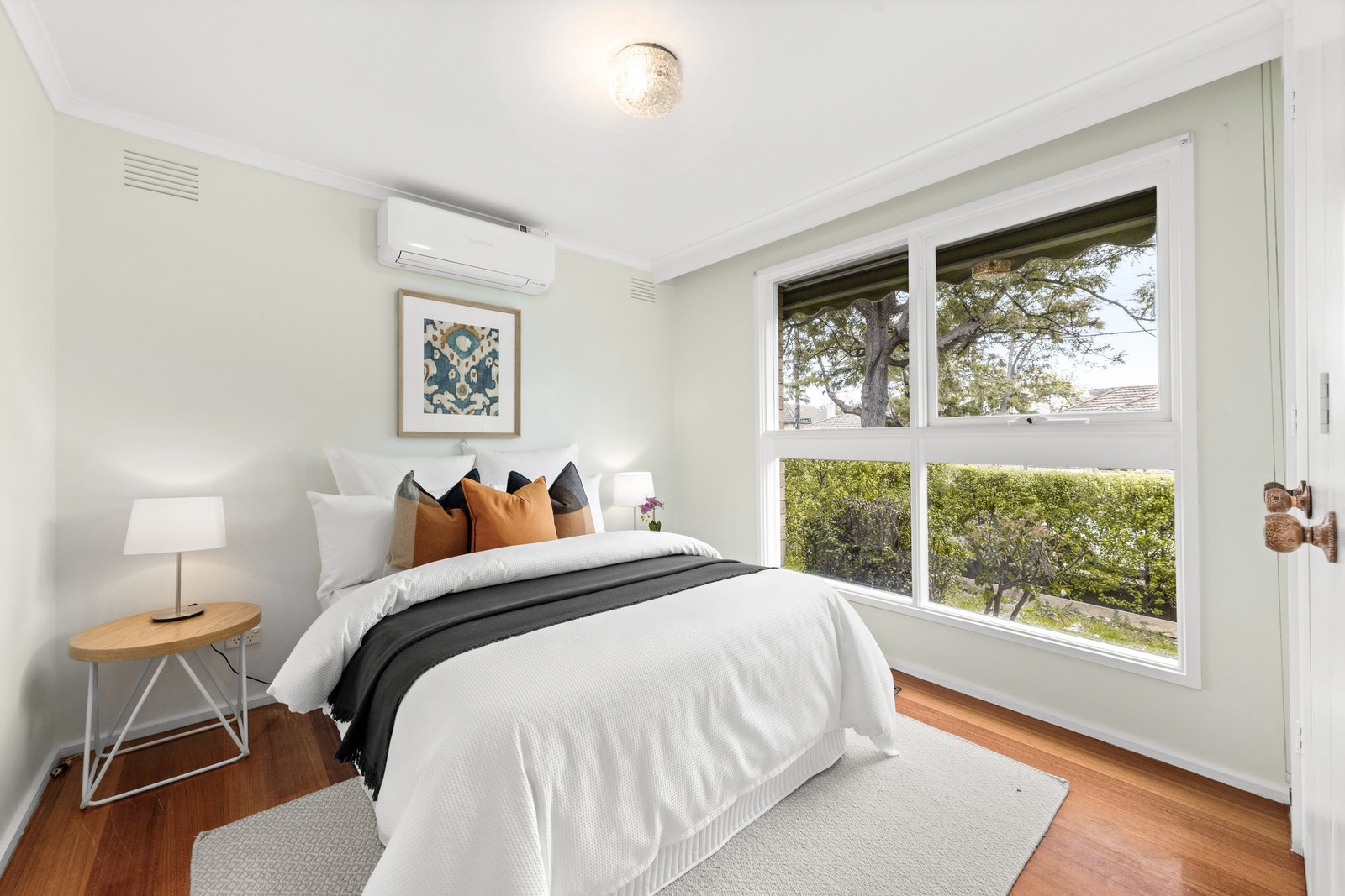 Three bedrooms (two with built-in robes) are serviced by a fully renovated bathroom and skylit powder room, while the generous living area provides a welcoming retreat. A modern kitchen and laundry open to the backyard, complemented by polished hardwood floors and two split-system air conditioners.