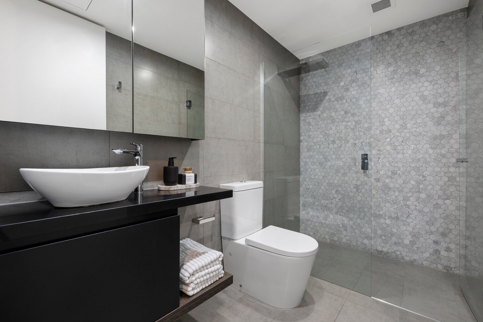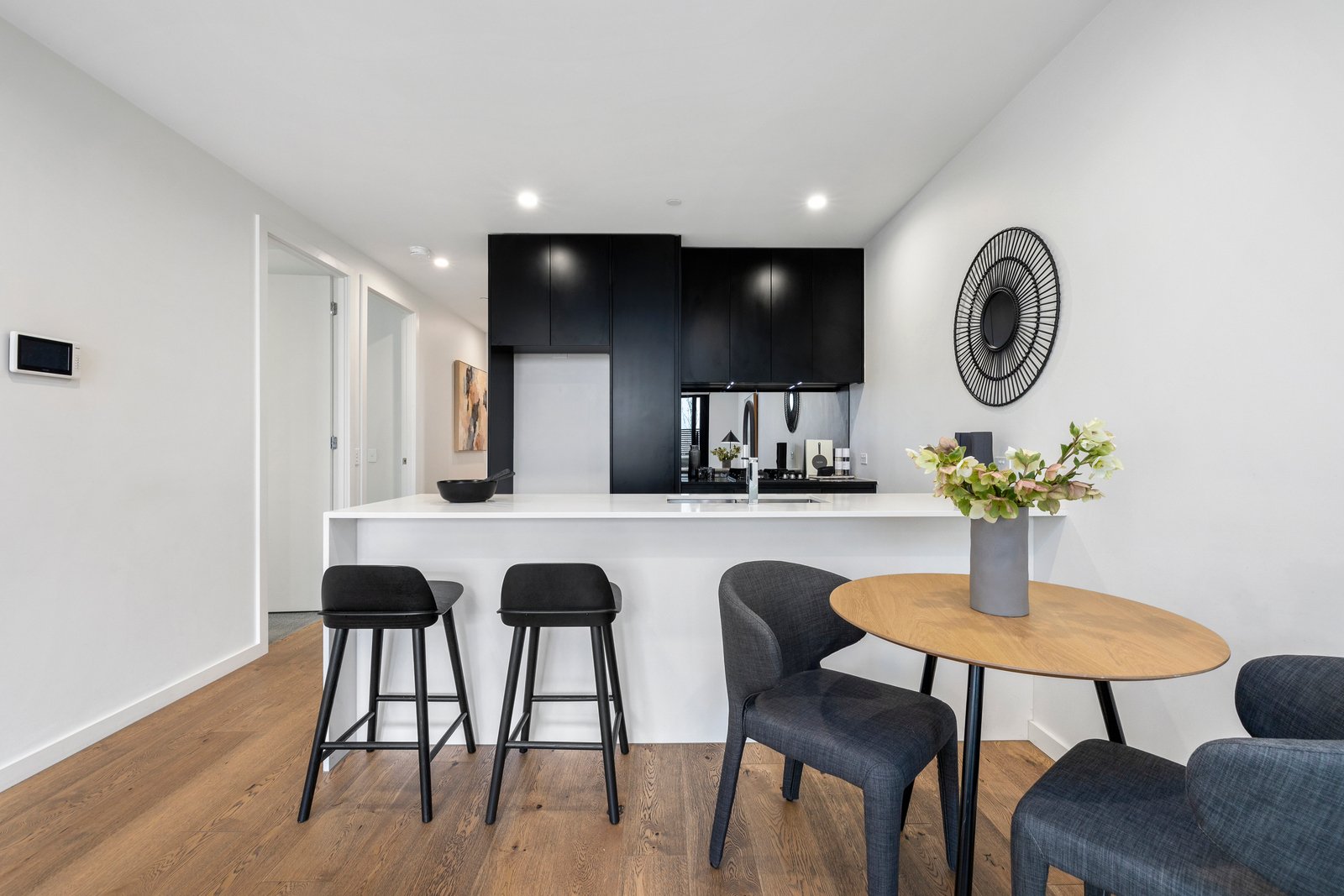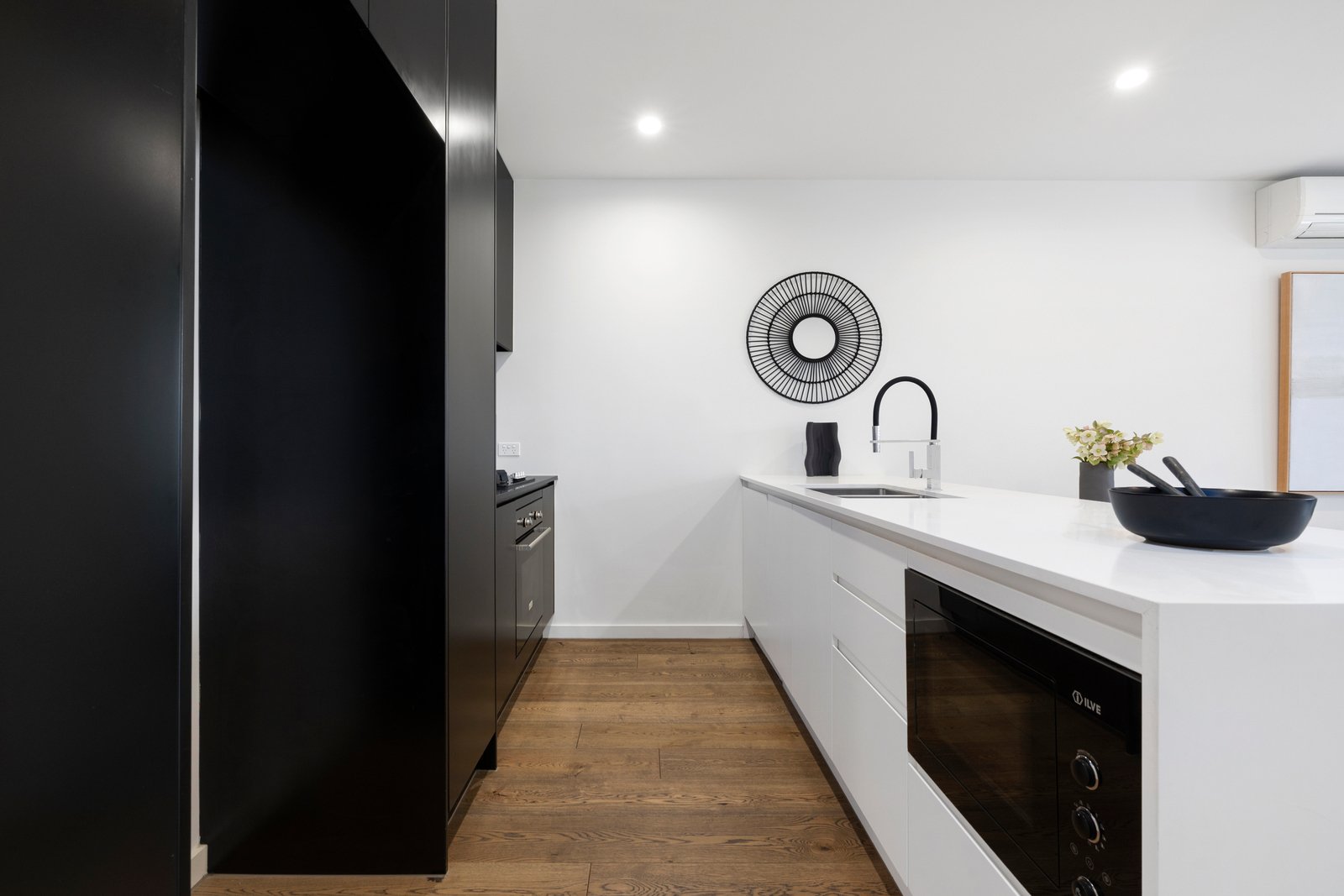 Desirably secure and easily accessible with a lift up to the home and down to the basement carpark, the layout features a distinct entrance hall creating separation from the light-filled living area. Offering a generous space for living and dining, this zone flows from the striking monochrome kitchen equipped with premium Ilve appliances and topped with stone. Here there is a relaxed breakfast bar for easy meals while outside, the alfresco balcony offers room to unwind in the in the fresh air and boasts a sunny northerly aspect.