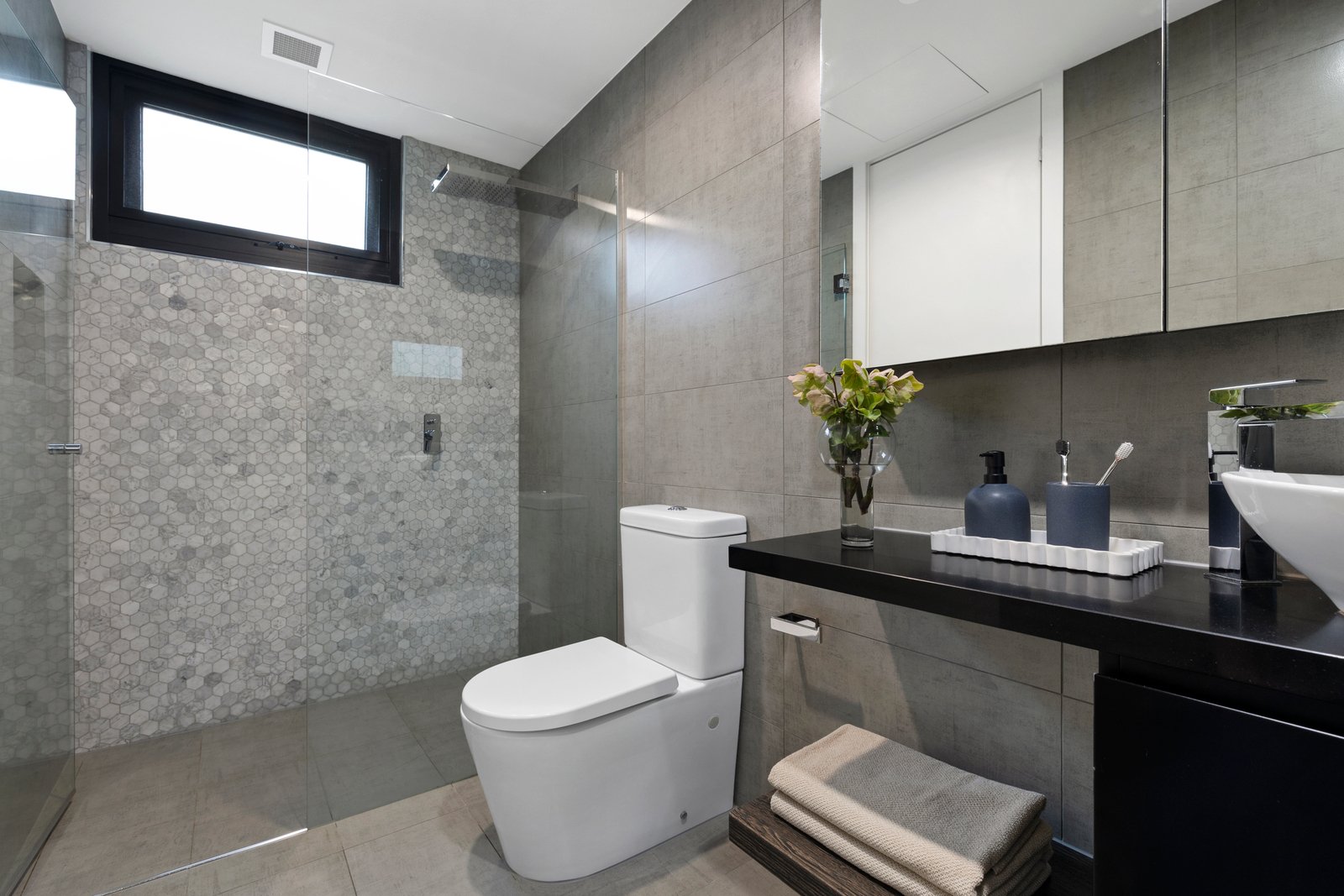 Each of the three bedrooms are true doubles which benefit from mirrored fitted wardrobes – they include a peaceful main boasting a luxe ensuite flaunting a stone-topped vanity, generous shower and chic hex marble feature tiles. The second bathroom is also finished to please, whilst the hidden Euro laundry exceeds expectations with a stone workbench and plenty of storage.