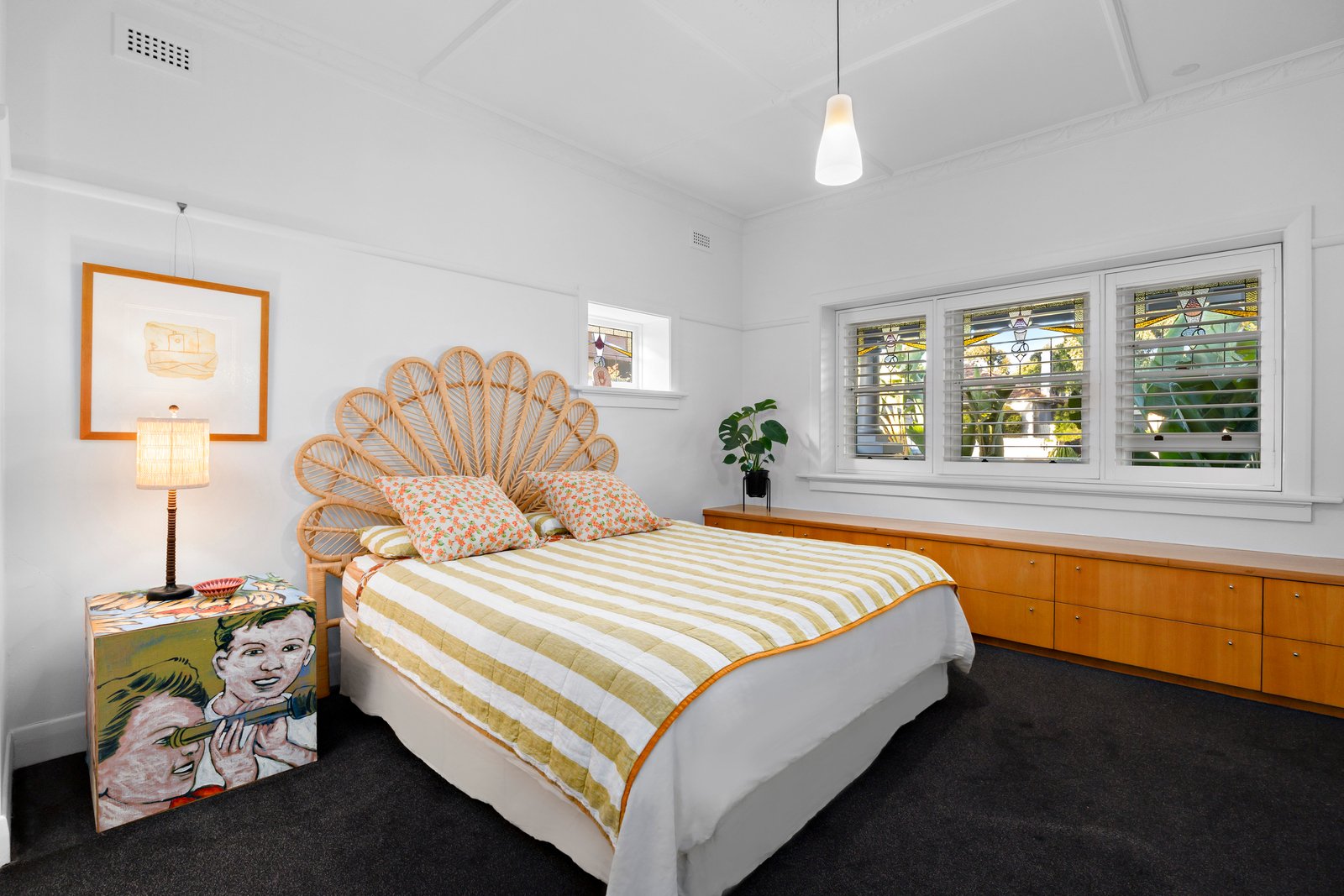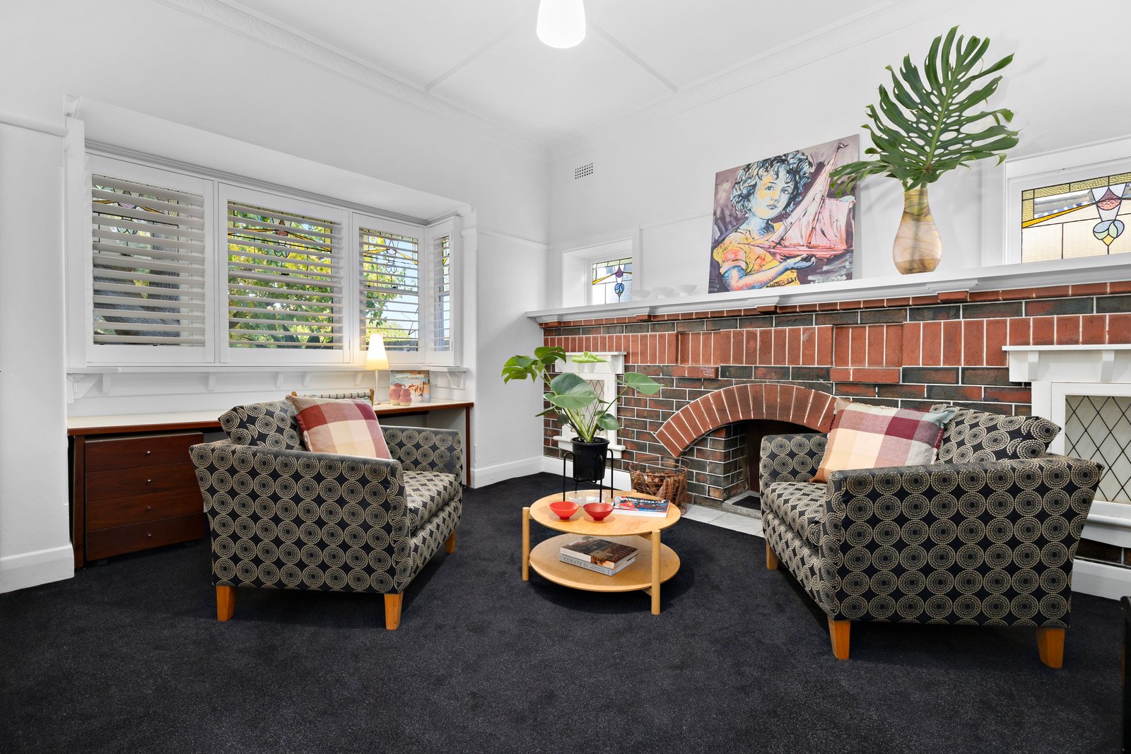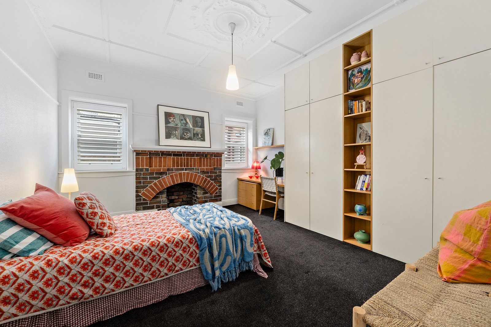 Behind its striking façade of stained glass and period columns, a wide hallway introduces the home’s original craftsmanship and timeless charm. Four generous bedrooms are enhanced with ornate plaster ceilings, built-in robes, custom desks and tuck-pointed fireplaces, while the main bedroom enjoys a beautiful feature window seat.