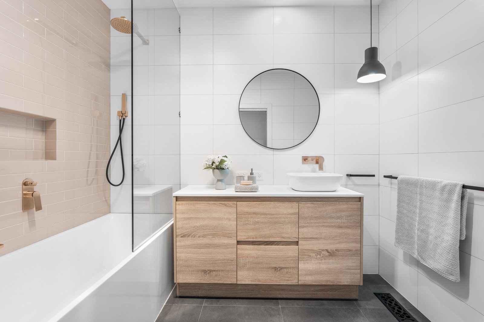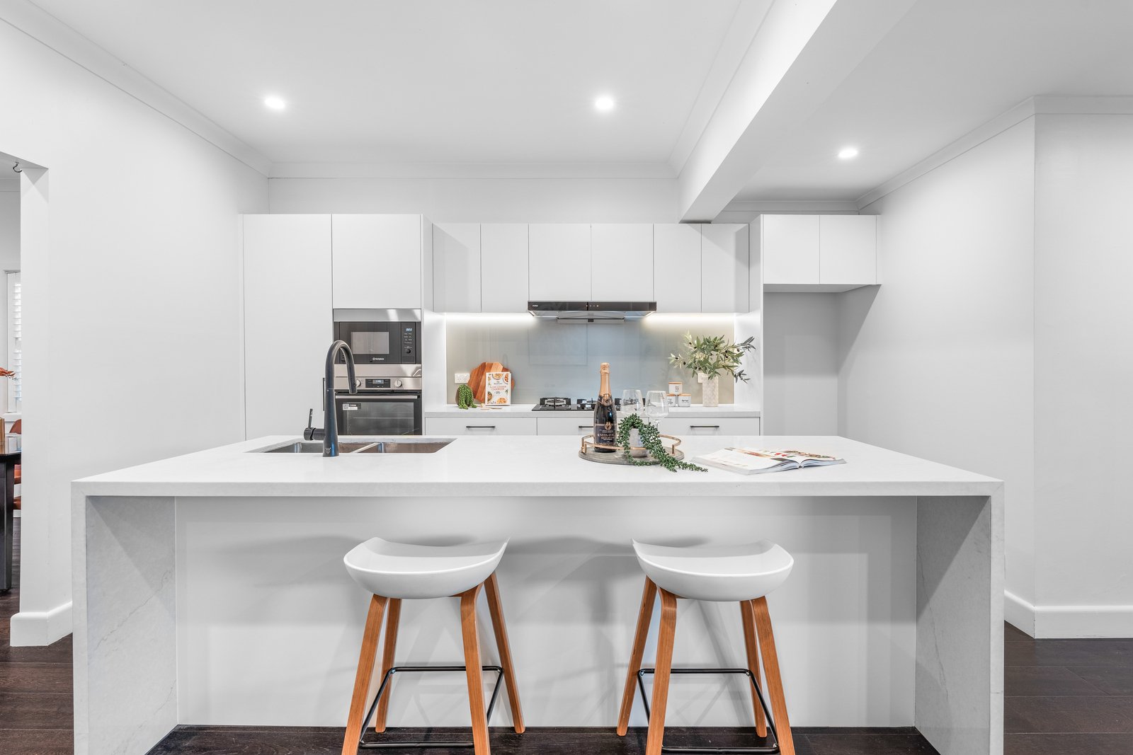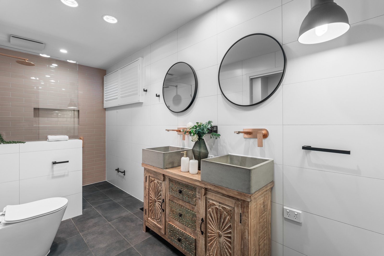 But the clever design doesn’t end there with kids zoned together around a designer bathroom, this family-wise design gives parents their own private space in a deep north-facing wing with its own 5 Star fully-tiled dual-vanity bathroom. Styled with a sleek stone-wrapped island-bench fronting an elite appliance kitchen (with Fotile high-capacity gas cooktop and rangehood), the home is bespoke detailed with a custom-vanity topped by concrete basins for the ensuite, a smart study-nook for second bedroom, and dark stained hardwood floors for easy living.