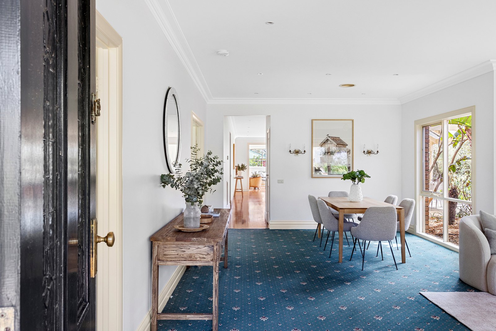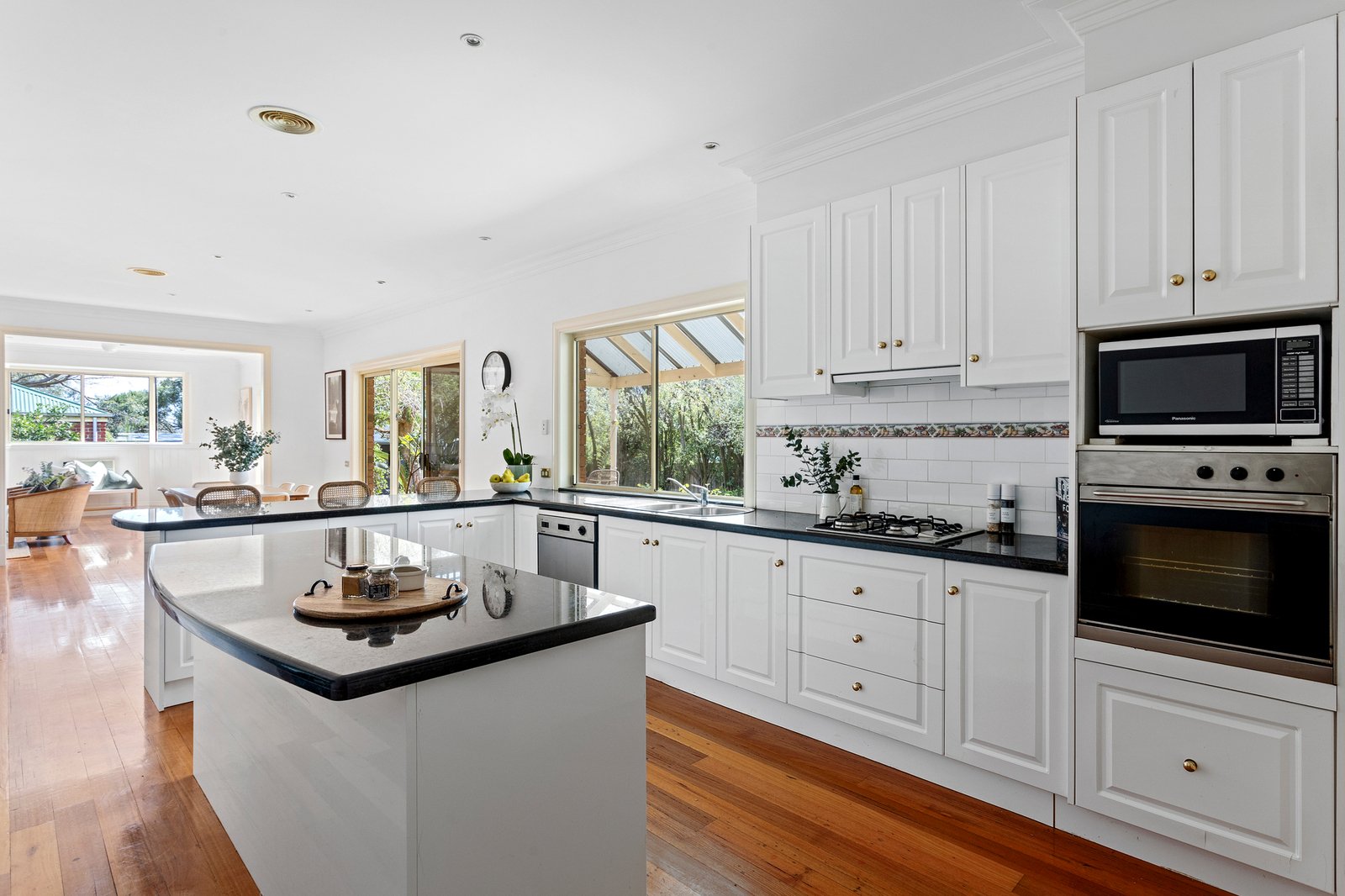Evolving with a devotion to family connection, the well-zoned floorplan reserves one side for entertaining and relaxation, the granite-topped kitchen with an island bench and walk-in pantry forming its natural centrepiece. Opening to a pitched pergola and full-width north-facing deck, entertaining and long lunches extend into 1,114 sqm (approx) of private garden surrounds with established trees and broad lawns.