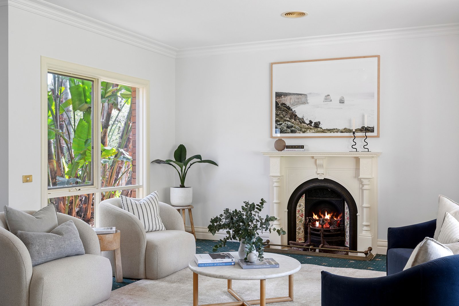 Soaring ceilings with stepped cornices and a half bay window compose an idyllic introduction of volume and light in the front sitting/dining with ornate fireplace. Dado panelling wraps the rear living domain, where the presence of a wood fire provides warmth and atmosphere.