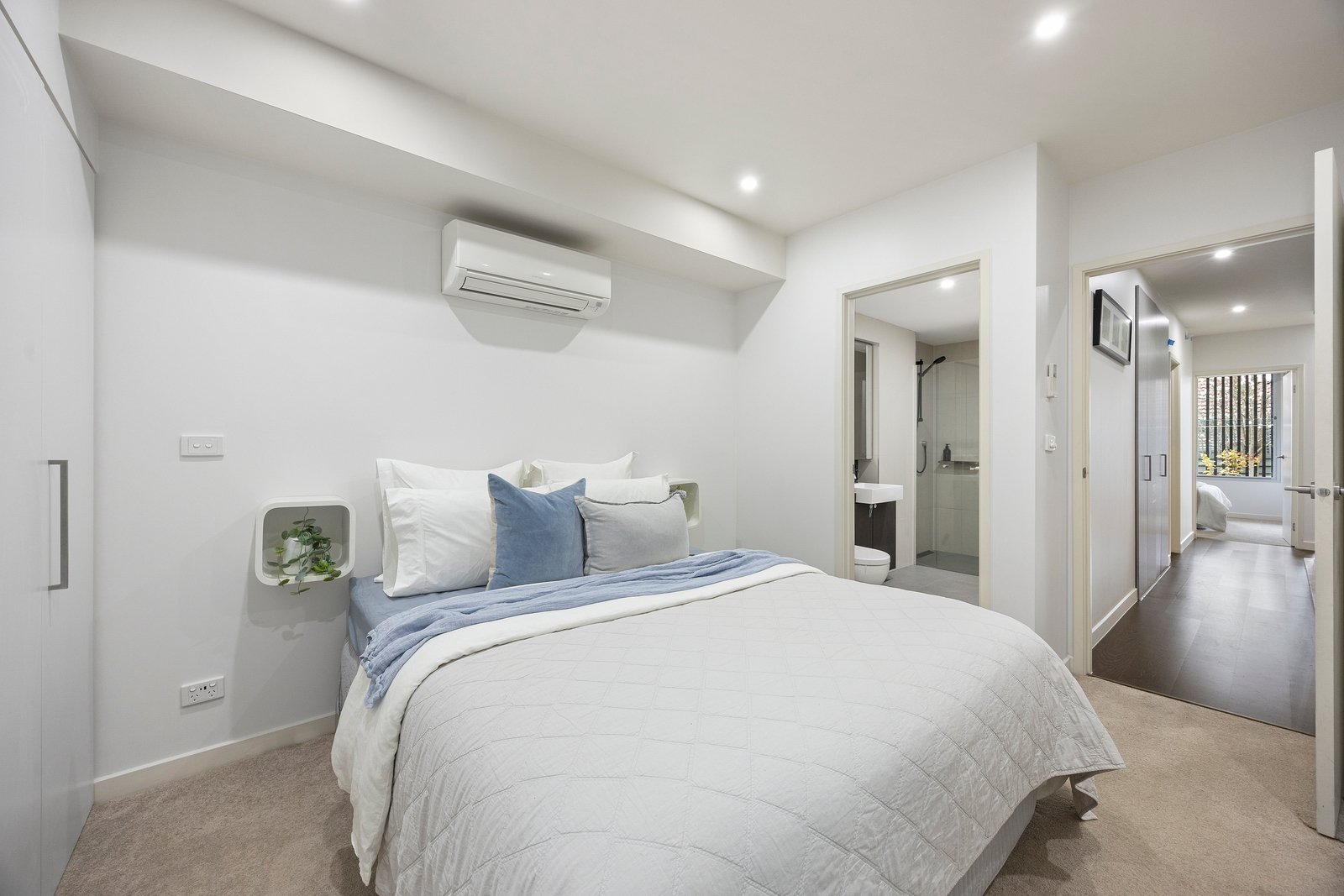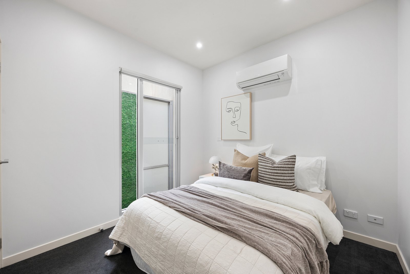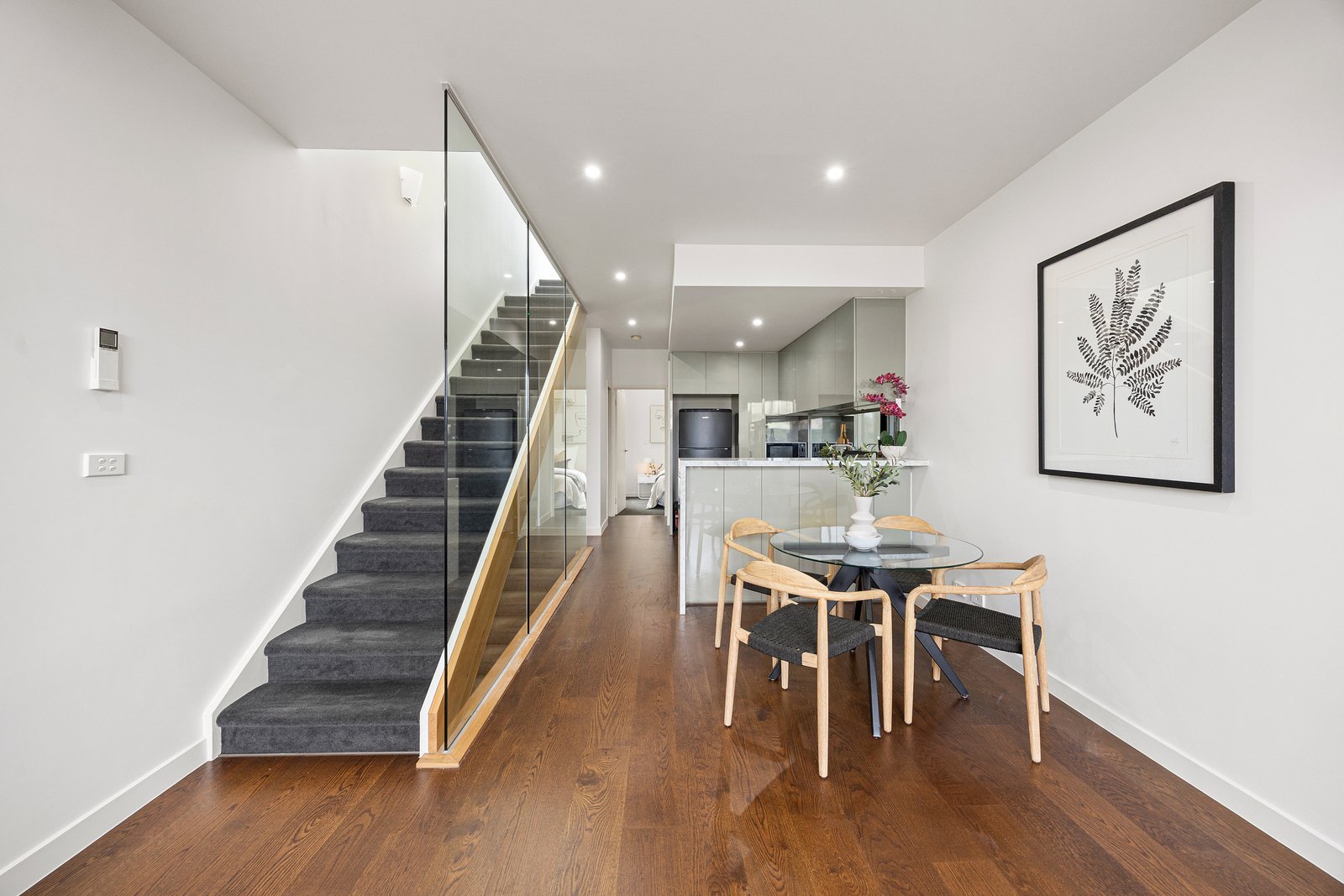 All bedrooms are appointed with built-in robes. The rear ground-floor master suite enjoys a sleek ensuite, while a second bedroom on this level offers access to a two-way bathroom. Upstairs, a versatile third bedroom is ideal for guests, family, or a dedicated work-from-home space.