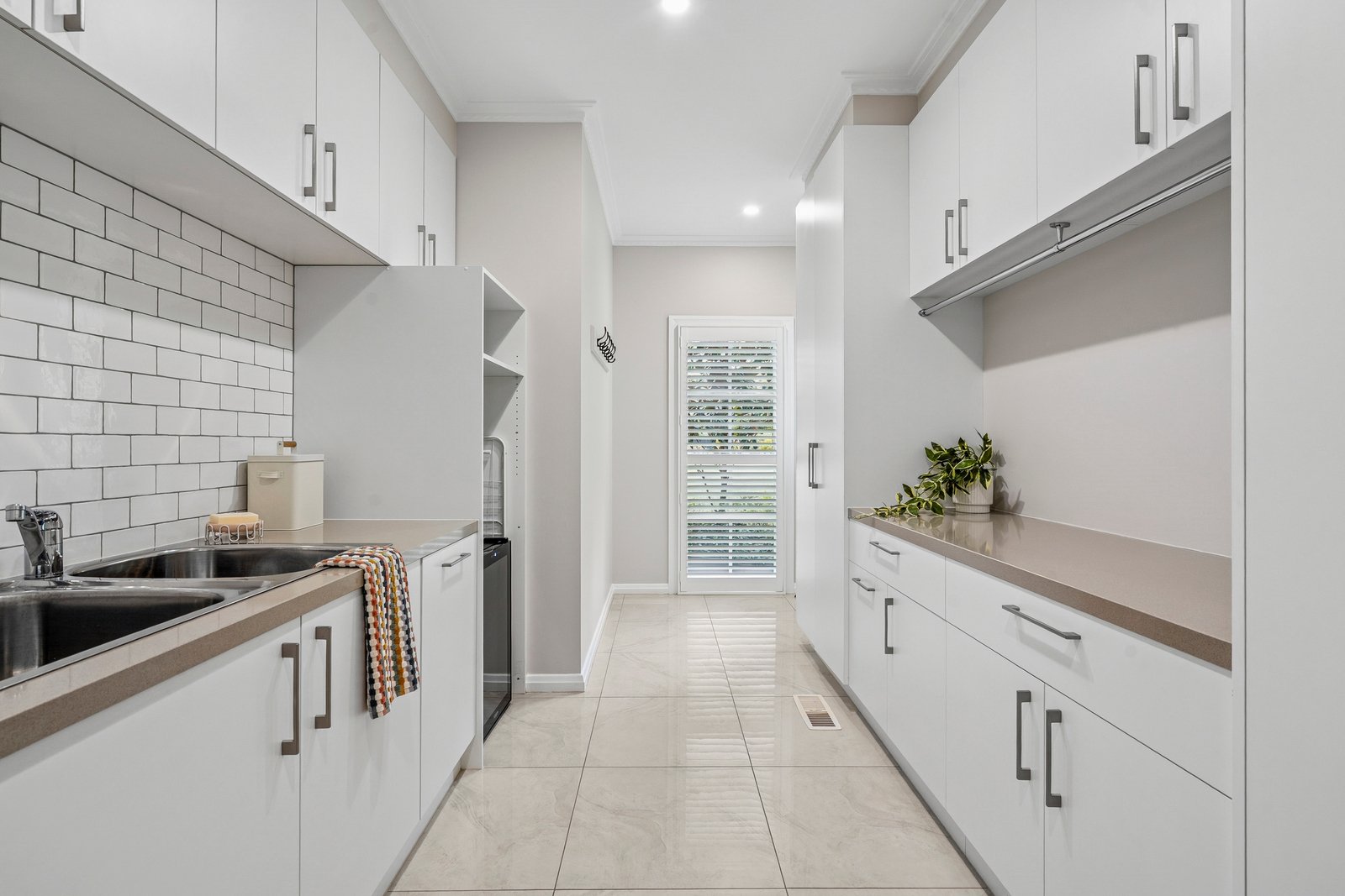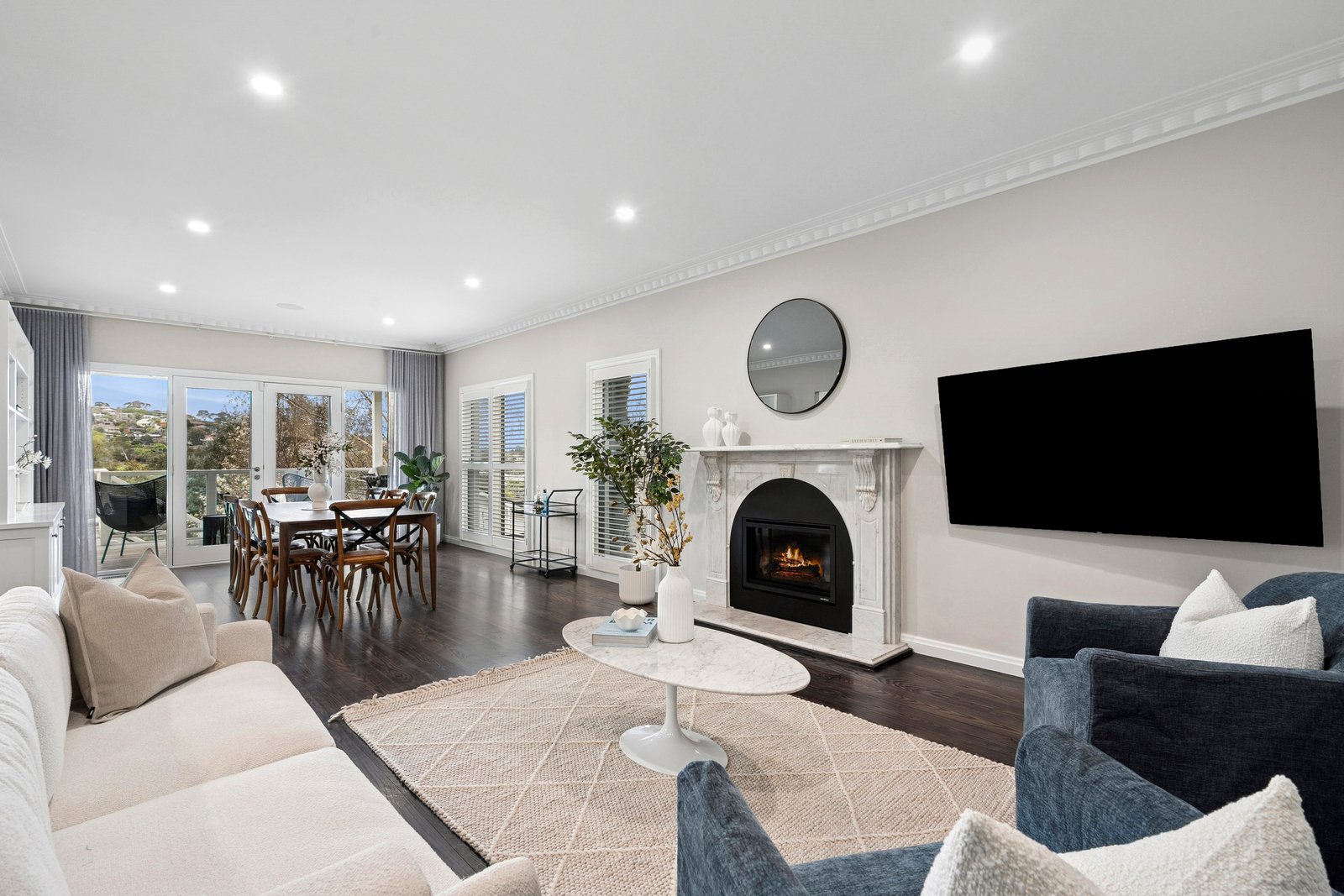 At the heart of the home, the open-plan kitchen, dining and living zone showcases a seamless connection to the outdoors. The gourmet kitchen is fitted with a large island bench, Sub-Zero fridge, Gaggenau ovens, and a walk-in pantry, flowing effortlessly to the light-filled living and alfresco spaces. A spacious laundry with direct external access and abundant storage further enhances the home’s practicality.