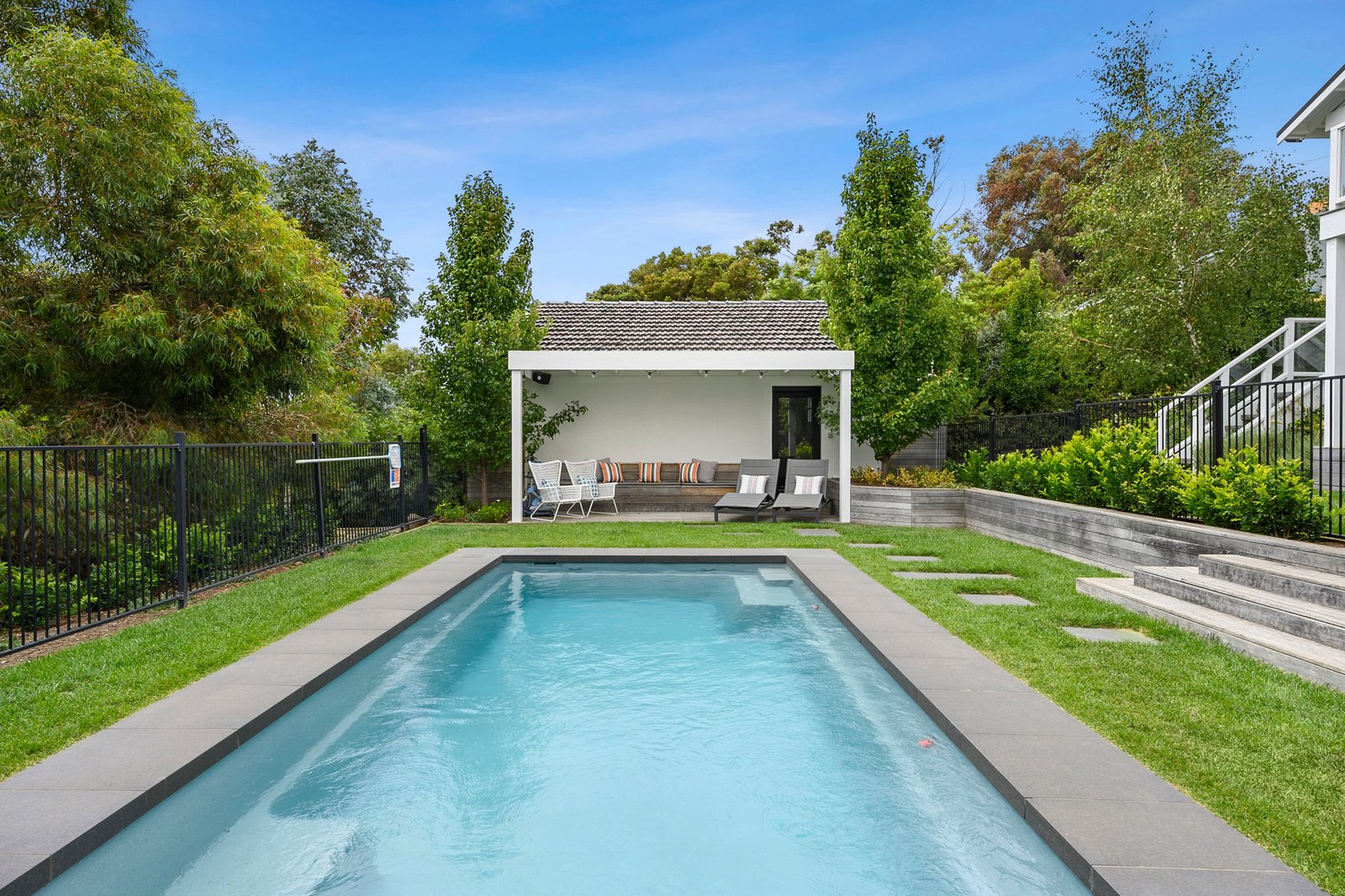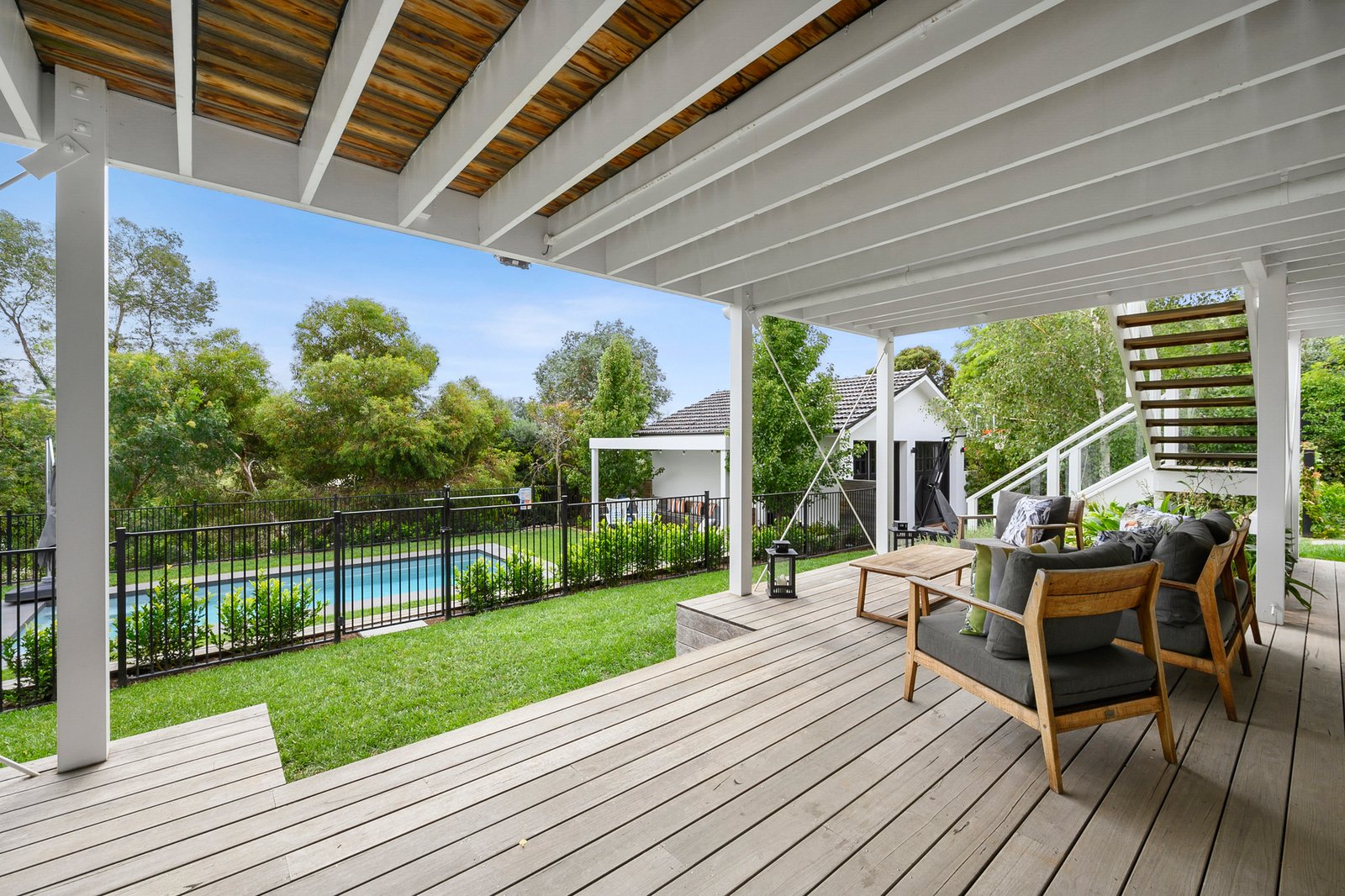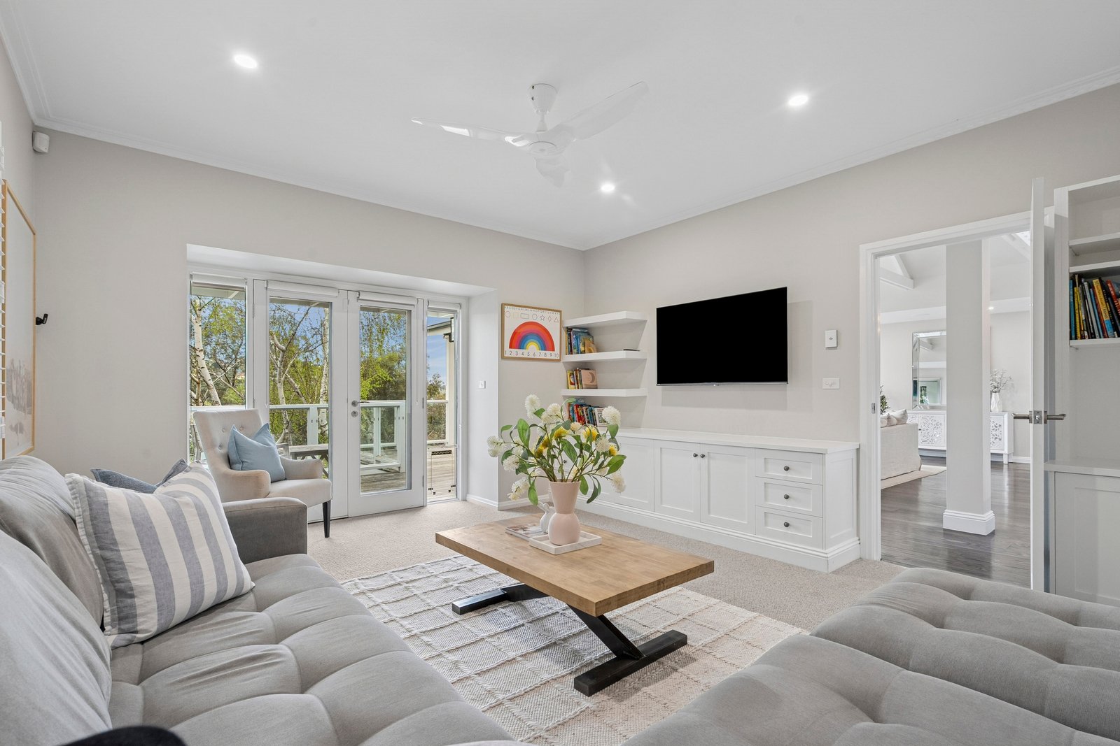 Outdoors, the north-facing deck captures sweeping views across Highton and provides an exceptional setting for entertaining, complete with outdoor heaters, ceiling fans, and an integrated Sonos sound system. The landscaped backyard offers a sparkling in-ground pool, sandpit for children, and generous lawn space, creating a true resort-style environment for the whole family. A secure double carport and ample off-street parking complete the picture.