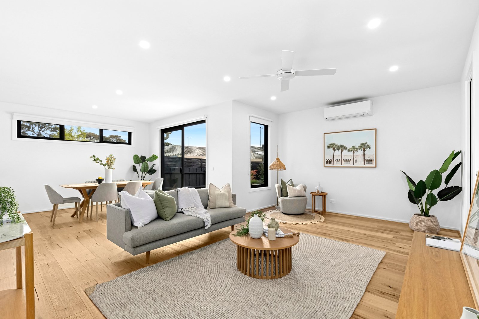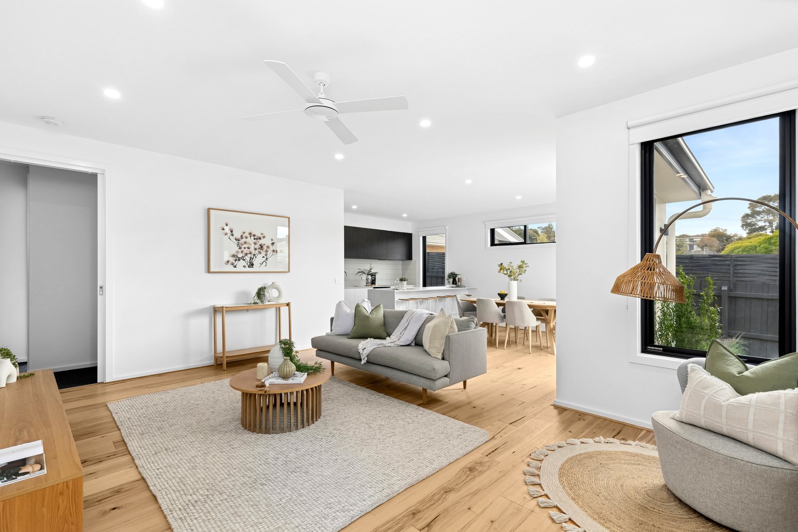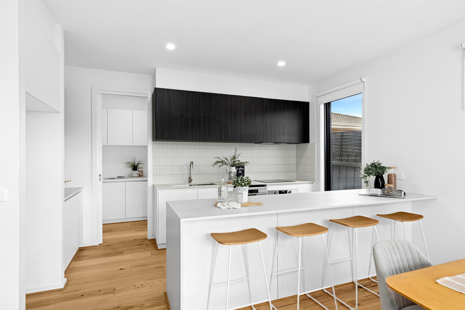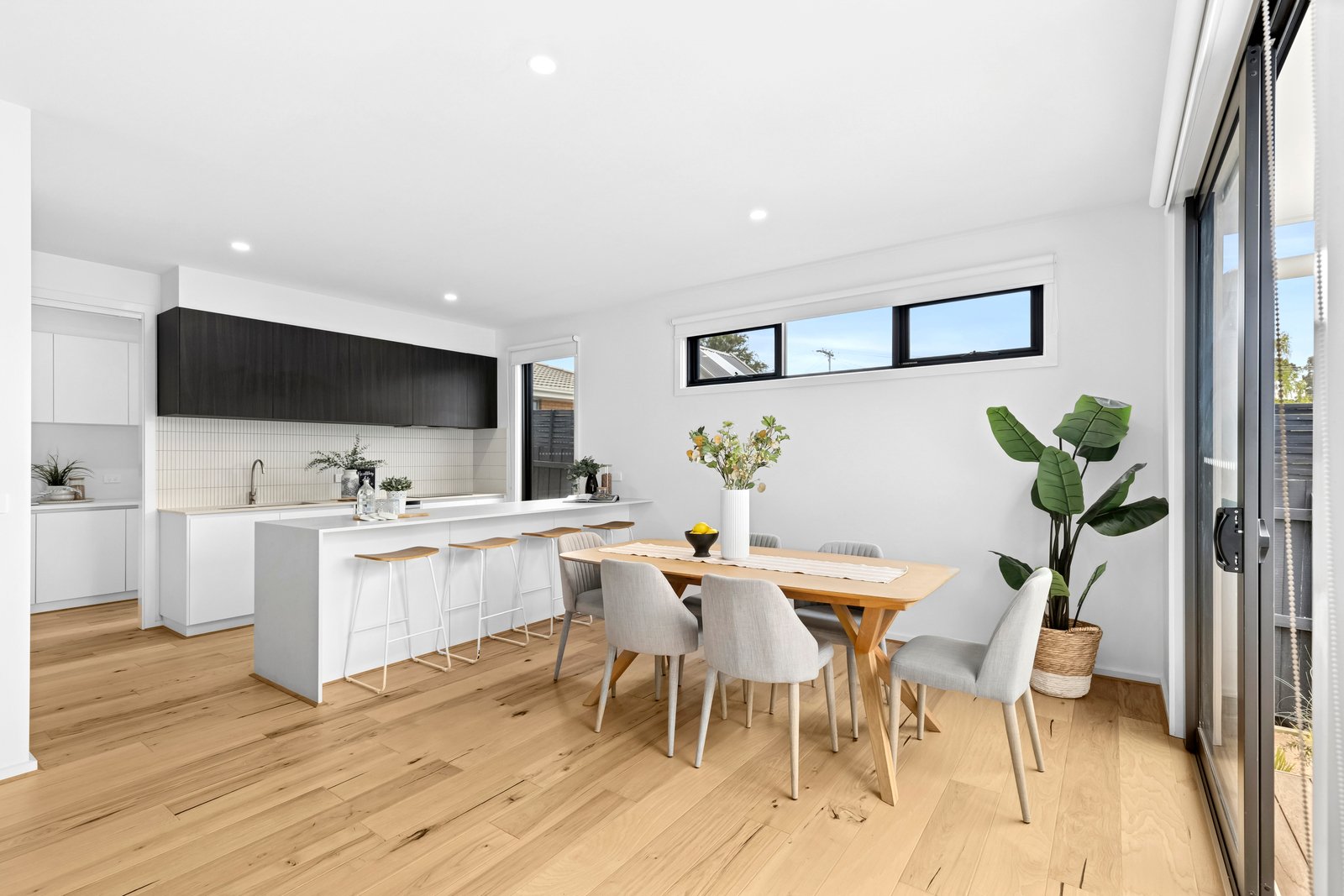 Set back from the road, the home enjoys a secluded setting, amongst beautifully landscaped gardens. Stepping into a wide entry hall, fresh white interiors, square set ceilings, and engineered timber flooring introduce the elegant theme within. The open plan kitchen, dining and living area is bathed in natural light, with glass sliders opening up to the courtyard for seamless indoor-outdoor living and entertaining. The high-quality kitchen features waterfall stone benchtops, sleek contemporary cabinetry, Westinghouse appliances including 600mm electric oven, induction cooktop, dishwasher, ample bench space and generous storage with a large walk-in pantry.
