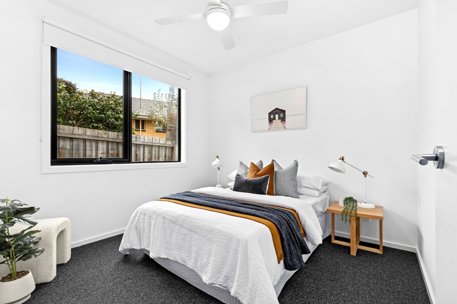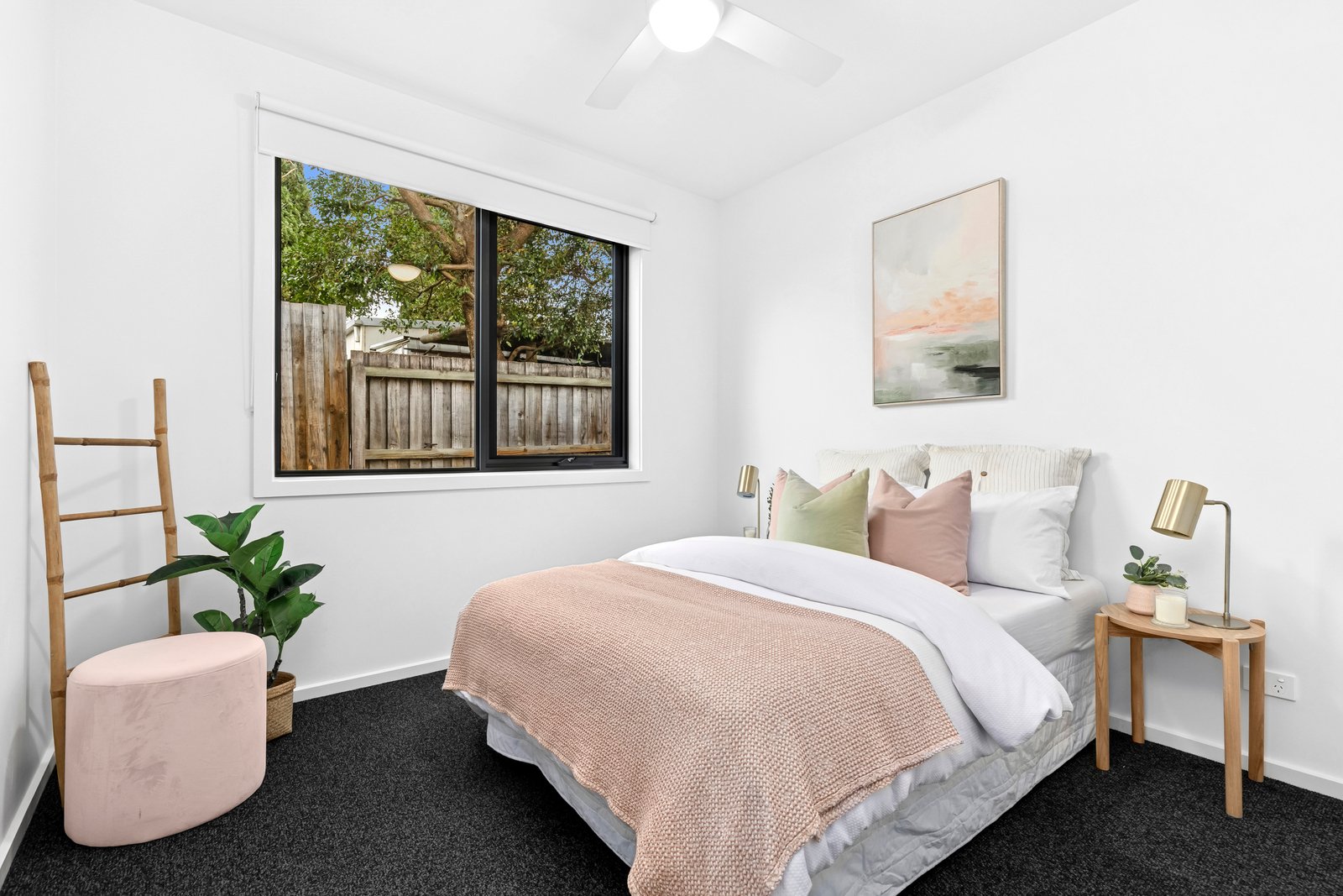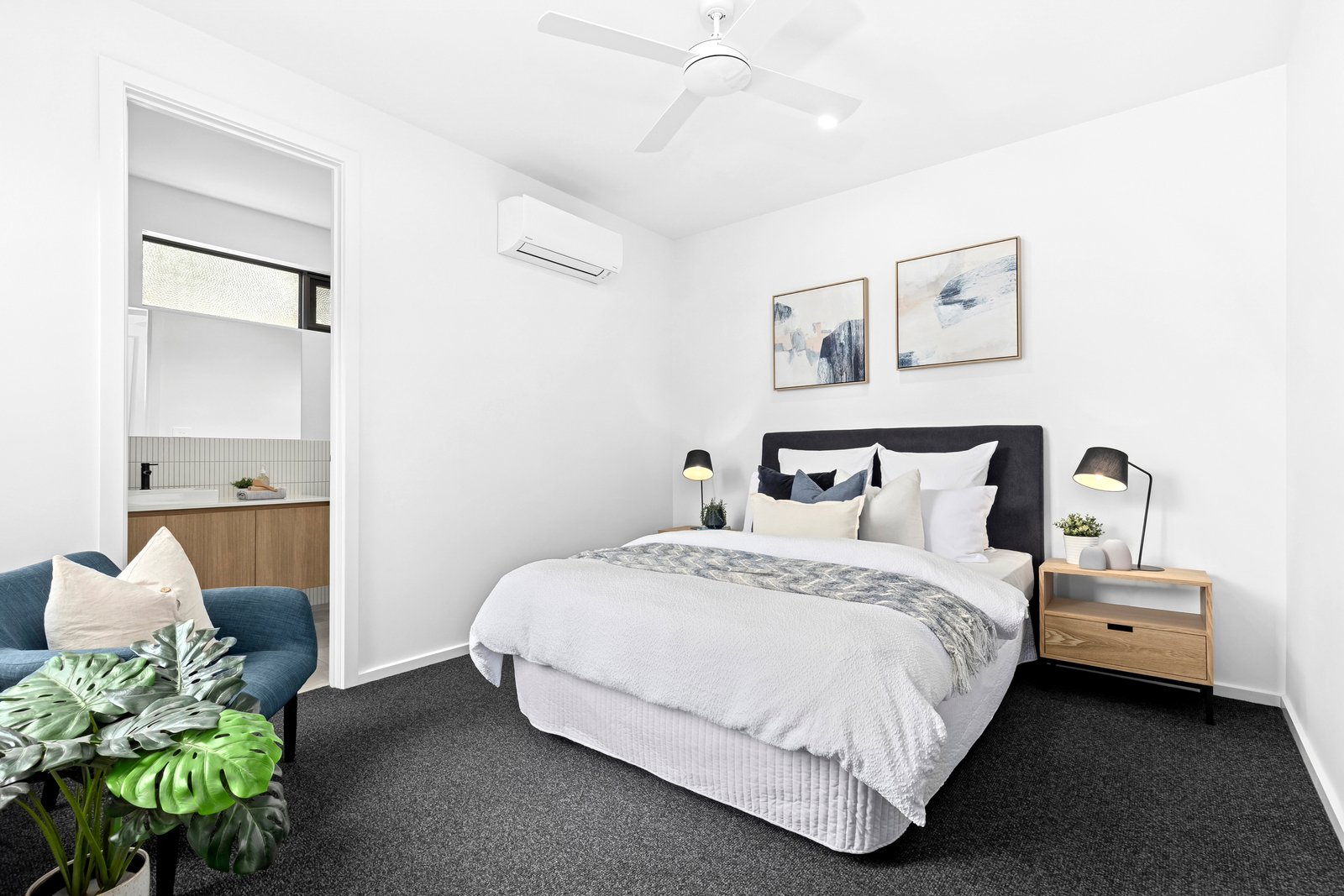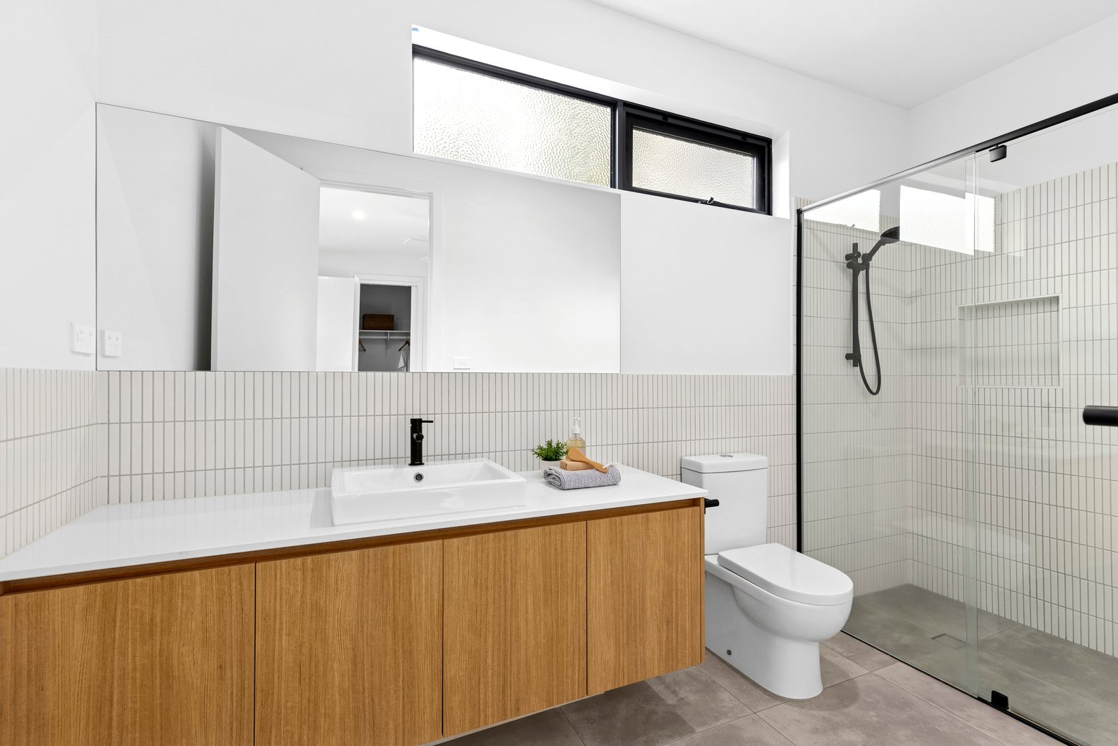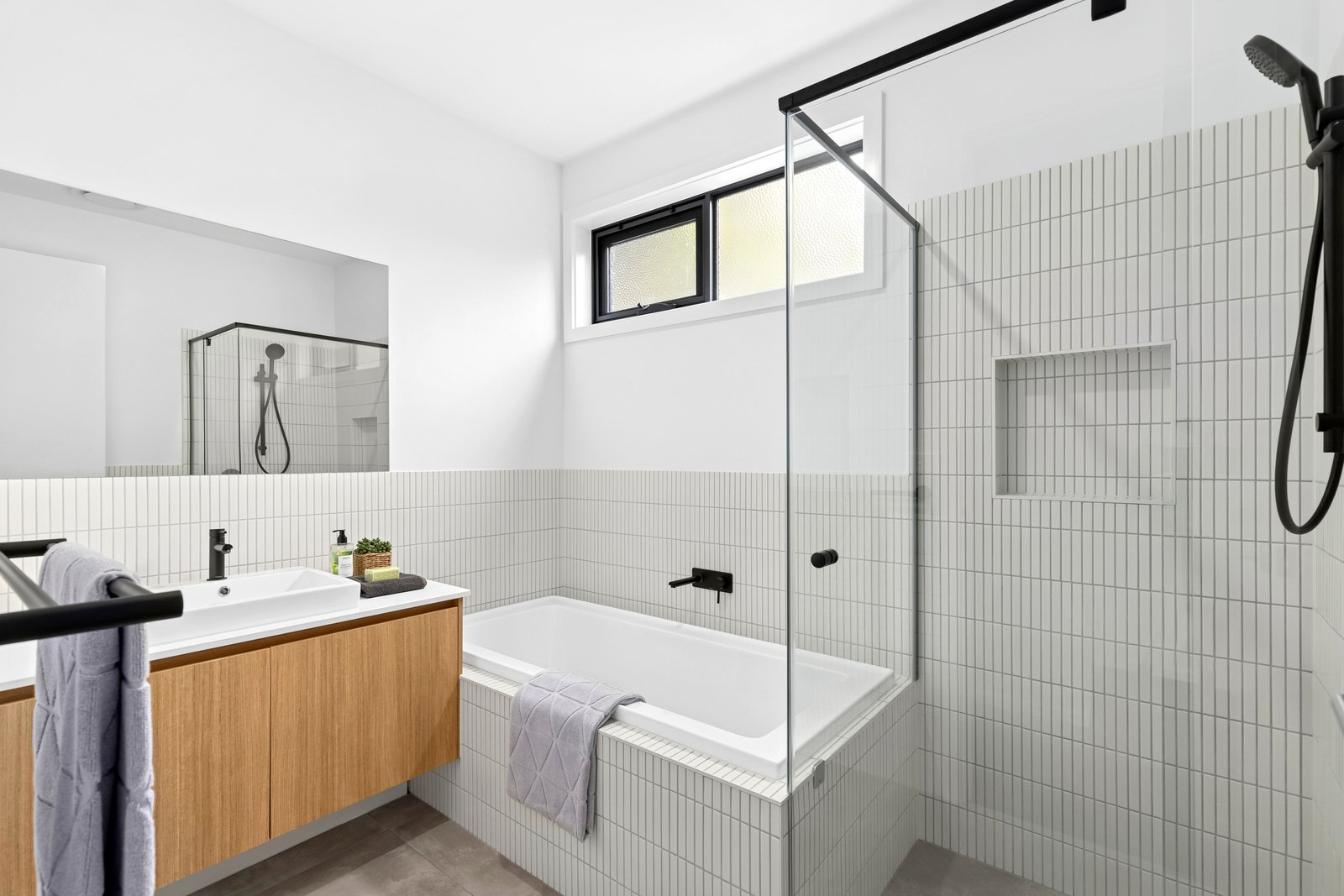 The main bedroom is positioned off the entry, featuring walk-in robes and a stylish ensuite with stunning finger tiles, a modern vanity with Caesarstone benchtop, luxurious shower and chic black tapware. Two further bedrooms are zoned in a separate wing, both include built-in robes, serviced by a tastefully presented main bathroom, that continues the home’s high-end aesthetic.