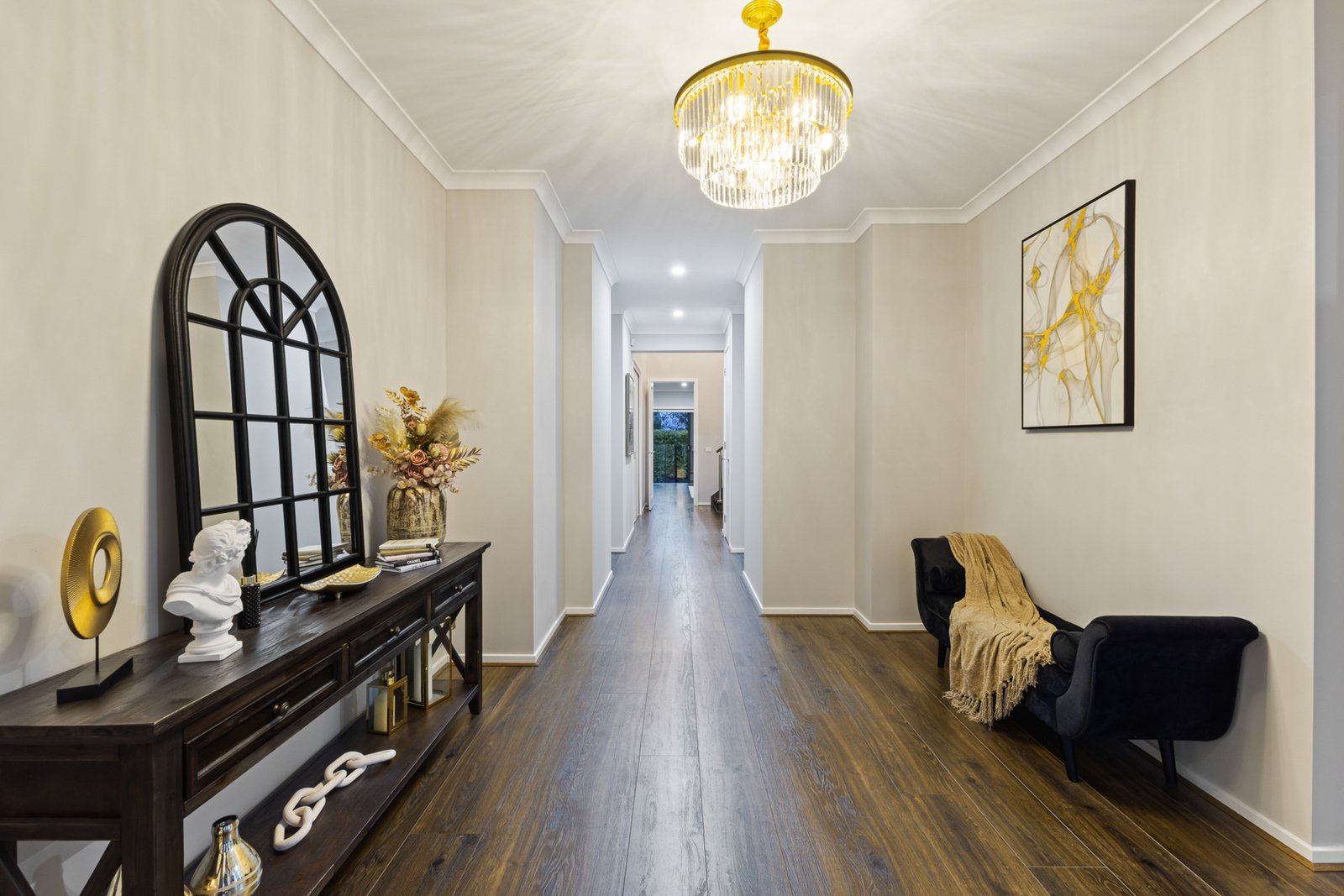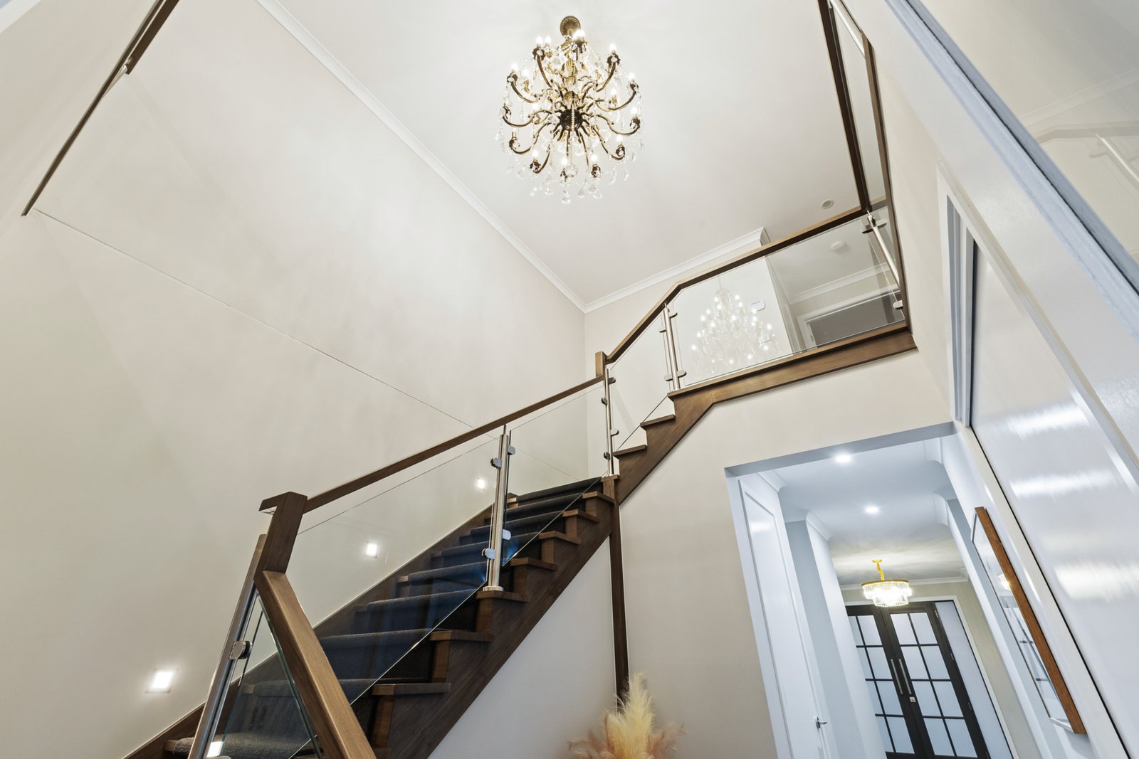 An impressive entrance and over 6m of soaring void space delivers breathtaking volume and light, enhanced by a designer staircase and a statement chandelier for a sense of regal status.