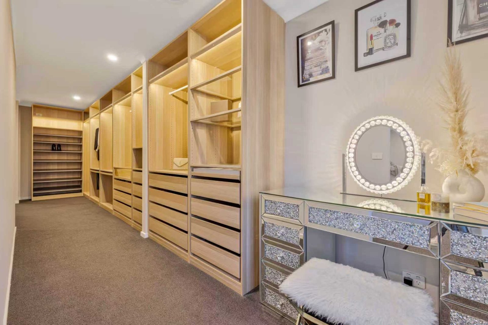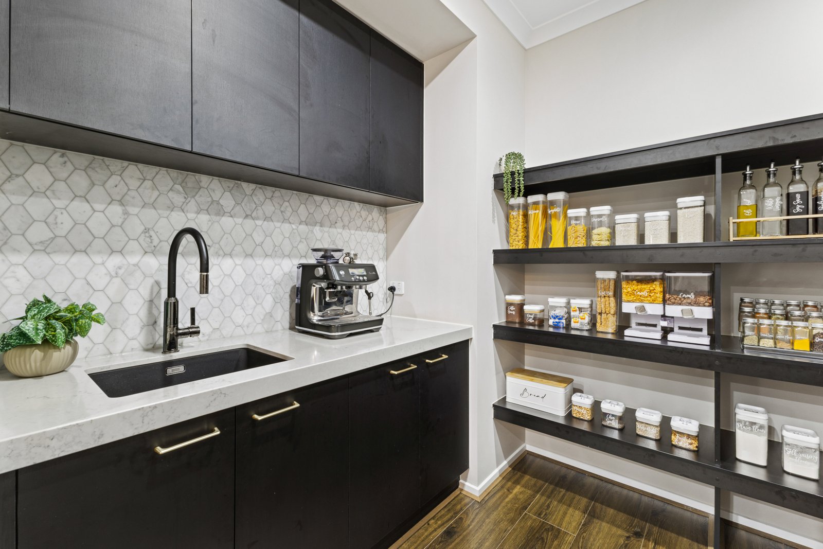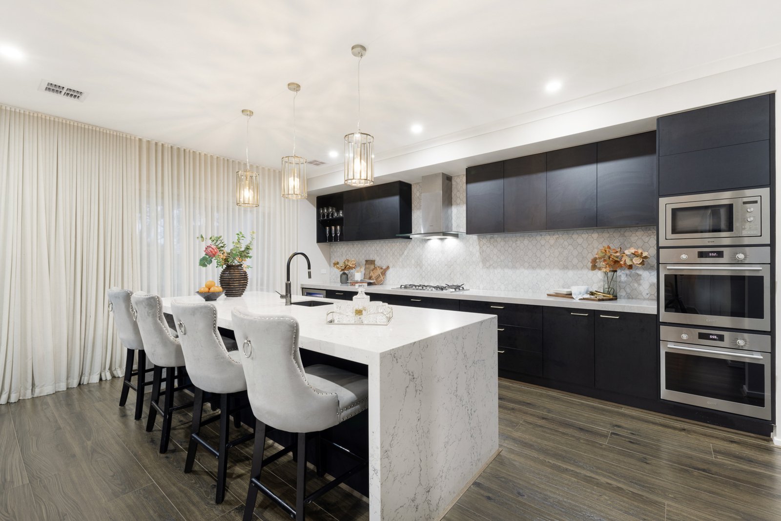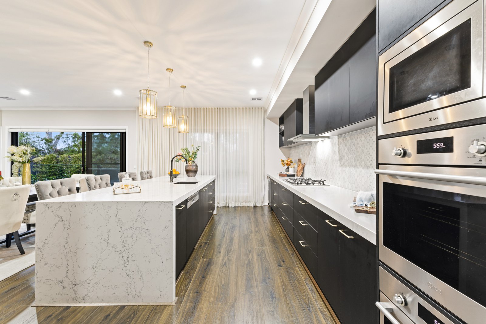 The heart of the home features a spectacular 3m waterfall island with opulent marble diamond mosaic splashbacks in both kitchen and butler’s pantry. Fitted with premium Italian Ilve appliances, twin pyrolytic ovens, fully integrated dishwasher and microwave, and a dual-zone wine fridge combining performance and aesthetics.