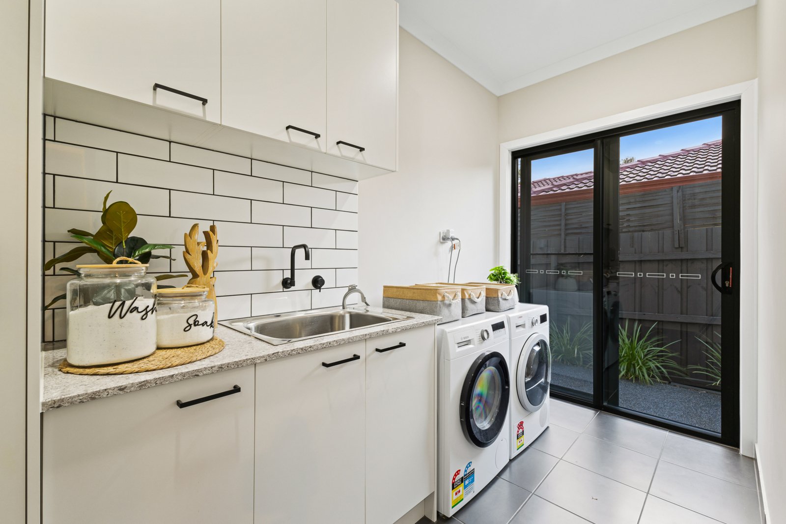 Designer epoxy-lined garage with internal access is perfect for secure parking and integrated workout zone. Hardwired ring security cameras, zoned home security system, Rain bird zoned irrigation and pool system all controlled via mobile app for seamless modern living.