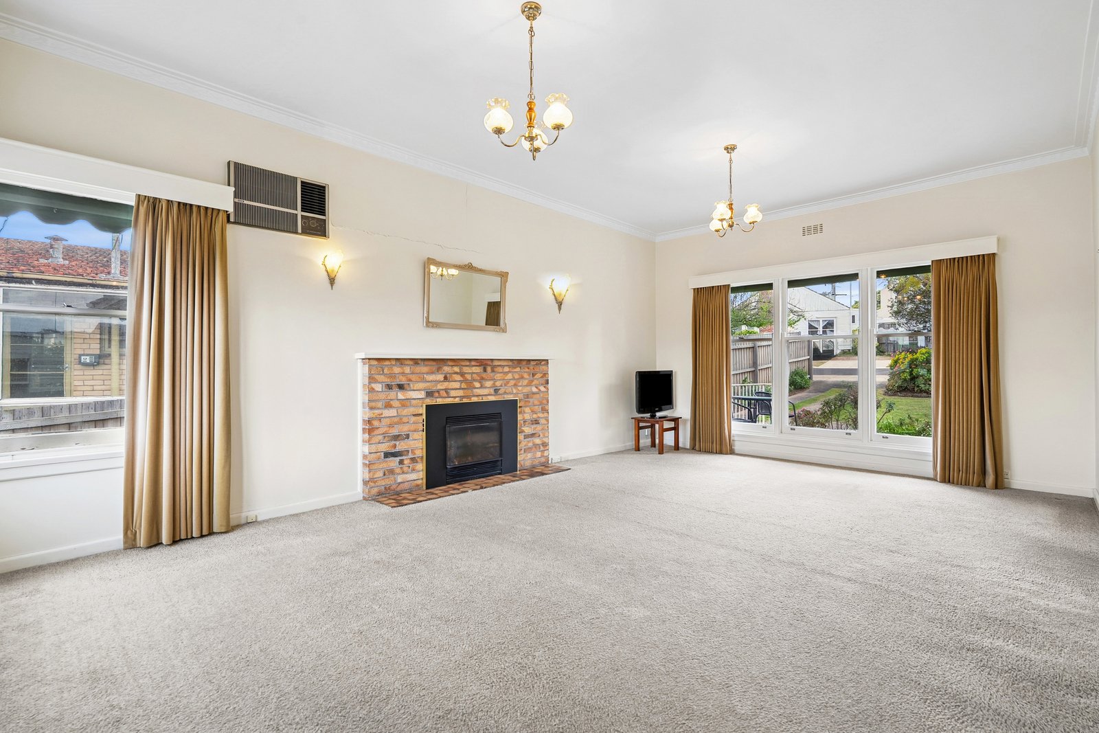 Established gardens create a private and picturesque setting for the captivating mid-century façade. Inside, the entry leads into a welcoming living area with an original brick mantel encasing a gas log fire for a cosy ambience, and corner windows offering views across Belmont to the Highton Hills. Double doors connect with the adjoining dining area, completing the main living and entertaining zone. At the heart of the home, the kitchen is perfectly positioned to oversee the backyard and capture the scenic vista.