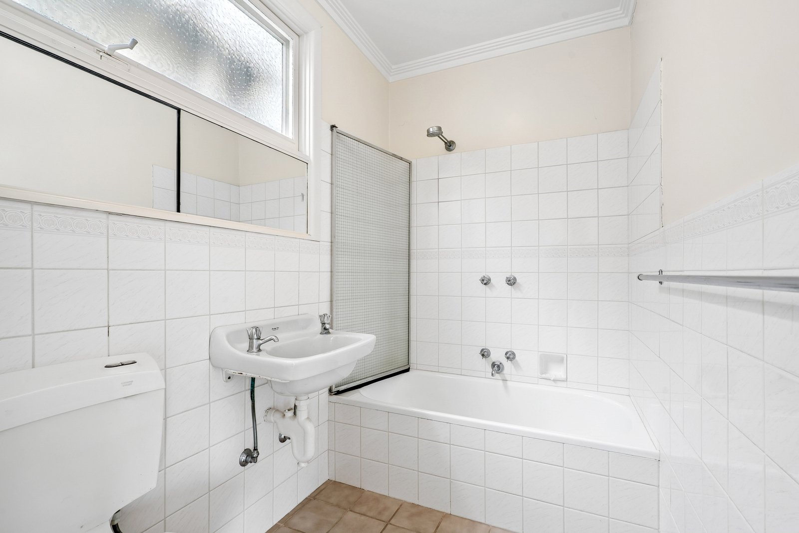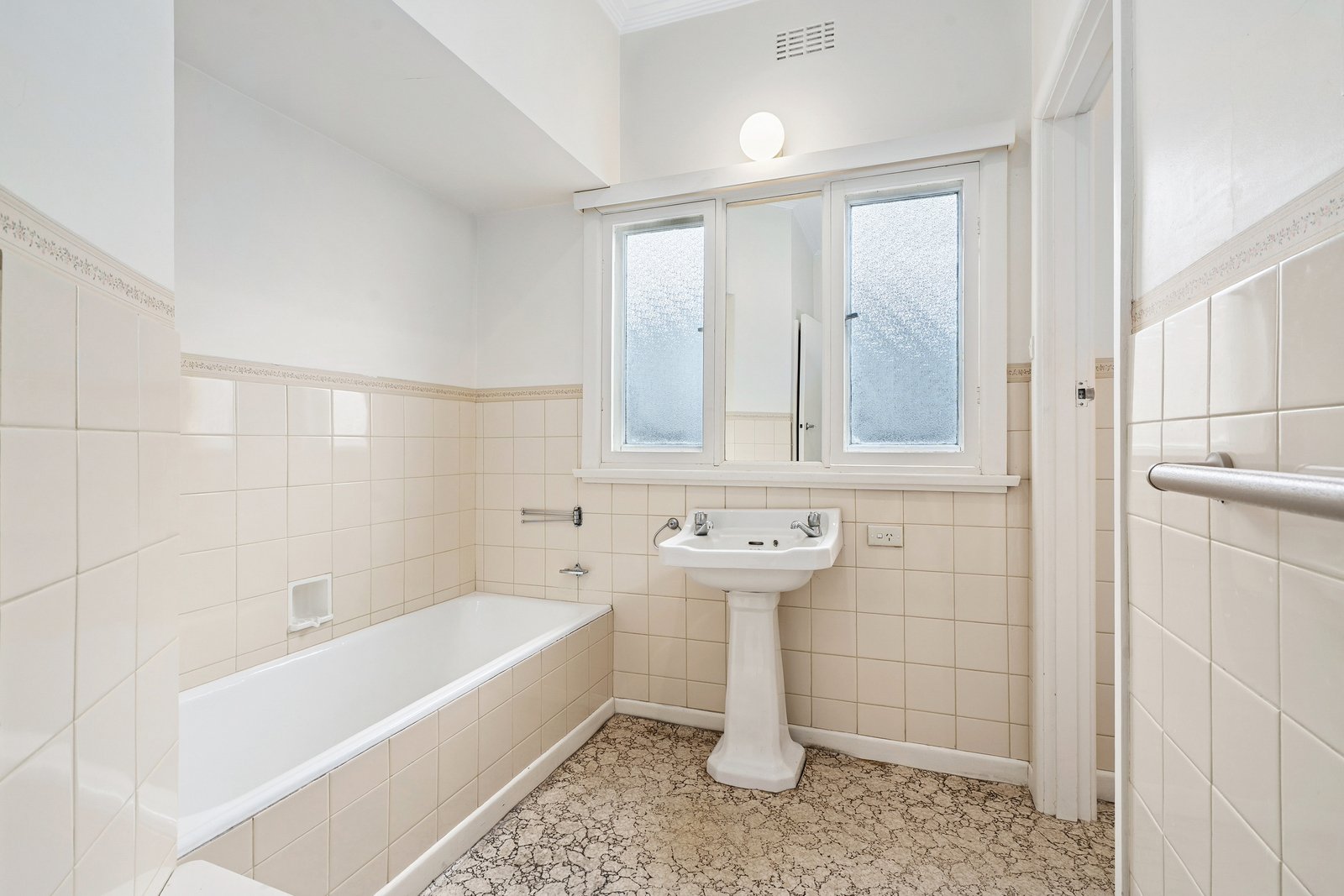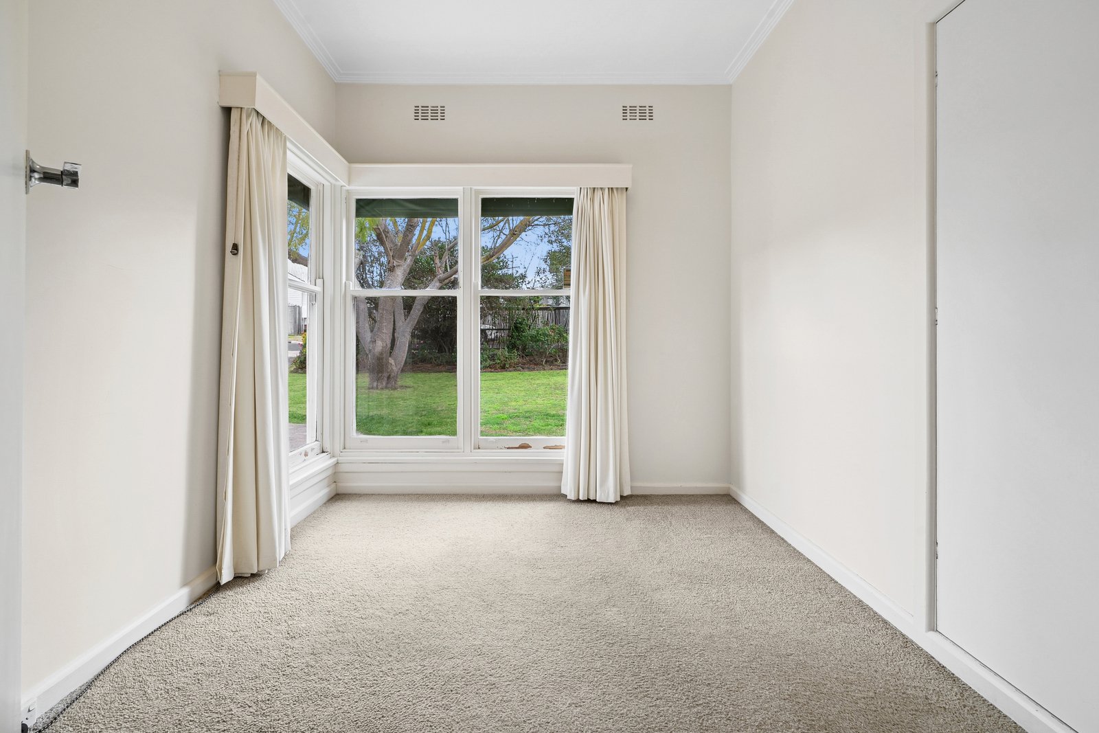Three bedrooms at the front of the home, all feature built-in robes and tranquil garden outlooks, serviced by a central bathroom with bath, separate shower, and a classic pedestal basin. To the rear, an additional room with ensuite bathroom provides a versatile space for a second living room, a teenager’s retreat, or a privately zoned guest room.