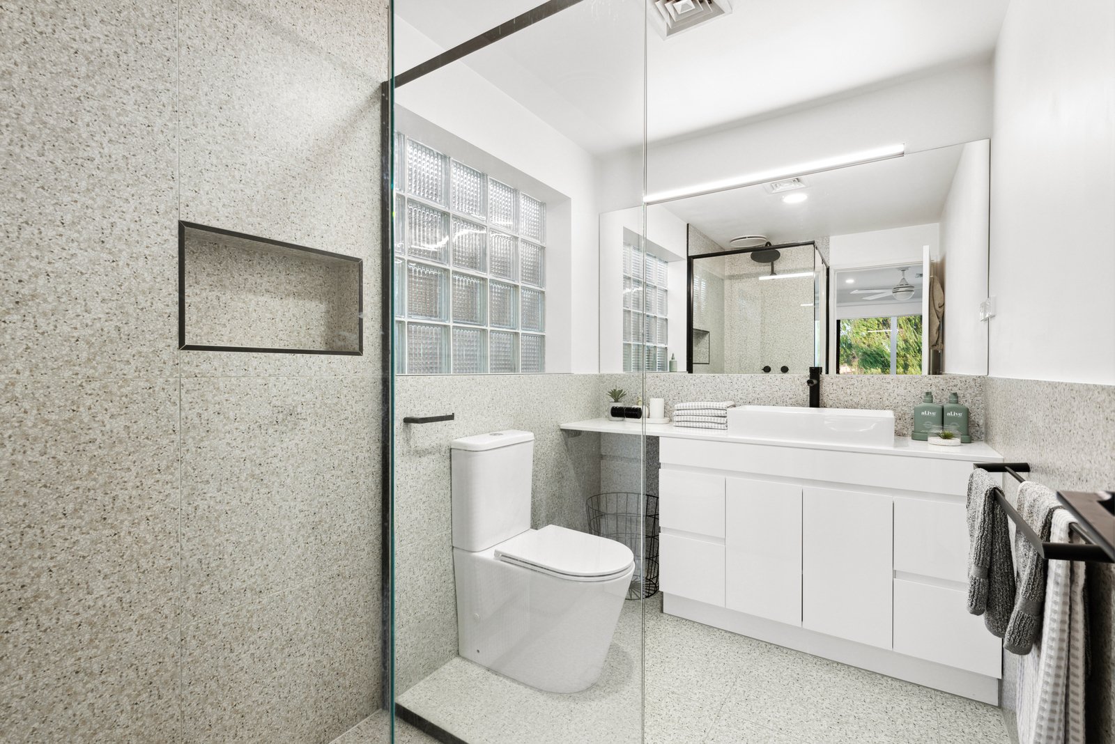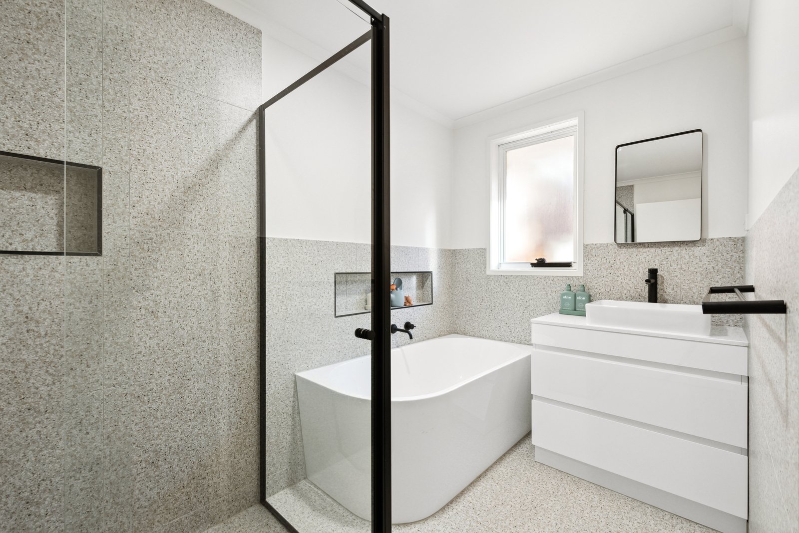 Centrally positioned for easy hosting either in the dining room or out on the alfresco patio, the well-equipped skylit kitchen will please avid hosts while both the main bathroom and master ensuite have been luxuriously appointed, each showcasing stunning terrazzo-style tiles and chic matte black fixtures. Similar finishes can be found in the sunny laundry which benefits from outdoor access; also offered are ducted heating & cooling, plantation shutters, dual blinds and a double auto garage with handy shoppers’ entrance.
