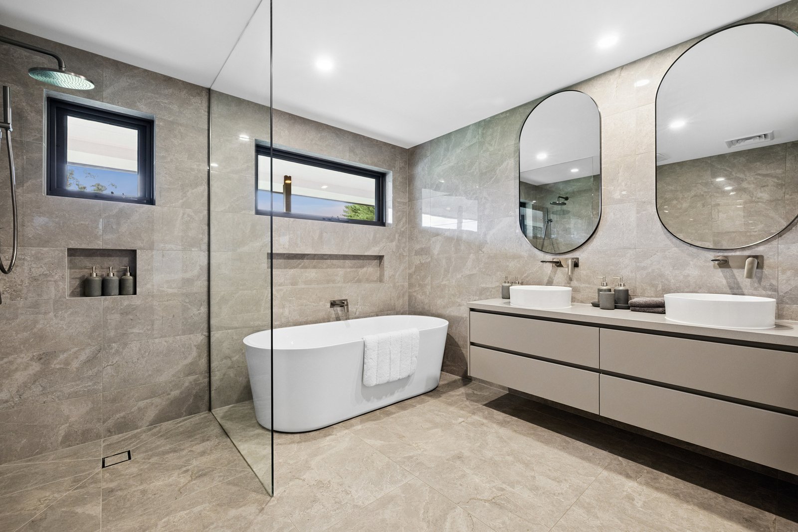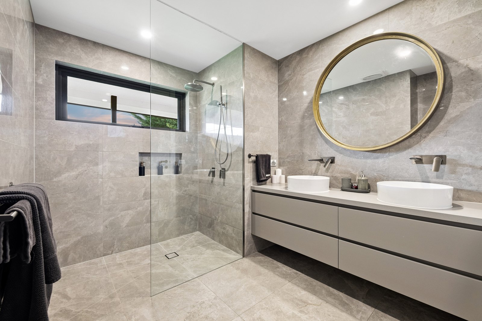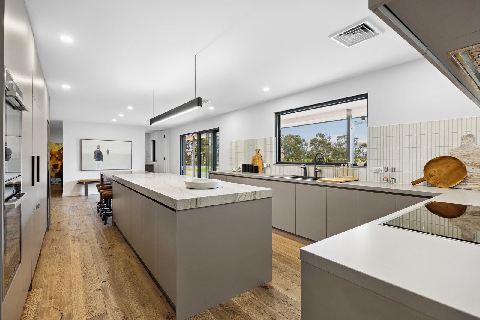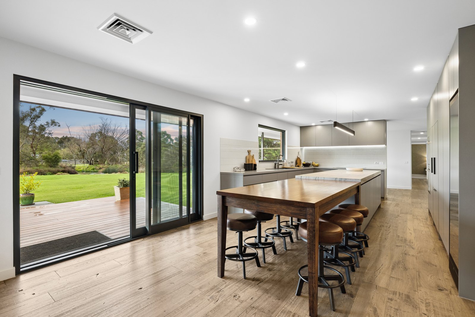 An equally impressive family bathroom services the rest of the home – there is also an outdoor bathroom for rinsing off after a day outdoors. Zoned and WiFi-enabled heating/cooling are also offered, along with a study, large laundry with marble countertop, wine fridge, premium carpets & oak flooring, gunmetal grey fixtures, Villeroy & Boch showers & tapware, remote blinds, cameras/security and a 12kw solar array.