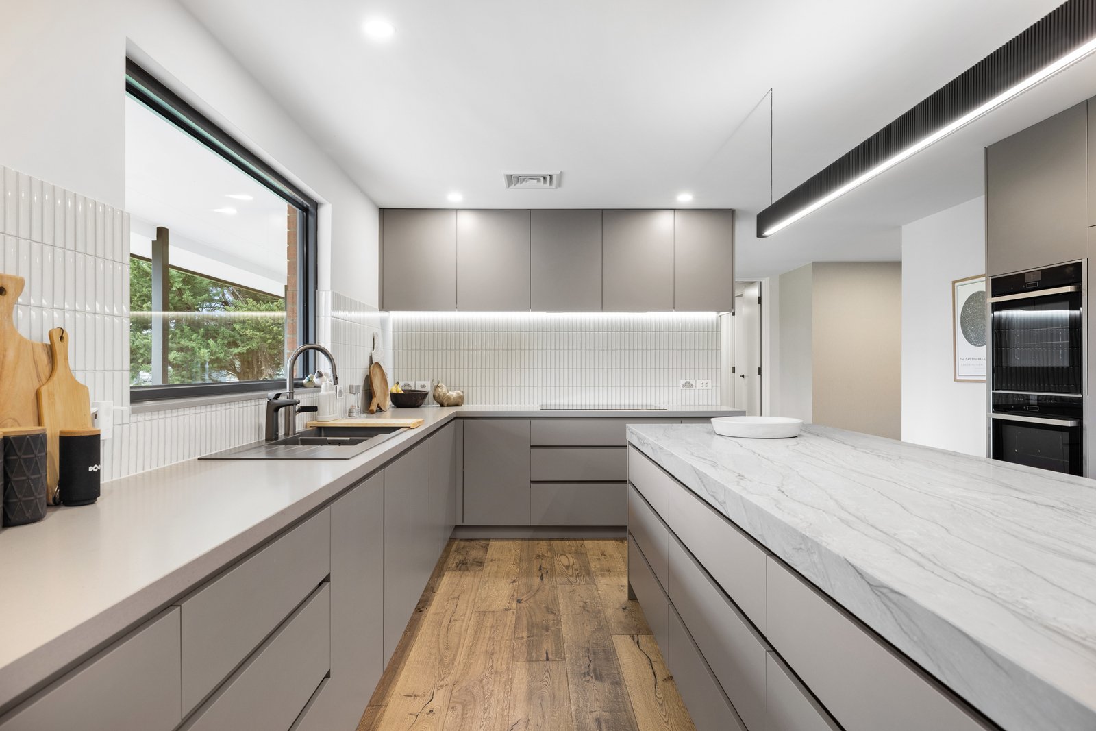 A single-slab Italian marble island and custom timber table are at the heart of the kitchen; an impressive culinary setting that is equipped with a full suite of prestige Neff appliances, a Billi tap and integrated fridge/freezer.