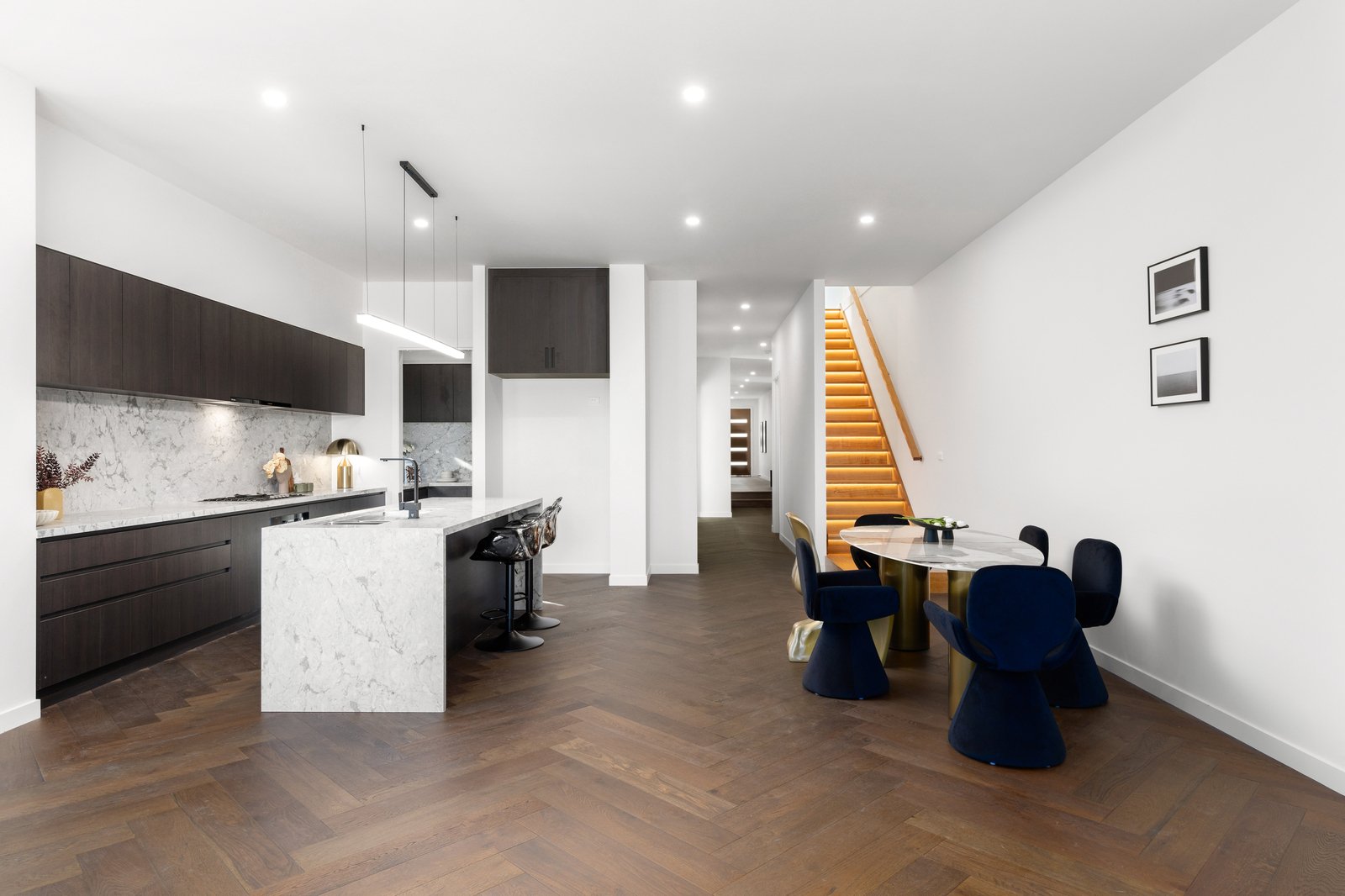 Step inside to elegant parquetry flooring and a private formal lounge with a cavity sliding door. The expansive open-plan living and dining domain flows seamlessly to the chef’s kitchen, appointed with: