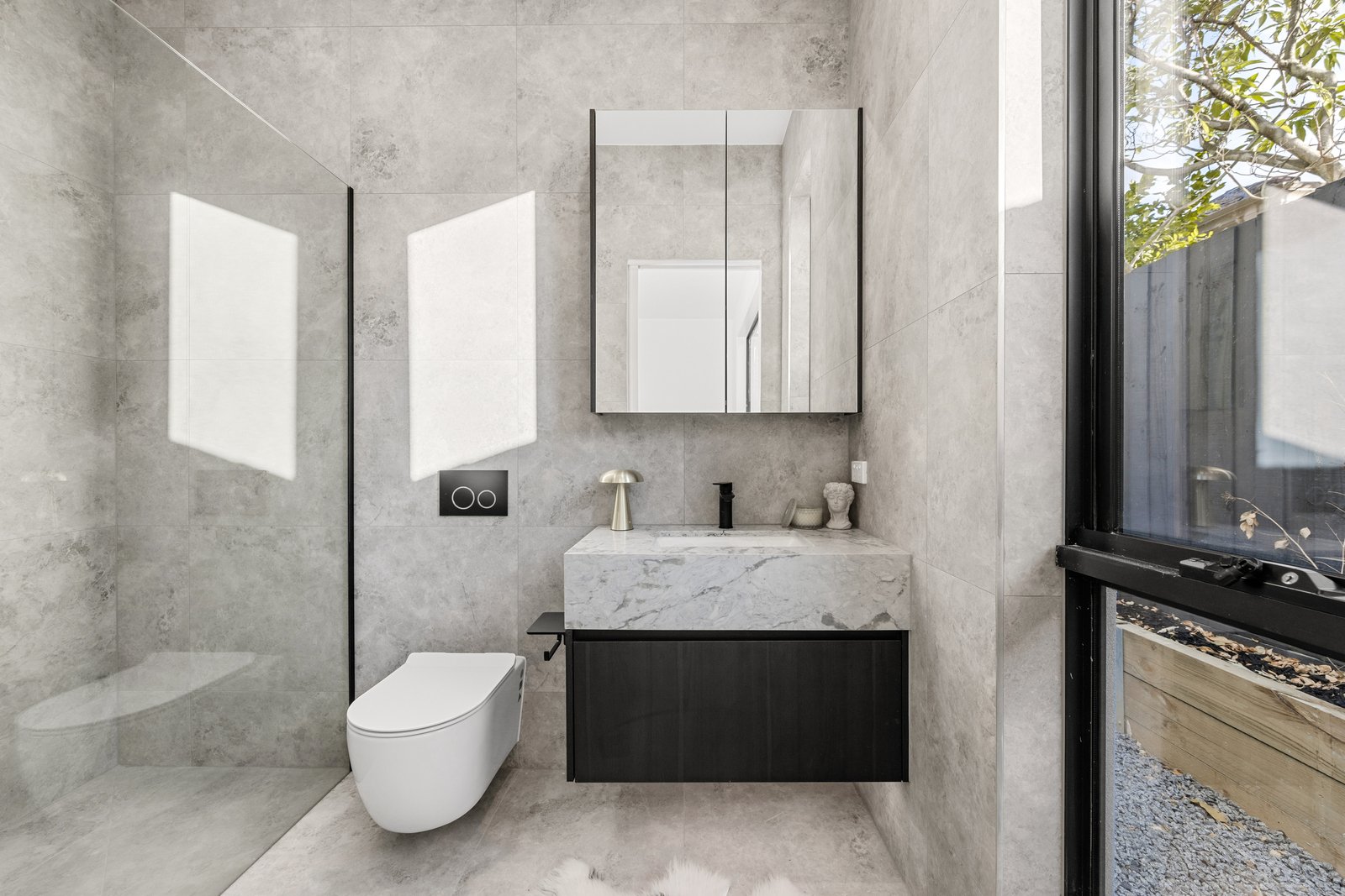 ● Floor-to-ceiling tiled bathrooms with in-wall cisterns