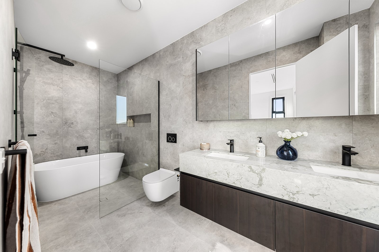 Upstairs, a retreat and separate study zone lead to three robed bedrooms with custom joinery and integrated lighting. The master suite impresses with a dual-vanity ensuite, rainfall shower, freestanding bath, and calming treetop outlooks, while a third bathroom services the additional bedrooms.