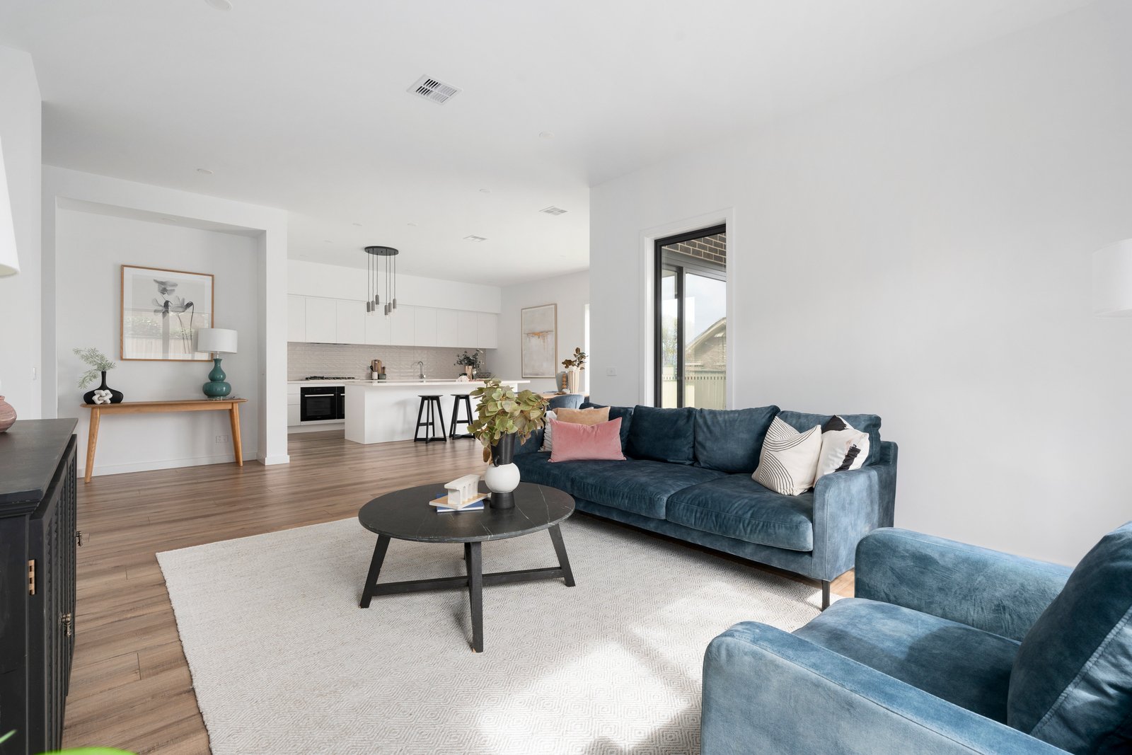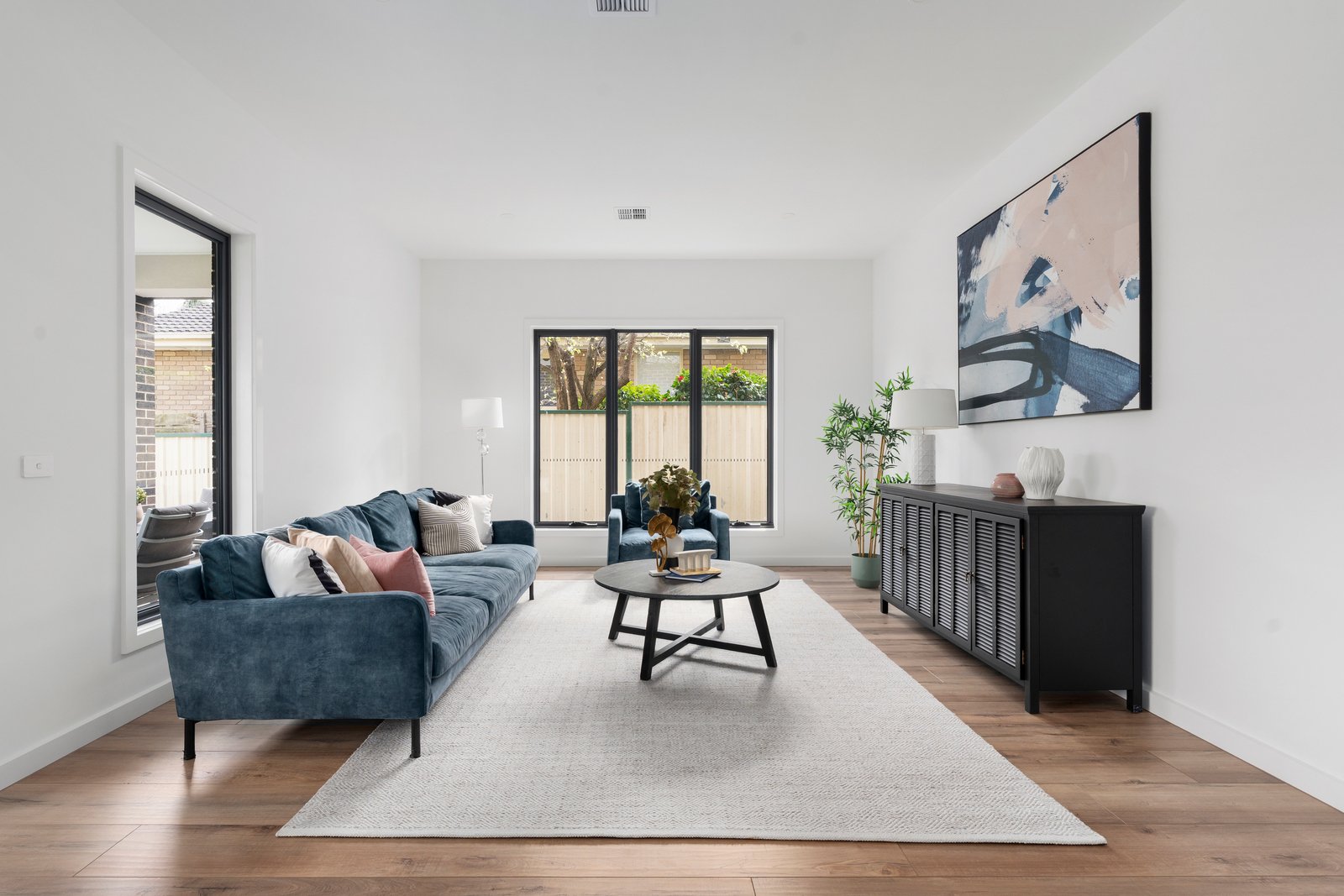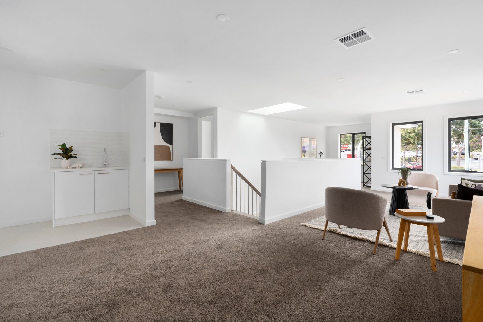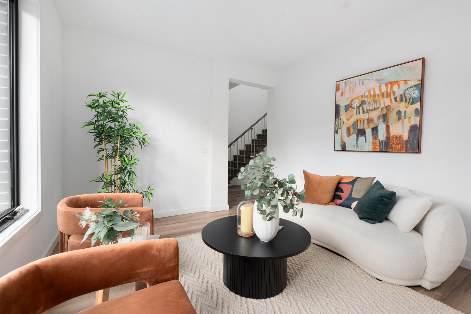 natural light, with East facing frontage providing plenty of morning sun and afternoon sun illuminating the rear garden and its lush turf landscaped lawn. Sized for the growing family, there’s even a 3rd living space at the top of the stairs, ideal as a children’s play area or remote working.