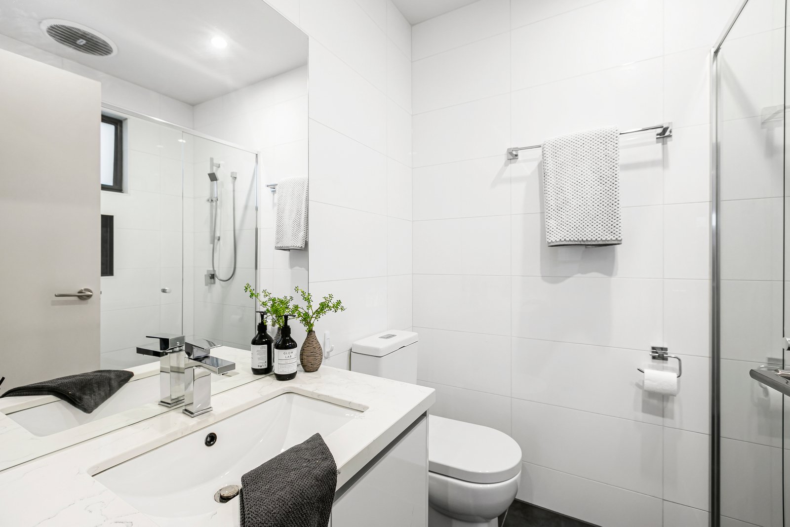 Throughout, the home maintains a sophisticated aesthetic with matching stone surfaces, quality chrome fixtures, white wall tiles, and contemporary dark grey floor tiles in wet areas. Premium touches include a custom-built entertainment unit, flood of natural light, and additional driveway parking for guests.