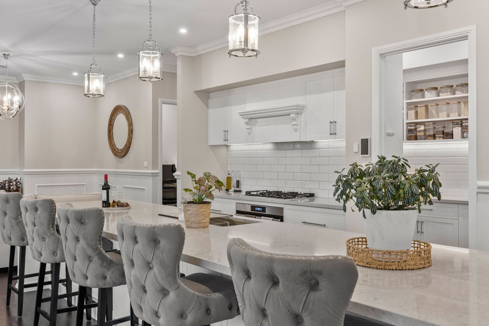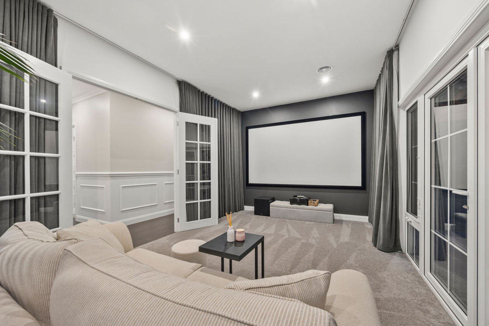 The kitchen is the heart of the home, a space to gather and create with Caesarstone benchtops, an oversized island bench, and a butler’s pantry. Perfectly suited for both family life and entertaining. A custom theatre room adds a touch of indulgence, delivering a cinematic experience without ever leaving your sanctuary.