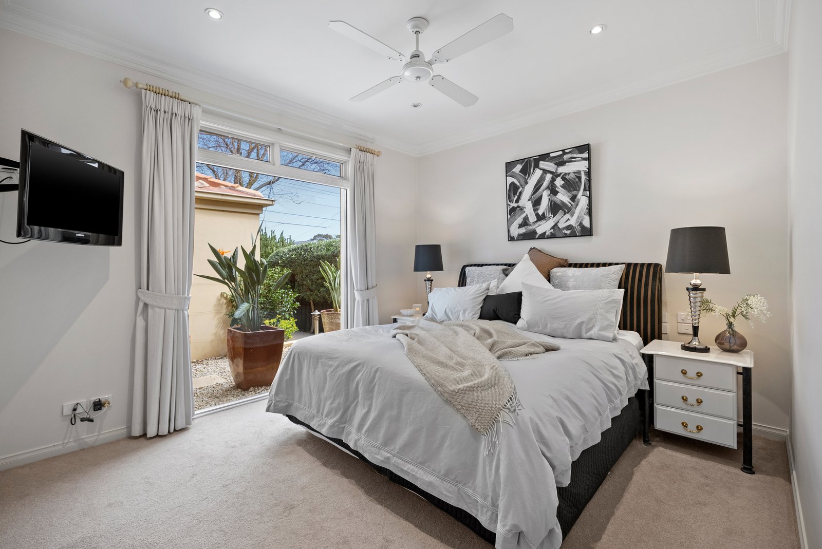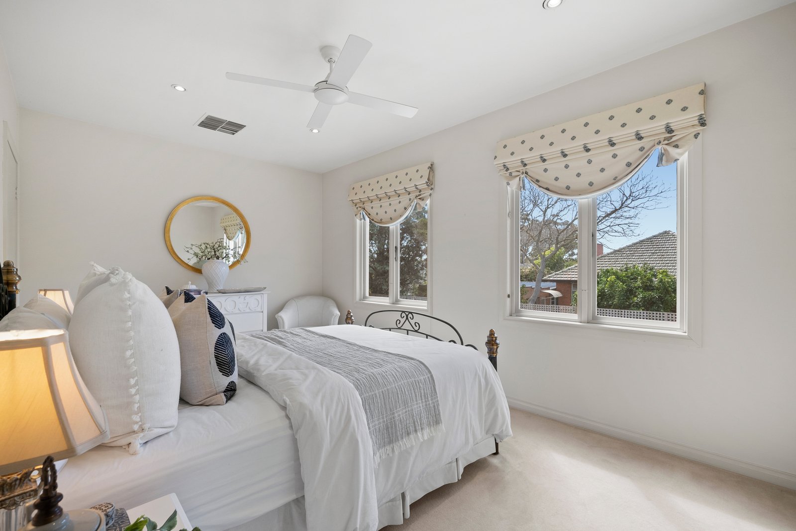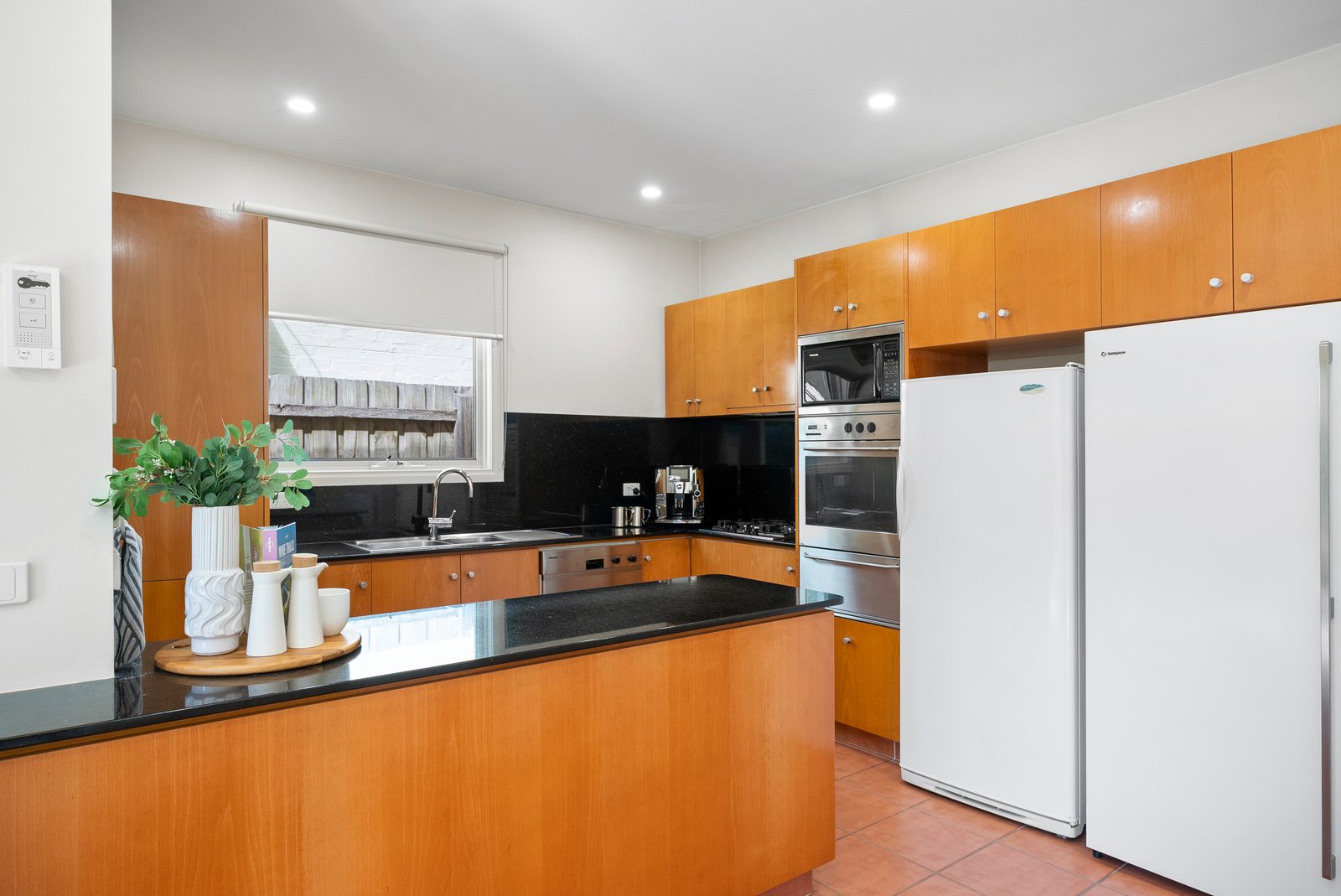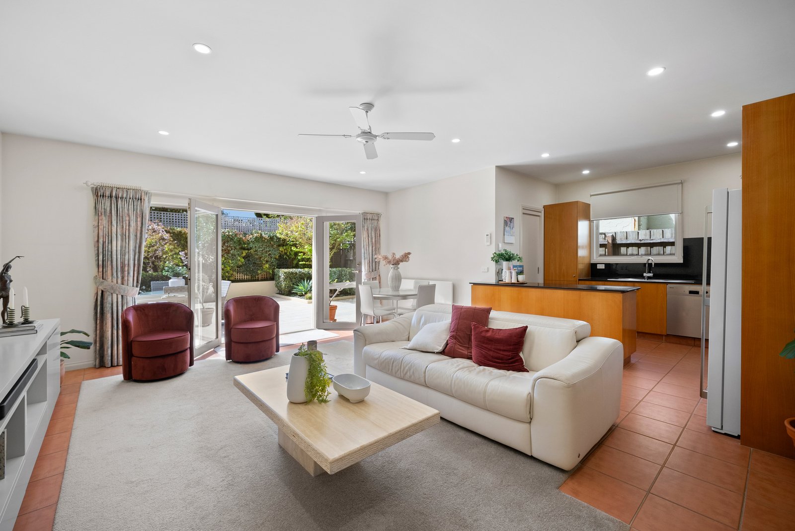 Interiors are bathed in light and arranged with fluid grace. The elegant dining room captures leafy aspects and soft western sun, while beyond, spacious living and meals areas extend through French doors to a broad northern terrace. Uniting these spaces, a granite-finished kitchen with quality stainless steel appliances is perfectly attuned to family life and entertaining.