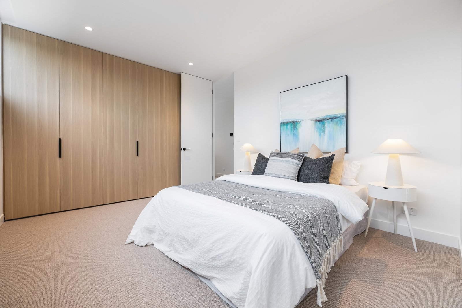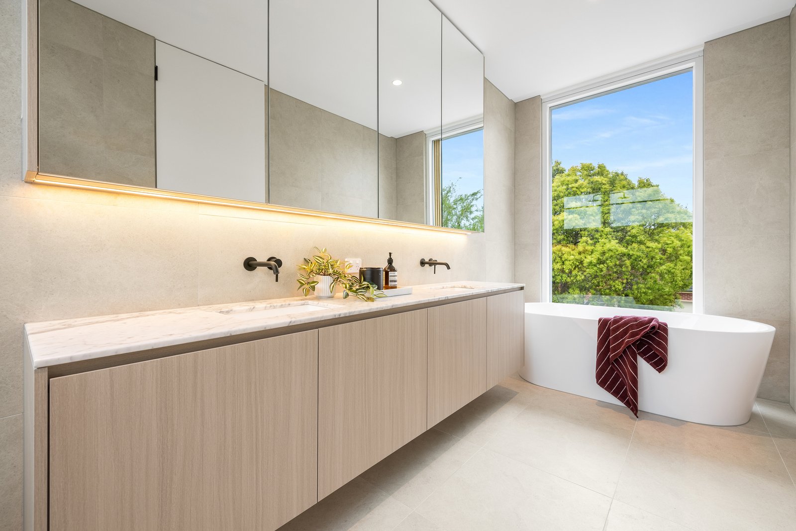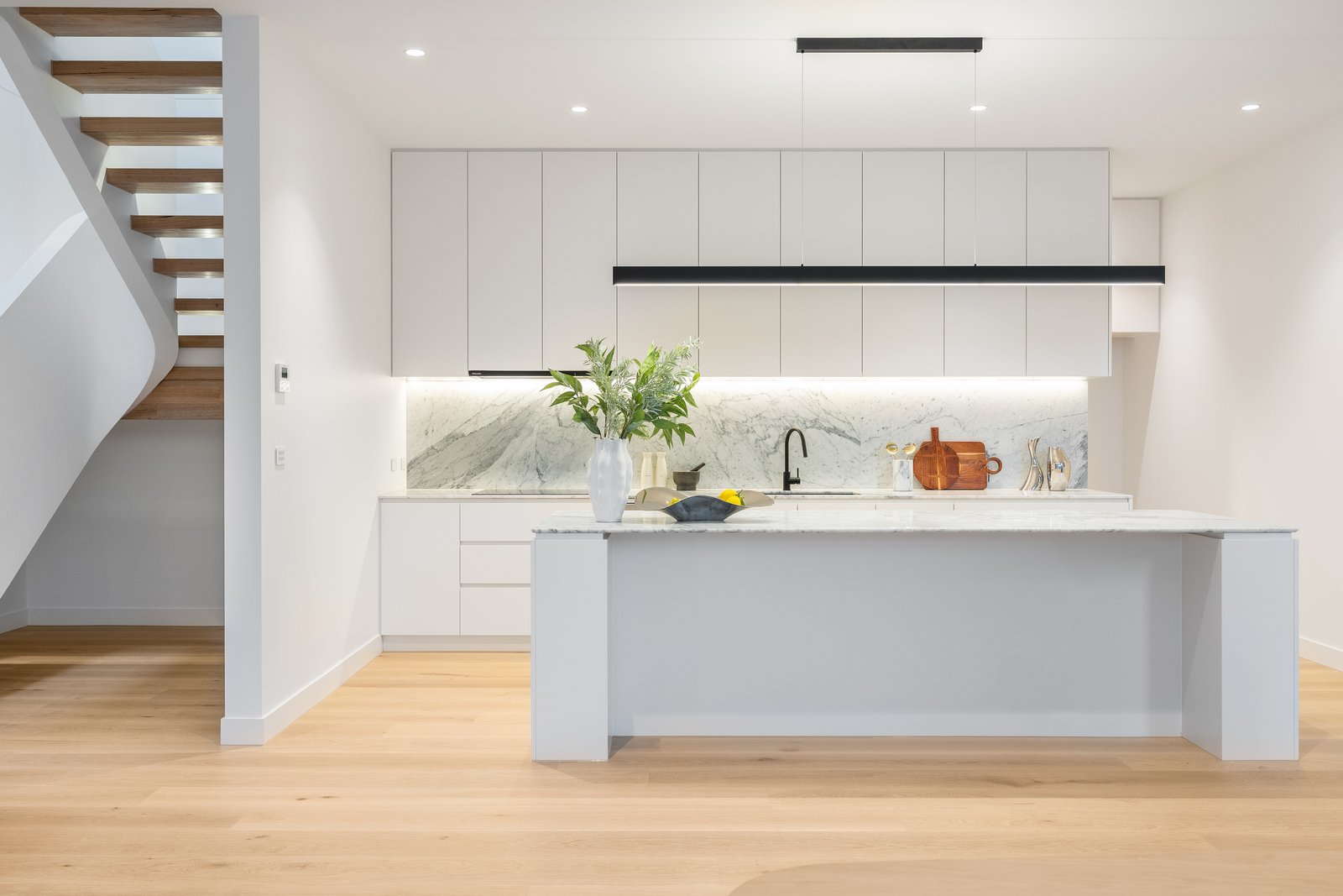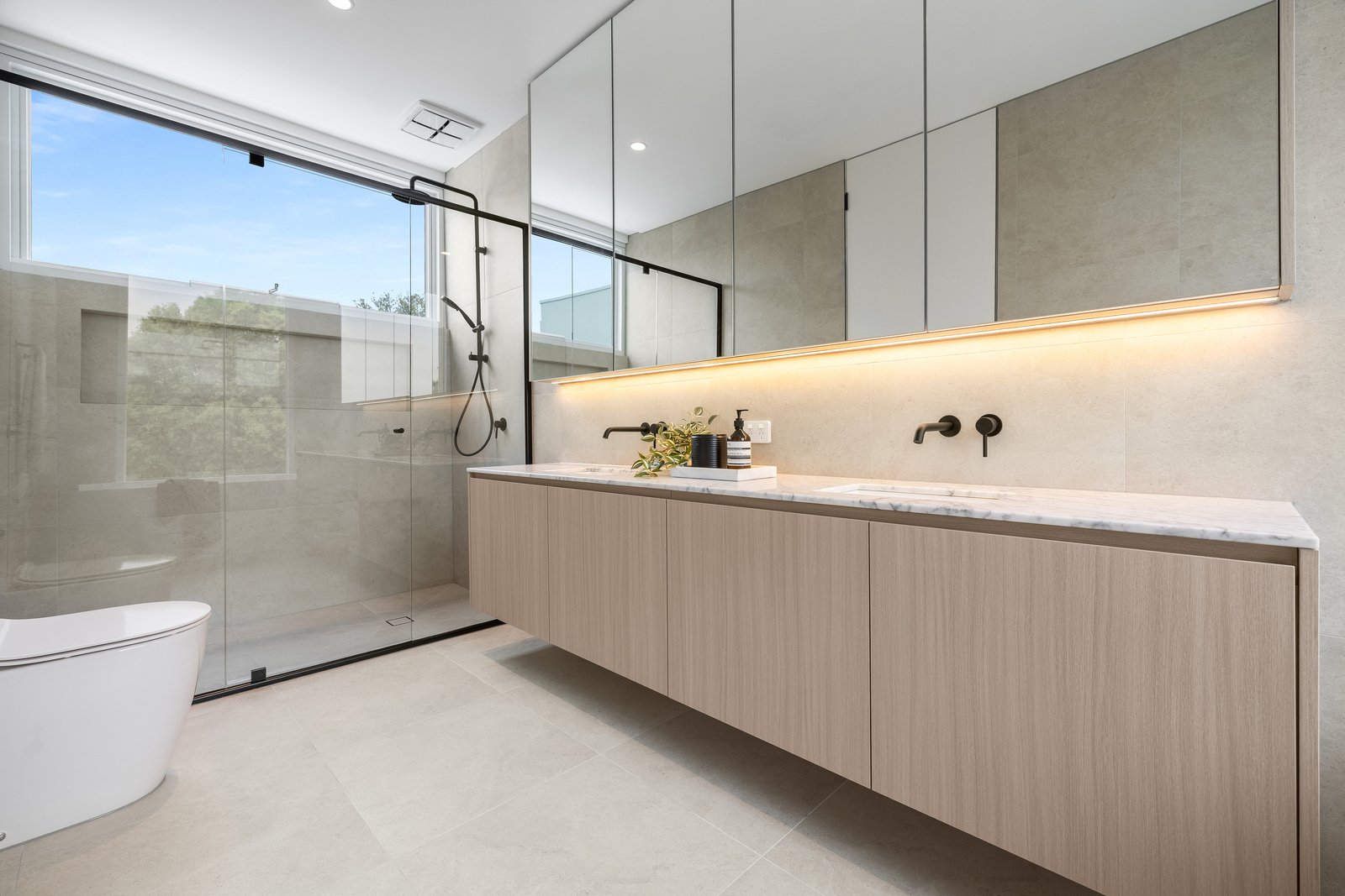 Immensely accommodating with a fully-tiled ensuite for every bedroom, and a mix of full-height built in and walk-in robes for all, the home’s most plushly private space is retained for parental privacy - with a full-depth master domain (with window-walled bedroom, dressing-room and dual-vanity ensuite with freestanding bath) encompassing an entire third of the upper-level floorspace. Crafted with no expense spared, the home’s interior curation includes natural Italian marble for every benchtop (even the laundry), Scandi-style light Oak floors, the softest wool loop-pile carpets, and the finest detail including light Oak-style cabinetry and concealed cistern WCs.
