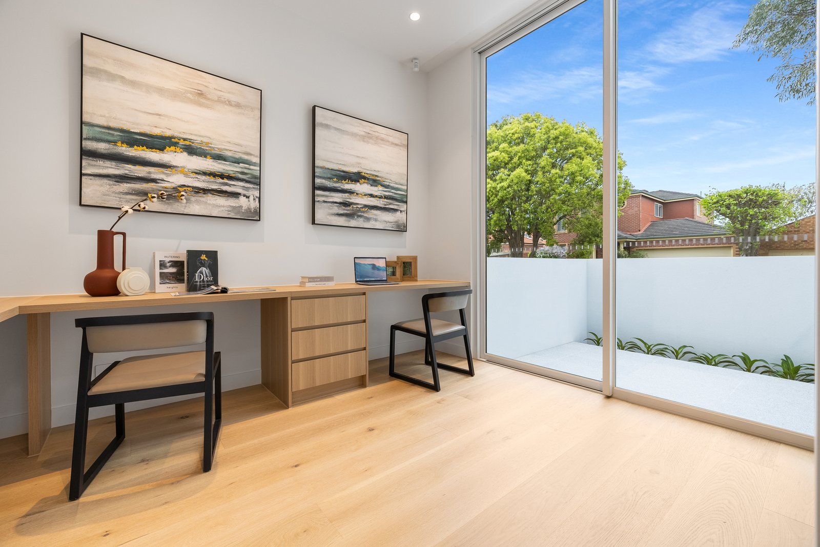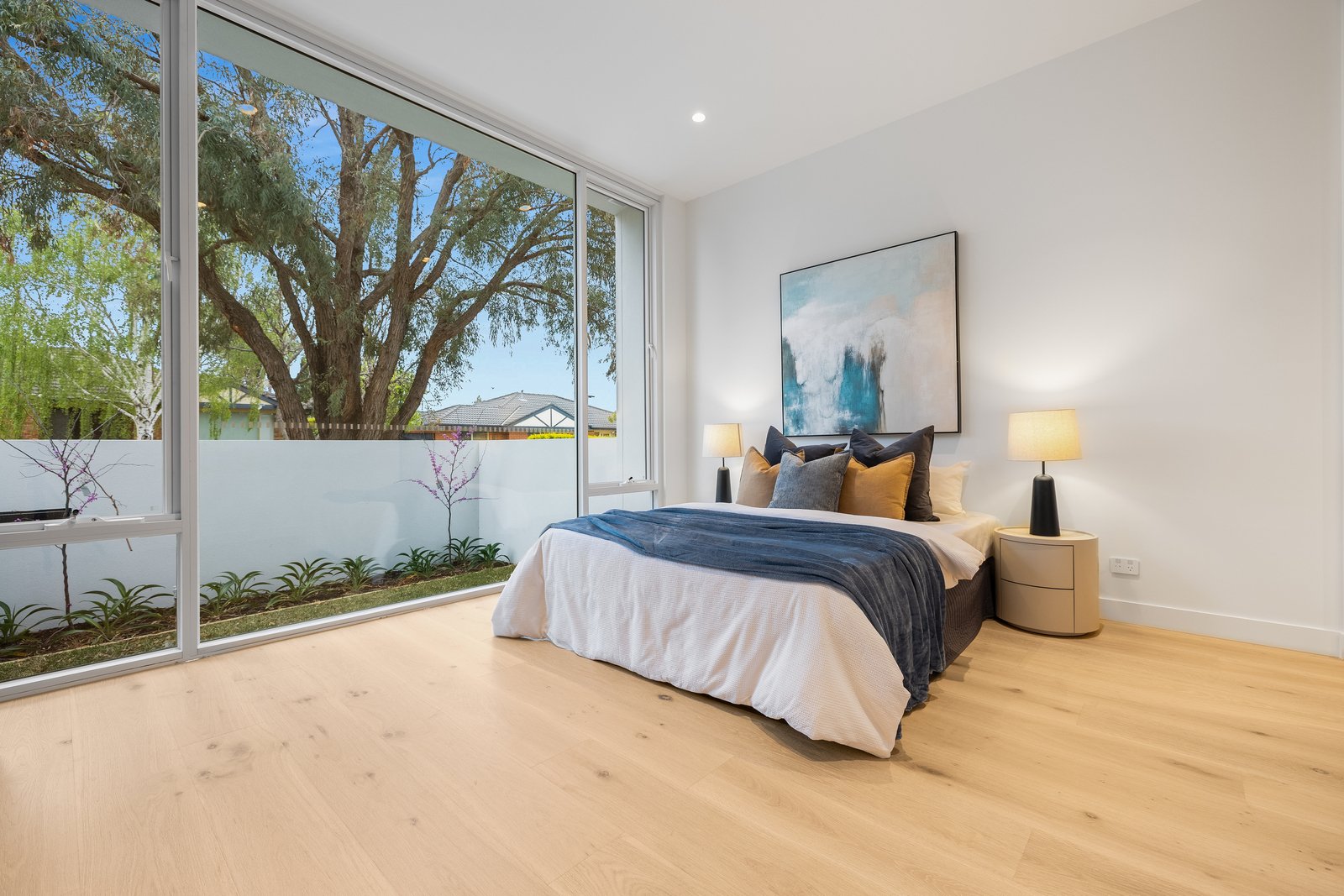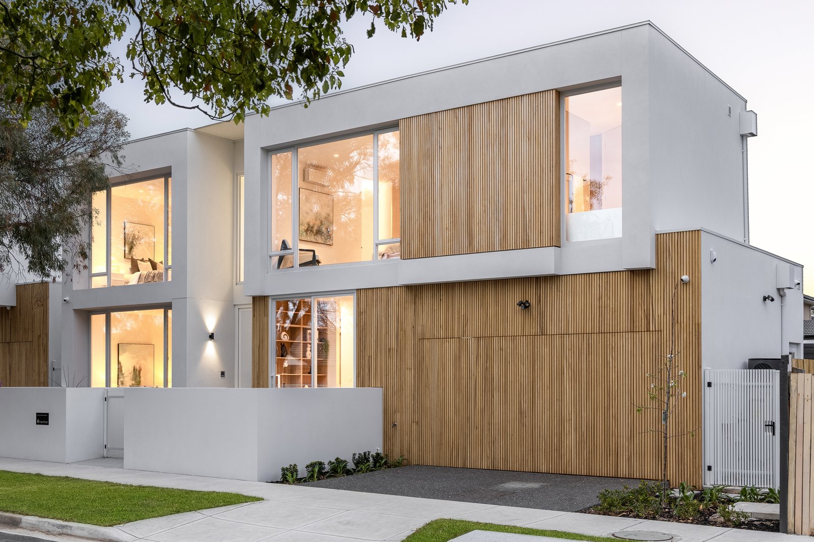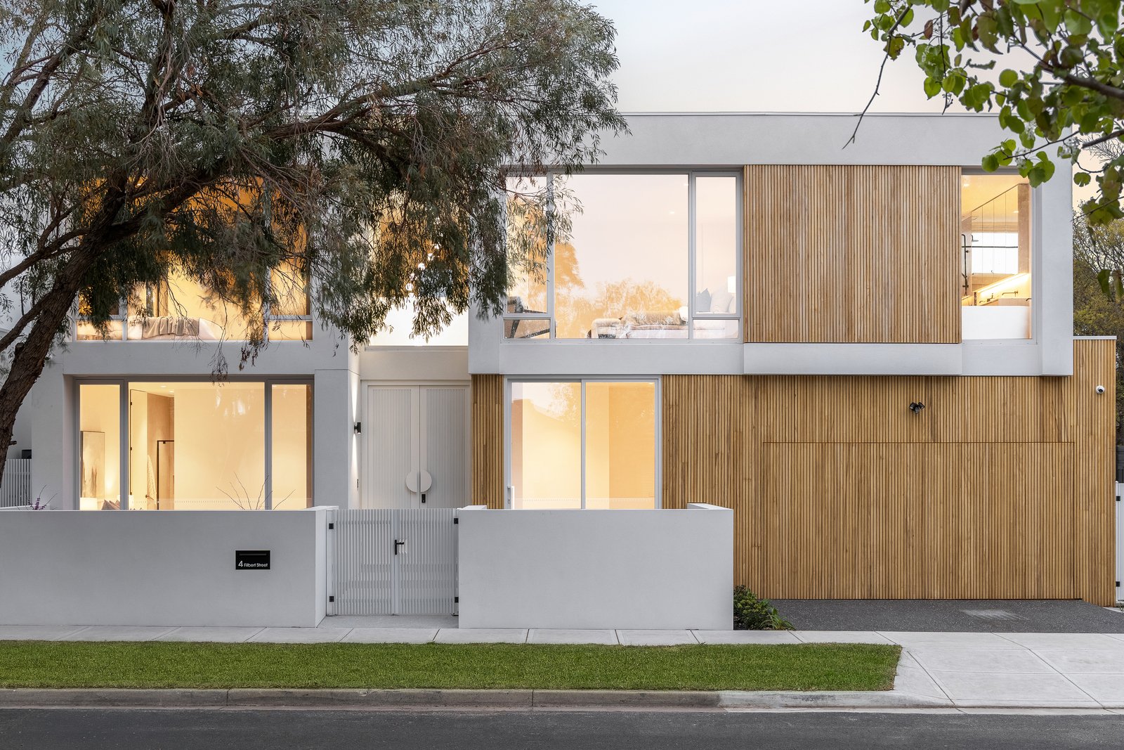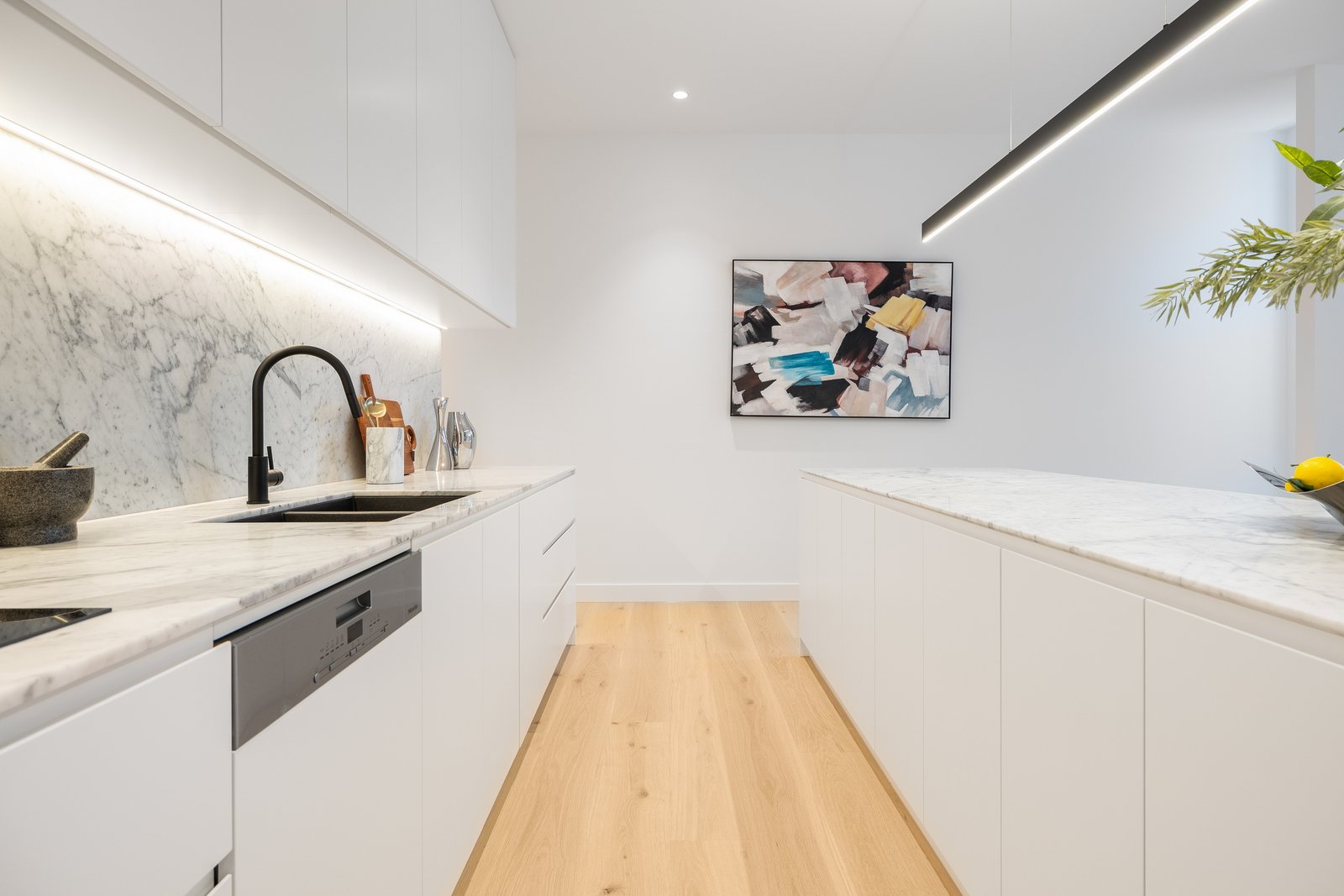 Immensely accommodating with a fully-tiled ensuite for every bedroom, and a mix of full-height built in and walk-in robes for all, the home’s most plushly private space is retained for parental privacy - with a full-depth master domain (with window-walled bedroom, dressing-room and dual-vanity ensuite with freestanding bath) encompassing an entire third of the upper-level floorspace. Crafted with no expense spared, the home’s interior curation includes natural Italian marble for every benchtop (even the laundry), Scandi-style light Oak floors, the softest wool loop-pile carpets, and the finest detail including light Oak-style cabinetry and concealed cistern WCs.