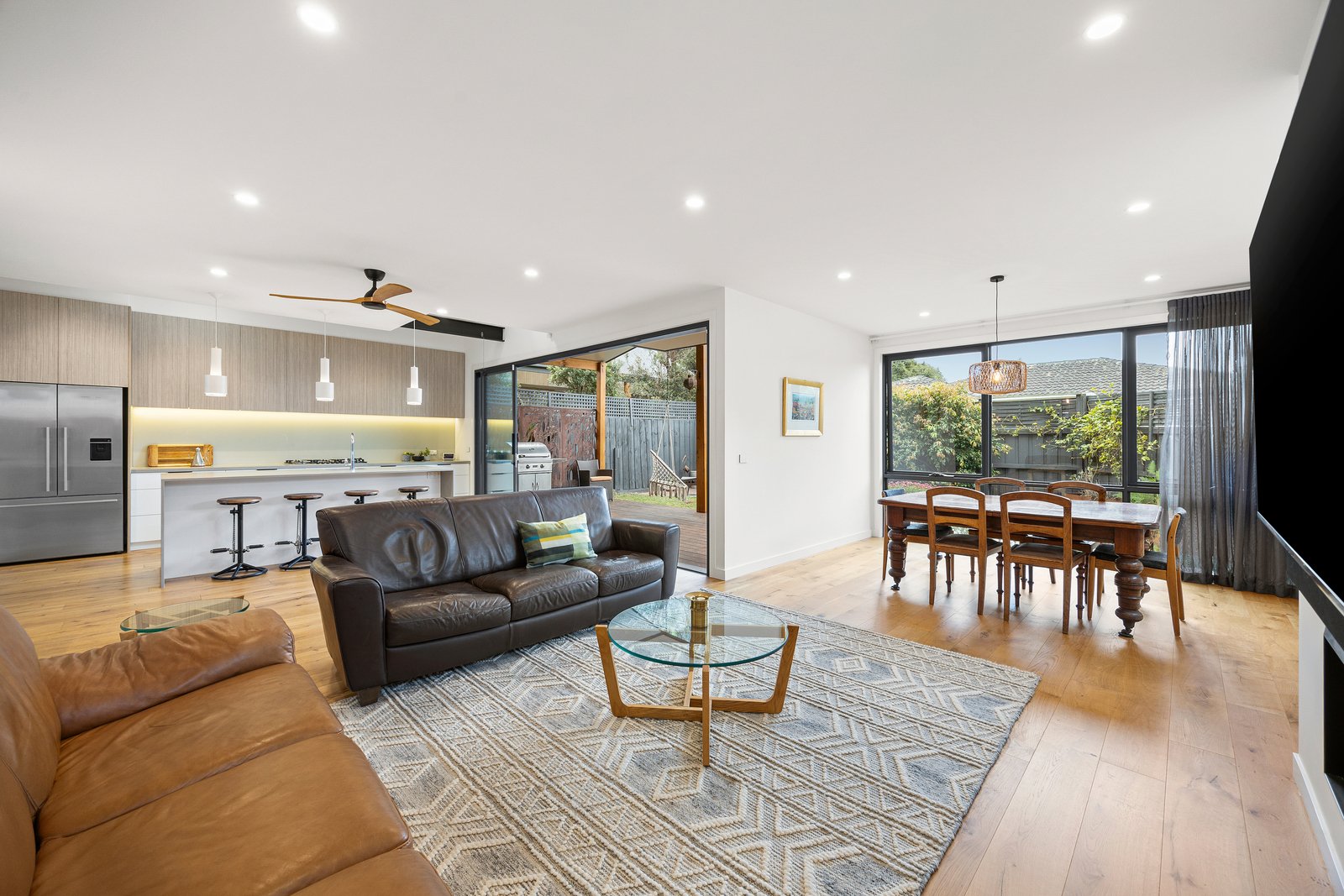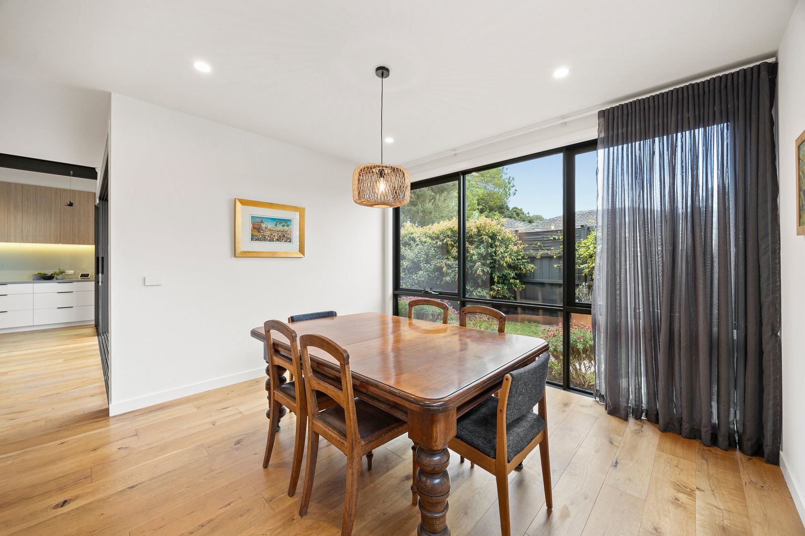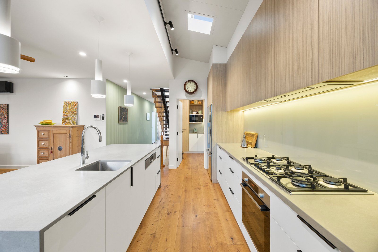 Inside, wide engineered oak floors ground interiors of generous scale, where the living and dining domain is illuminated by northern light and centred on the warmth of a landscape fireplace.