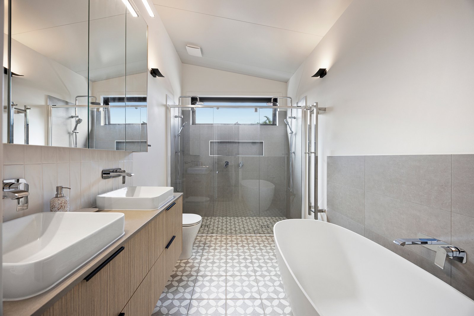 On the upper level, a retreat captures the western sun, with three bedrooms set beneath soaring raked ceilings - led by a master suite with a designer dressing room and a luxurious ensuite complete with twin vanities, a double shower and deep soaker tub. Two additional bedrooms feature mirrored robes and share a family bathroom, while a ground-floor study adds flexibility.