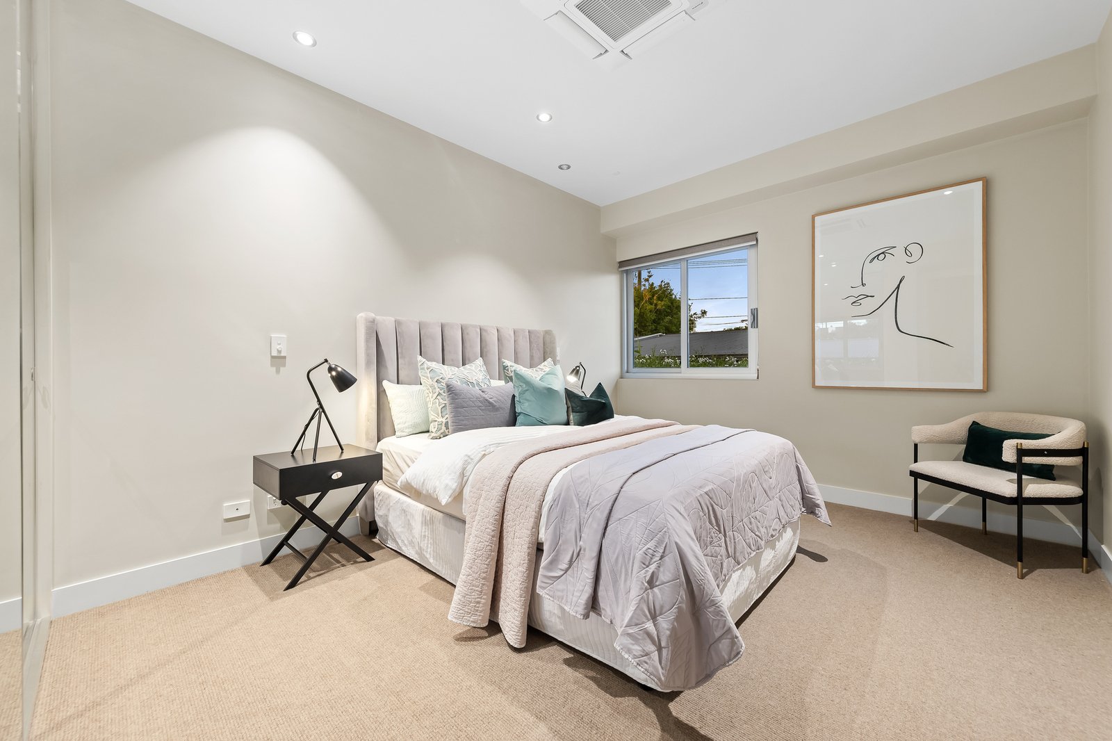 Step into the open-plan living and dining zone with soaring ceilings and exquisite wide oak floors that flow effortlessly to the generous balcony, perfect for savouring your morning coffee with the beauty of Port Phillip Bay views. The gourmet stone kitchen, designed to elevate your culinary experience, showcases premium Miele appliances, ample storage, and a stunning waterfall-edged island bench with a breakfast bar.