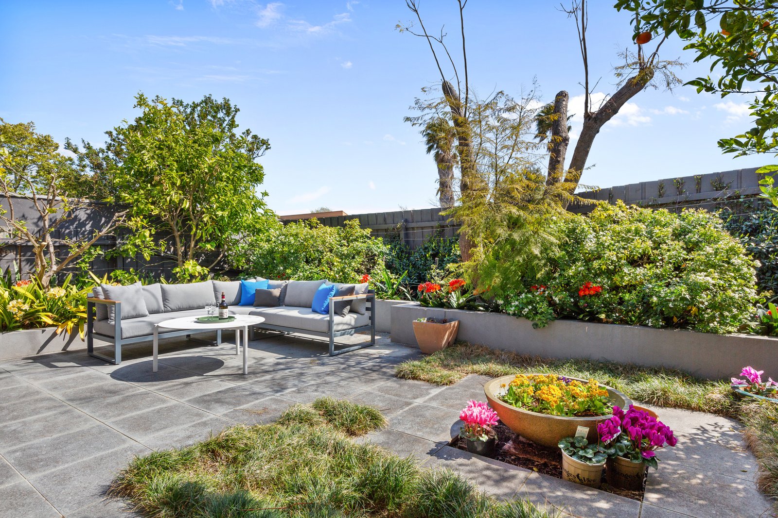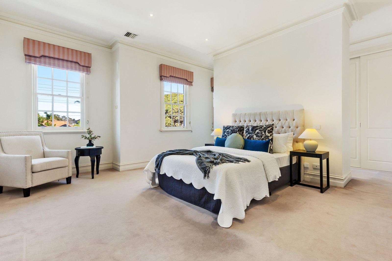 Bathed in natural light beneath soaring 3m ceilings, the dual living design caters to every occasion. A formal lounge and dining domain, warmed by a gas log fireplace, provides a superb space for family gatherings, while an informal living zone extends to a columned terrace and north-west courtyard, offering a private sanctuary for al fresco entertaining. Appointed for both scale and style, the granite kitchen features an island bench/casual meals area, Smeg appliances (700mm oven and integrated dishwasher) and custom cabinetry.