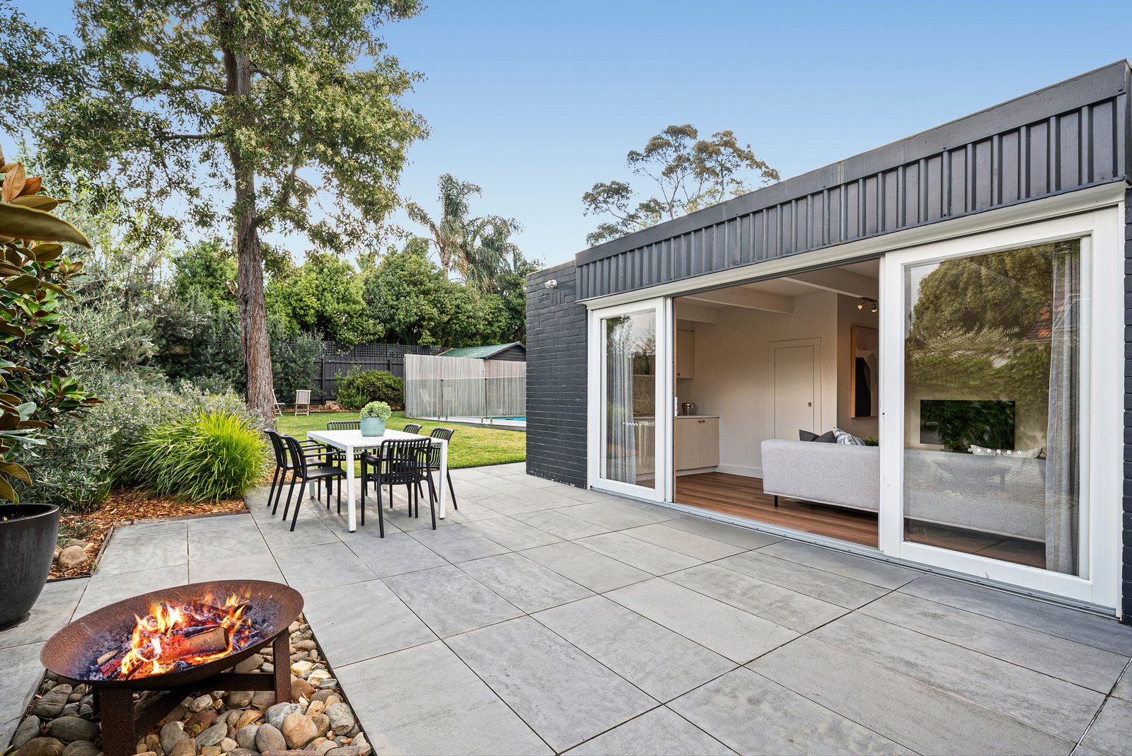 Along the hall, three bedrooms - two with robes, one with a fitted desk - are accompanied by a central bathroom before the home opens to a sun-filled living domain. Here, custom cabinetry and expansive glass sliders extend to a bluestone al fresco terrace, fire pit zone, and gardens where sweeping lawns, mature plantings, and a shimmering pool create a private sanctuary.