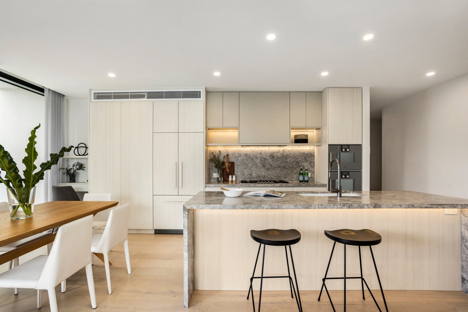 The experience begins in the foyer of this exclusive collection of just nine premium homes, where a signature sculptural staircase sets a striking tone. Beyond, your own gracefully curved entrance hall introduces a north-facing haven, one of only two positioned on the mid-level. Interiors of natural stone, mirrored elements and a pale-oak palette are bathed in light, exuding contemporary sophistication and coastal refinement.