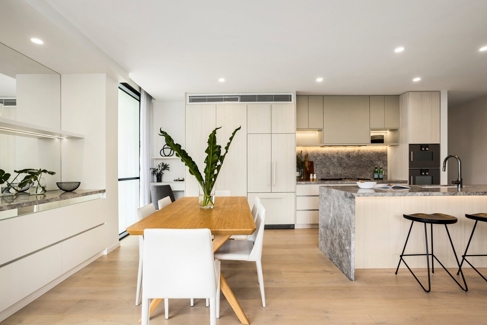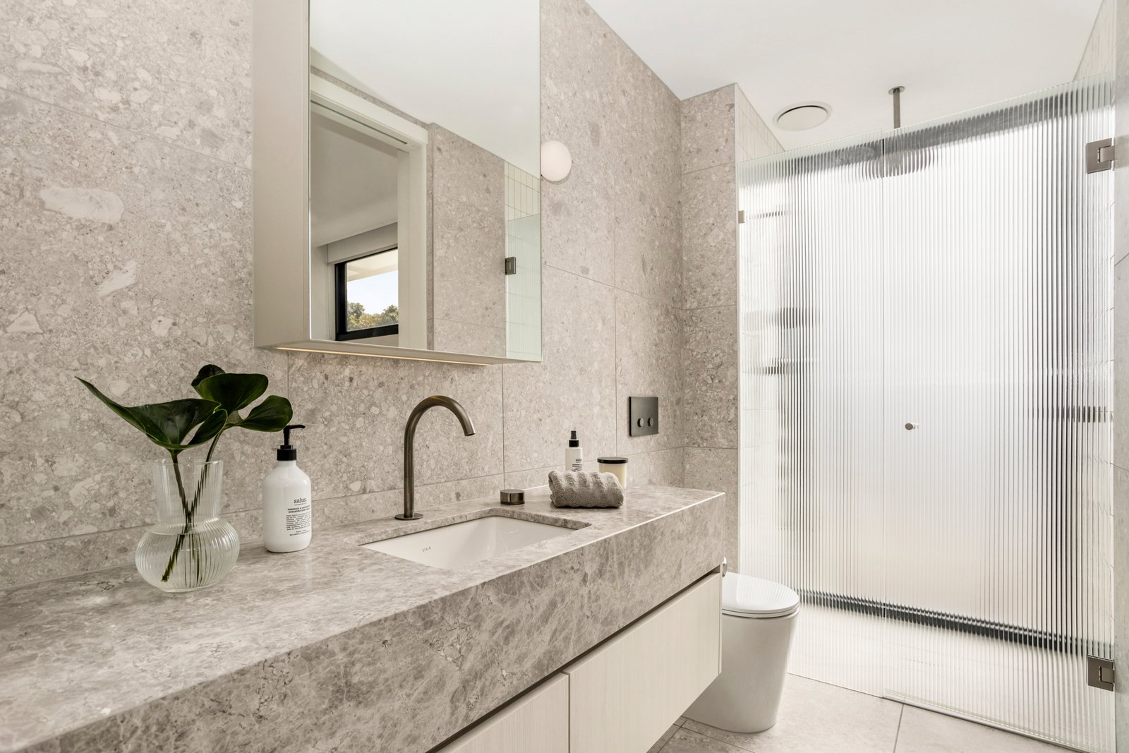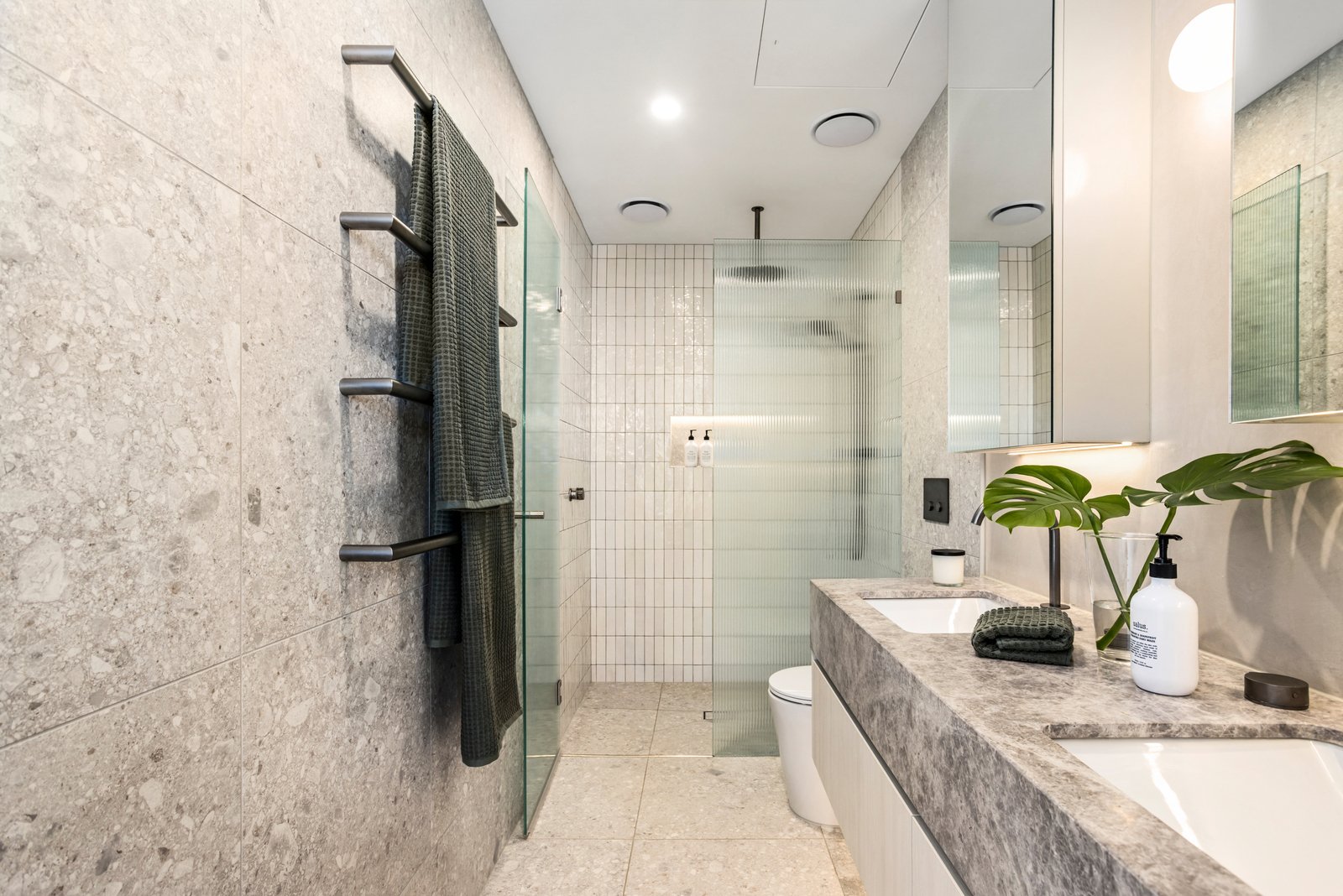 Two distinct accommodation zones deliver rare apartment privacy. The main suite boasts its own entrance hall with custom built-ins, a wall of windows, and a sublime ensuite featuring a stone dual-vanity, dual-head rain shower and heated towel rail. Two further robed bedrooms are served by an equally elegant second bathroom.