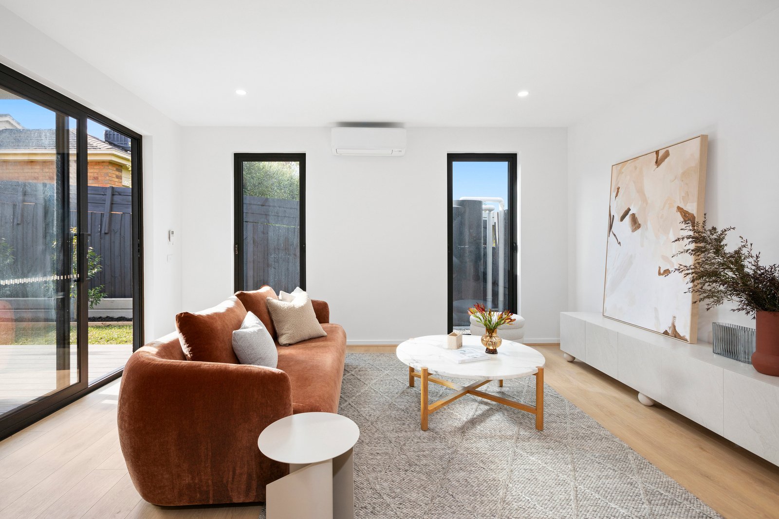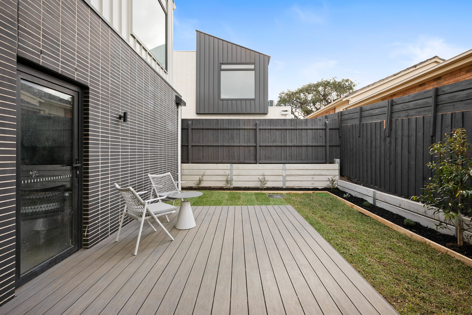 Downstairs, discover a designer kitchen with prestige and integrated German Bosch appliances, sleek 40mm stone surfaces and striking statement lighting. Here, an open plan living/dining zone spills seamlessly outside to the private and sundrenched courtyard where a weatherproof and composite Ekodeck makes open-air entertaining easy.