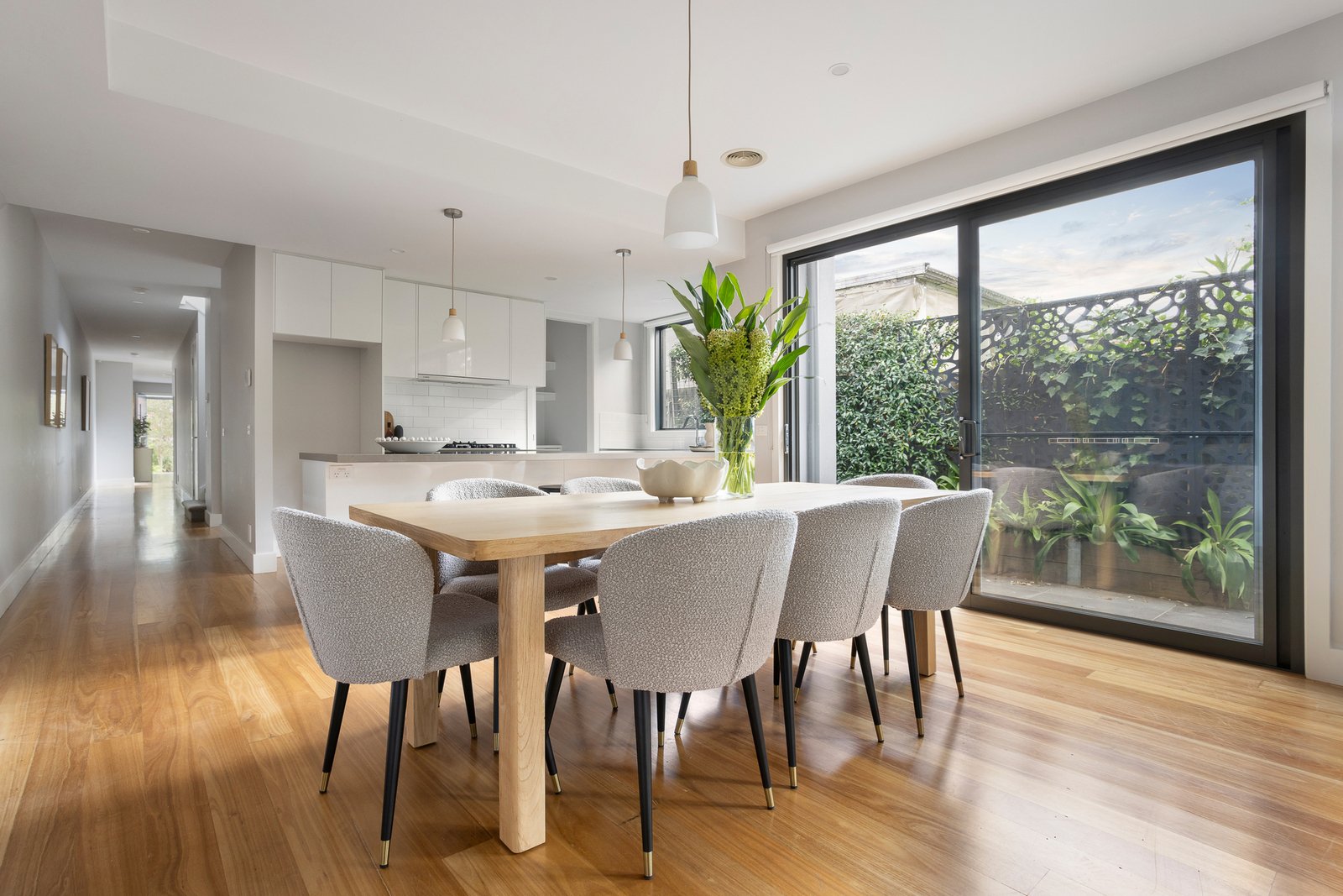 An inviting entrance hall featuring timber floors flows through to a gourmet...