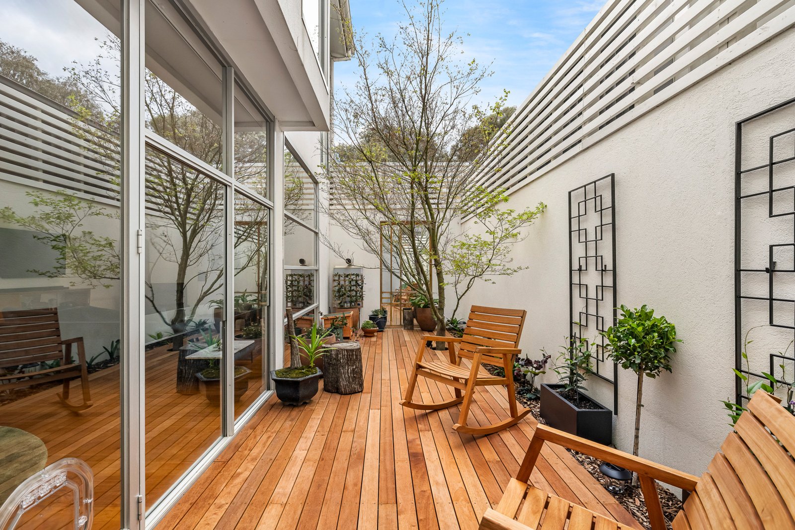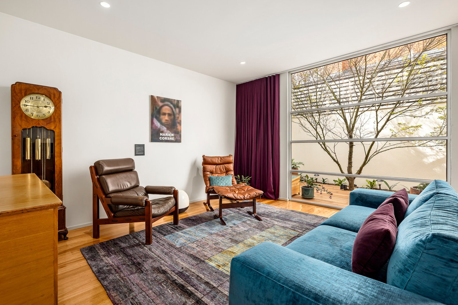 The open plan living and dining domain is anchored by a sophisticated contemporary kitchen, where stone surfaces exude elegance while delivering everyday durability. Premium Miele appliances, including a gas cooktop, and abundant integrated storage enhance both form and function. A private garden offers a tranquil retreat and a natural extension of the living space, perfect for relaxing or entertaining.