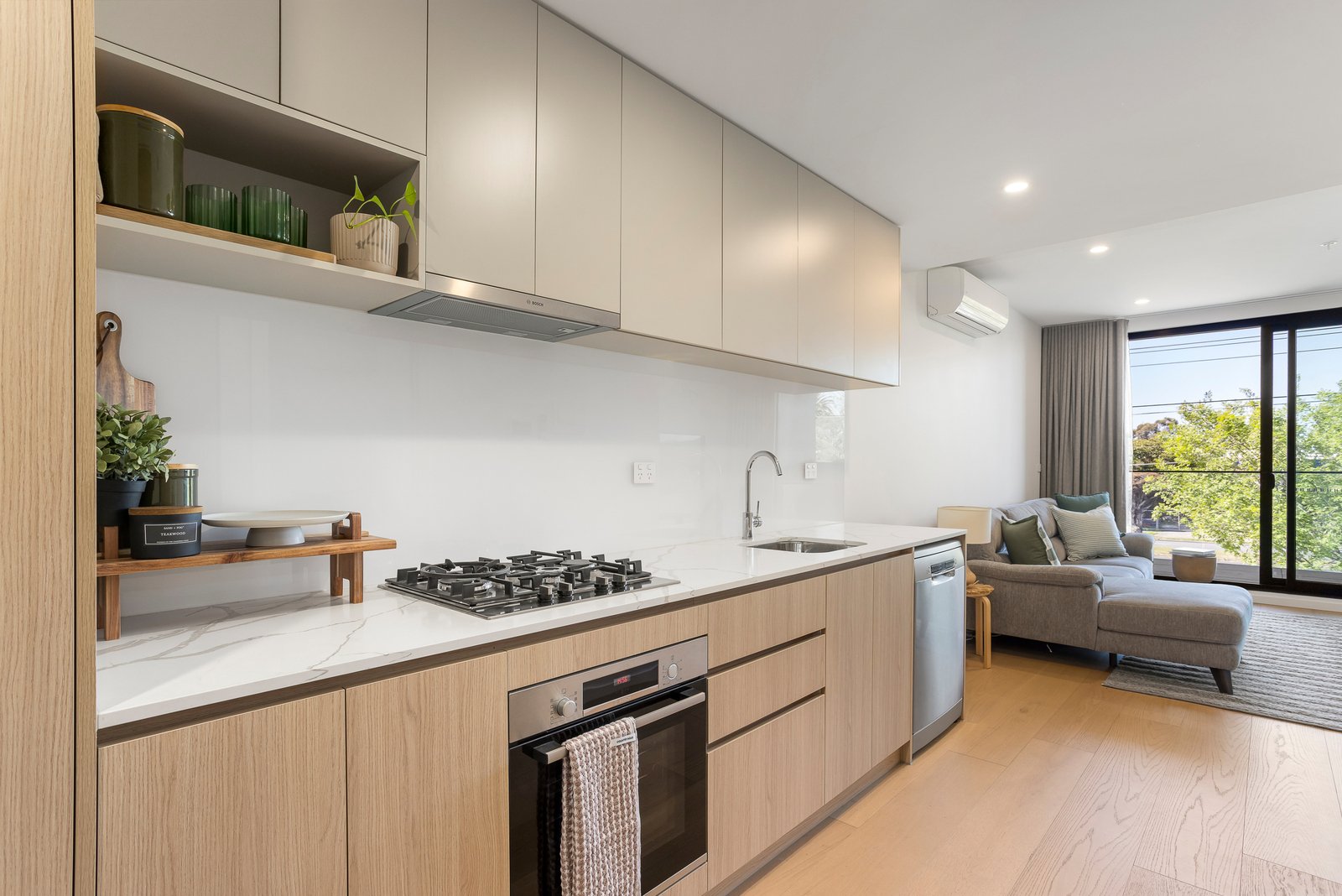 The kitchen is well designed with stone benchtops, stainless steel appliances, and plenty of storage, making everyday cooking easy. The bedroom is generous and features built-in robes and room for a study nook. The bathroom is sleek and fully tiled, and there’s also a European laundry neatly tucked away.