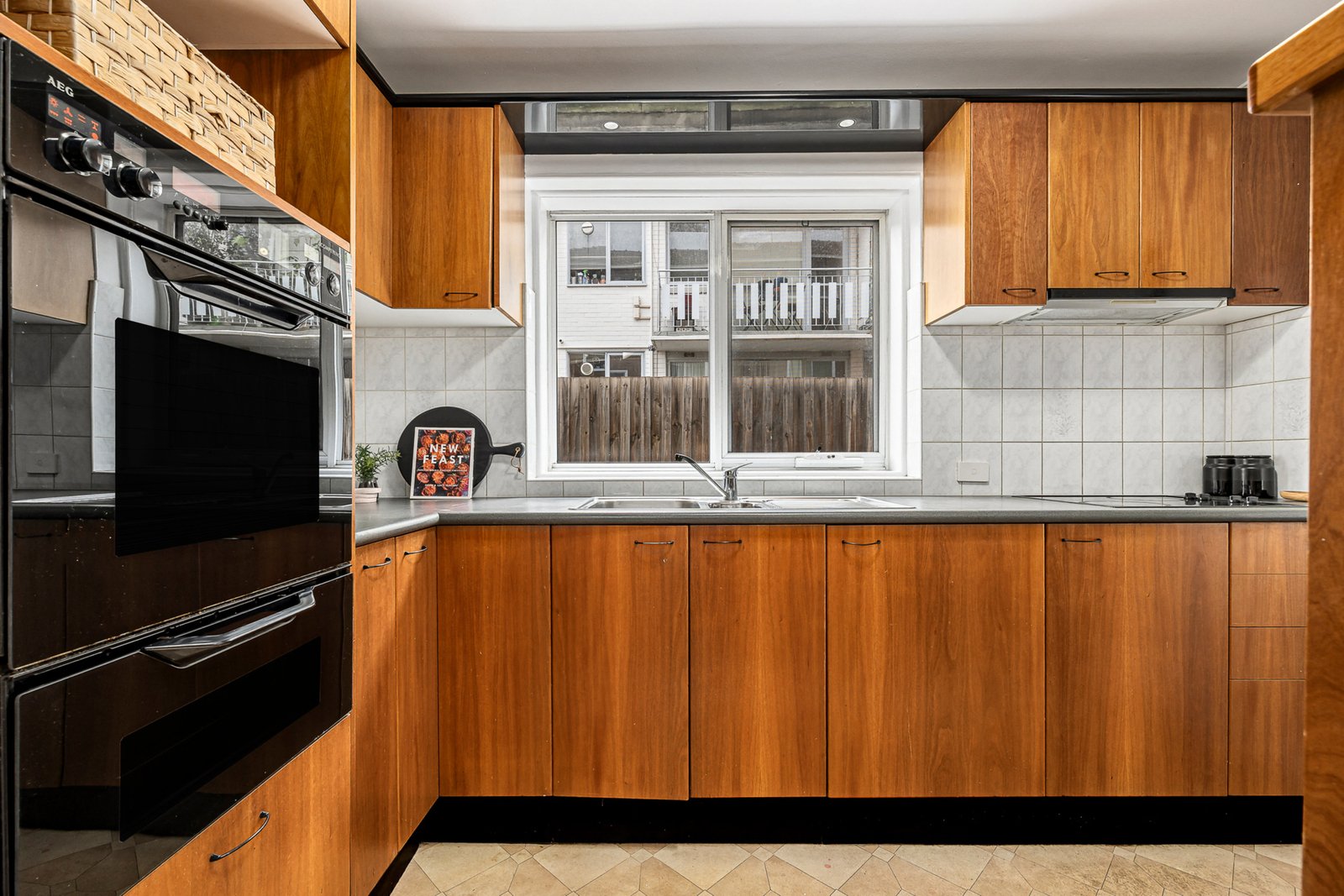 Attracting natural light with ease through a row of picture windows, spacious open-plan living and dining is superbly serviced by a separate kitchen and meals area featuring cafe-style bench seating, ample storage space, a wall oven, and an easy-clean AEG electric cooktop.