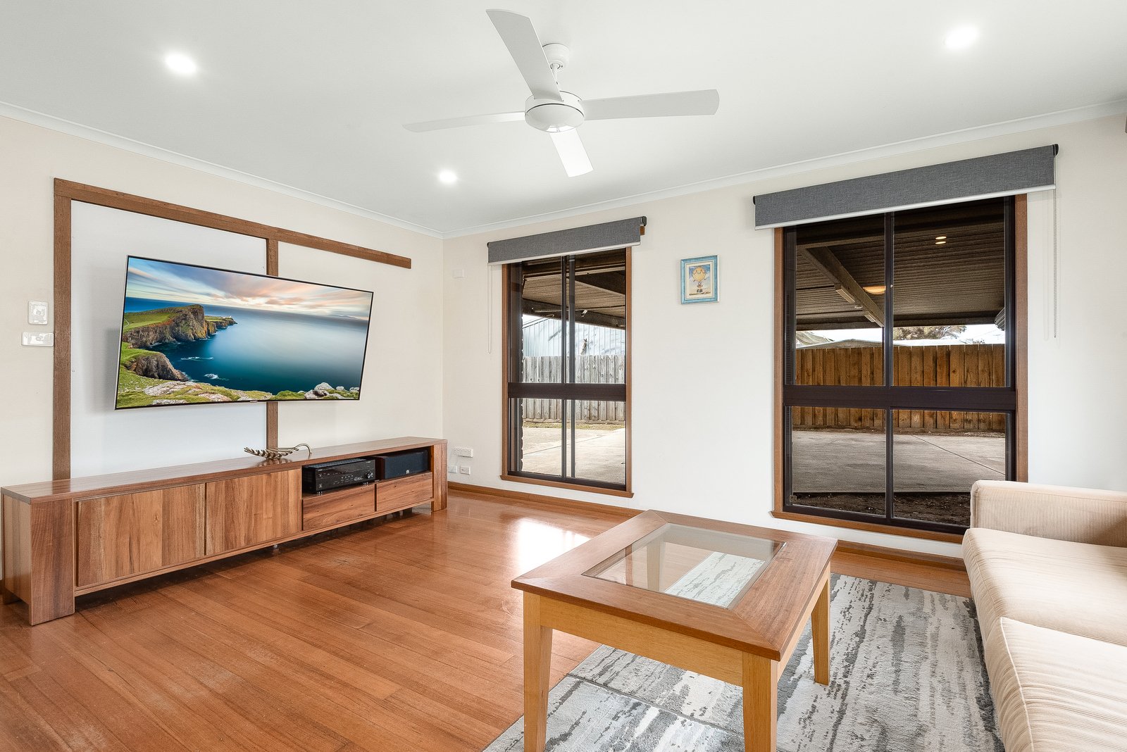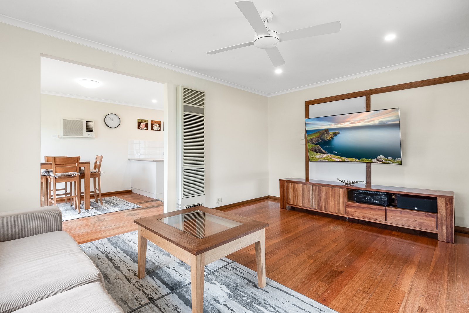 Set behind a high fence, the home enjoys a private setting. Inside, polished timber floors and light neutral interiors introduce the tasteful theme within. At the heart of the home, the updated kitchen features modern cabinetry, quality appliances including 900mm freestanding oven and cooktop, rangehood, dishwasher, ample bench space and generous storage. The open plan layout flows through to the adjoining dining area and spacious lounge, creating a functional space for everyday living and easy entertaining.
