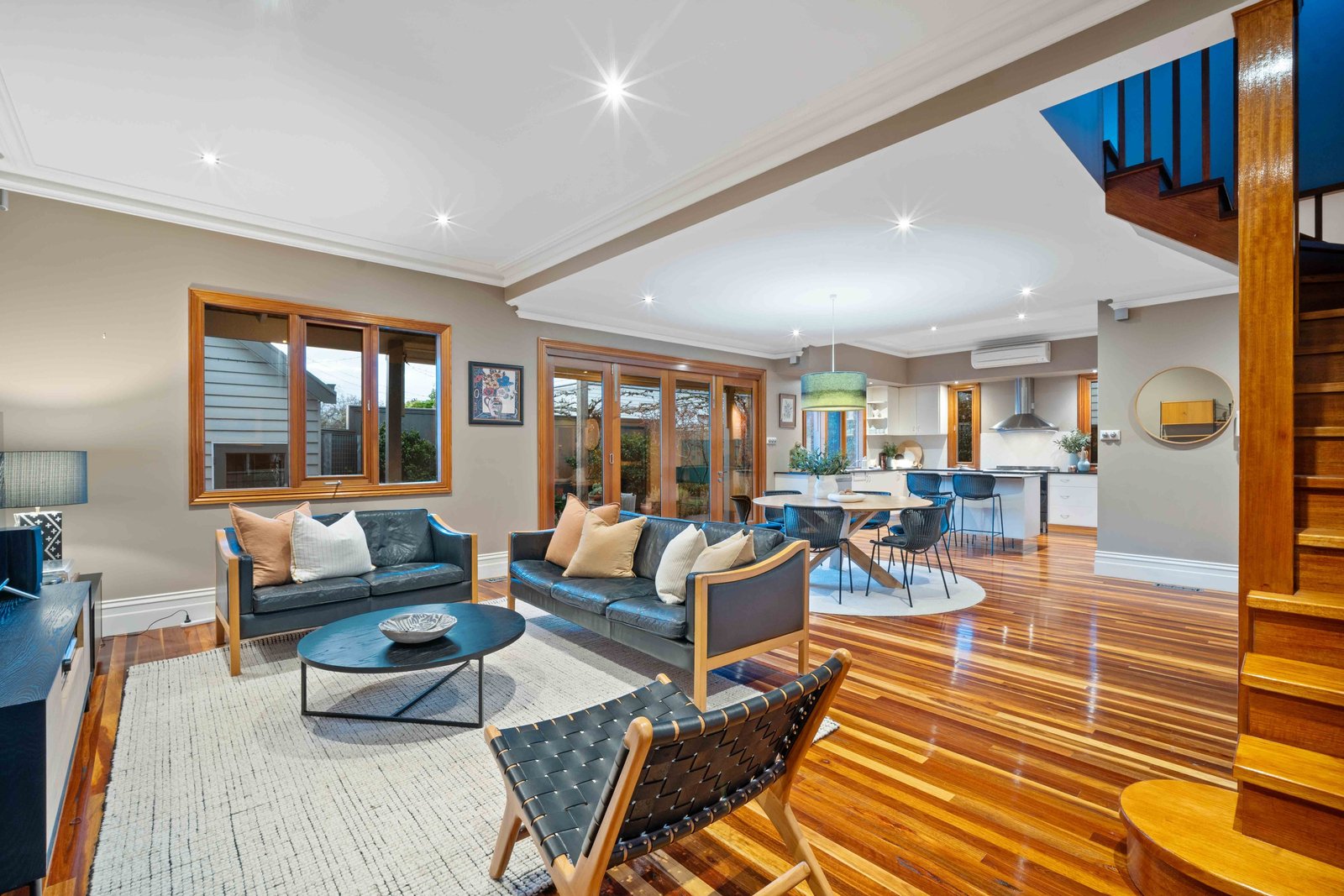 A decorative facade with a beautiful cottage garden set the scene. Step into a world where beauty meets modern family living with an abundance of natural light. The four generously proportioned bedrooms, the main with ensuite, boast walk-in robes and generous storage. The central bathroom with spa bath, heated towel rail and underfloor heating ensures day-to-day comfort. A powder room and separate laundry with adjoining linen press, drying cupboard and storage add practical convenience.